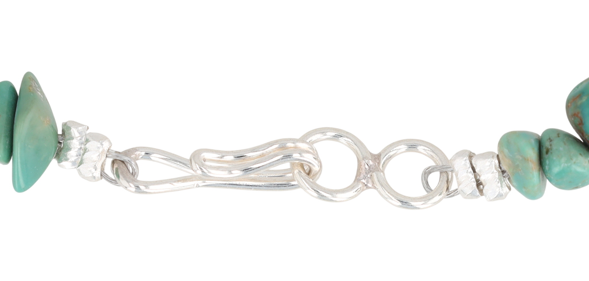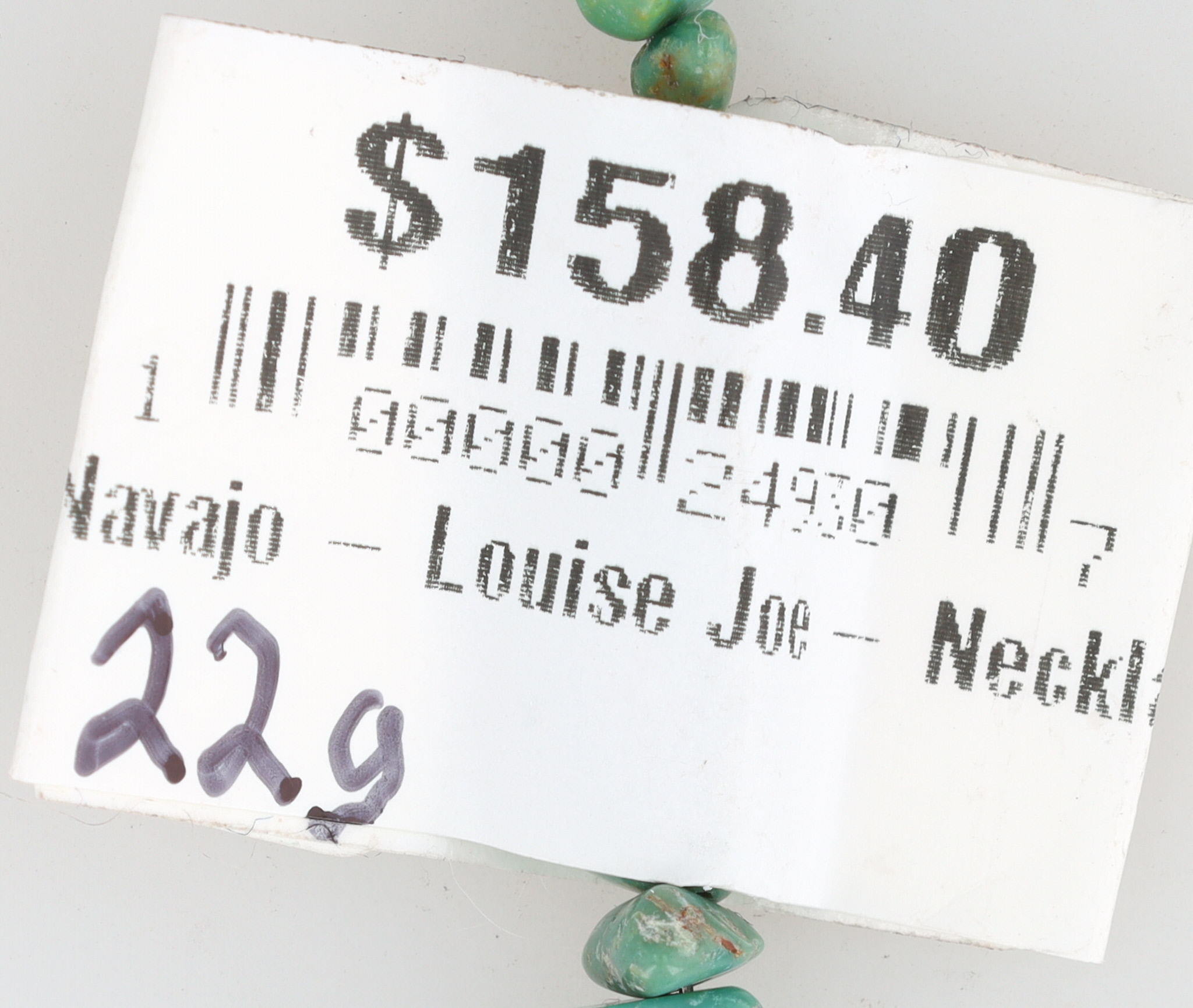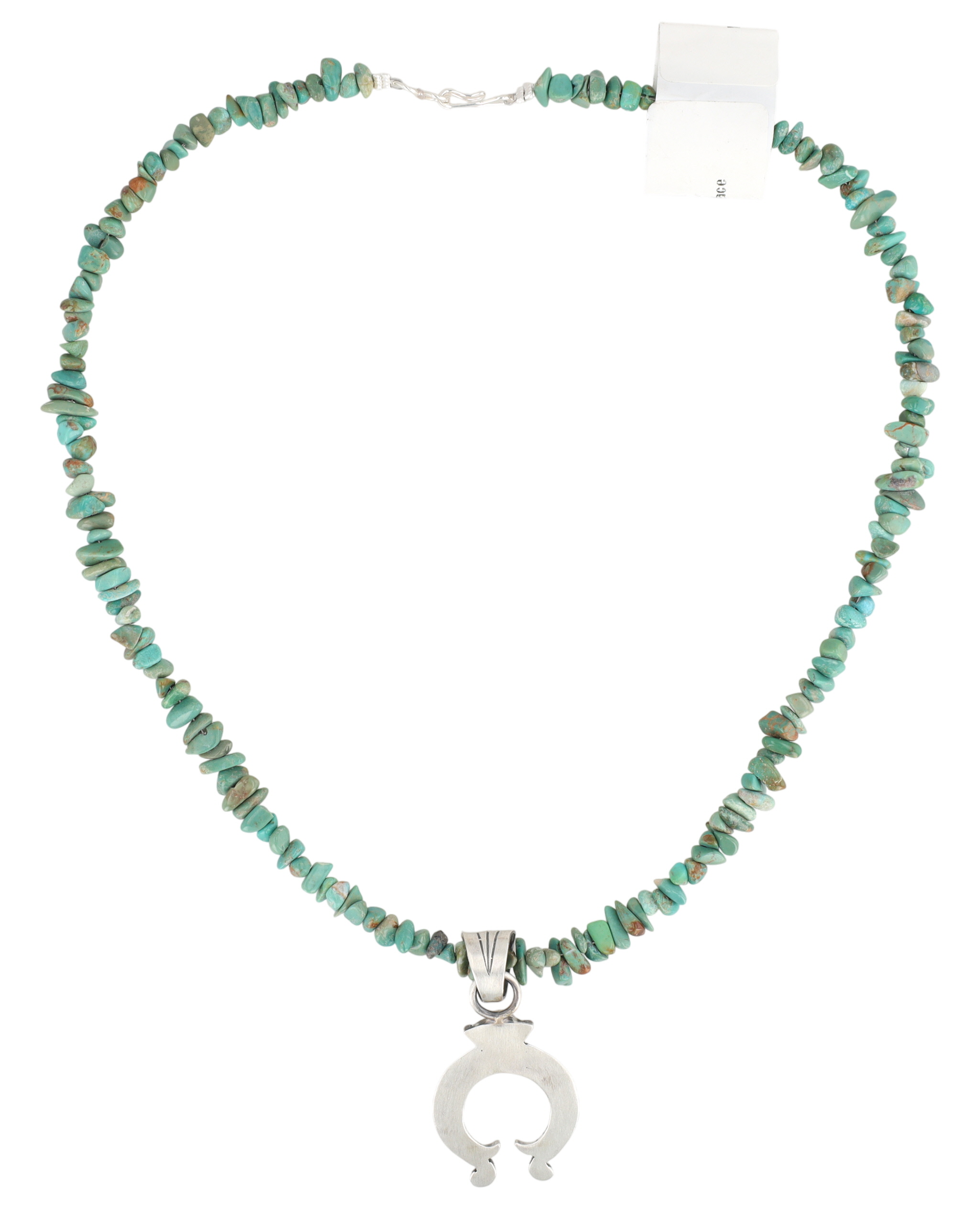 A turquoise chip bead necklace with a sterling Naja pendant set with a central turquoise stone and etched designs, identified as Navajo by Louise Joe, approximately 16 inches long.