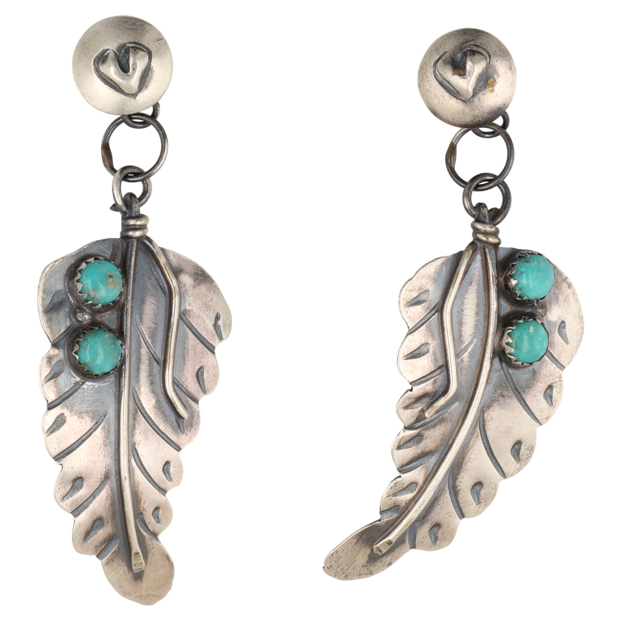 A pair of Gabriele Yazzie Navajo handmade sterling silver and Kingman turquoise feather-design dangle earrings, marked ‘G.T.Y. Sterling’ and weighing approximately 10g.