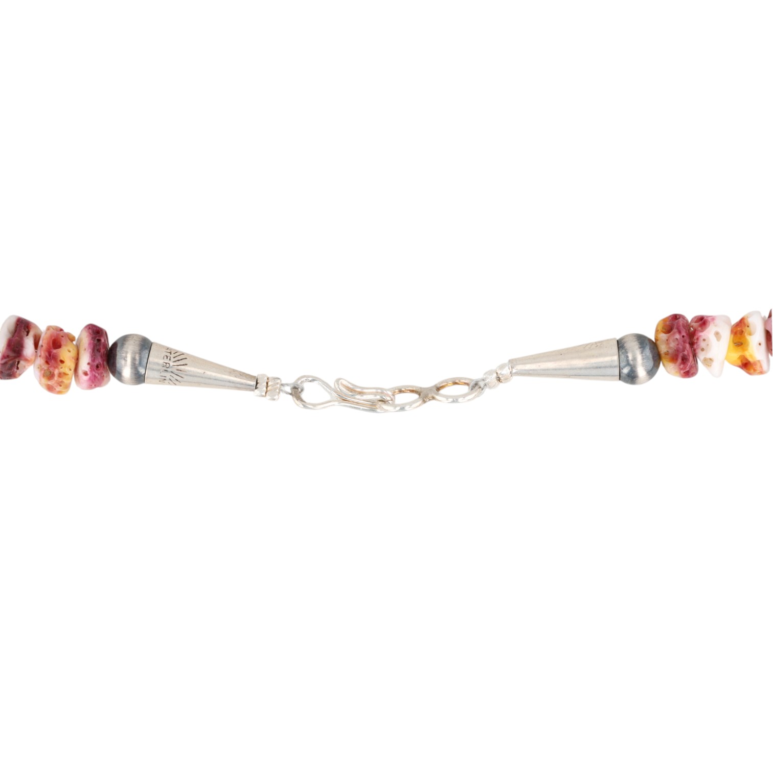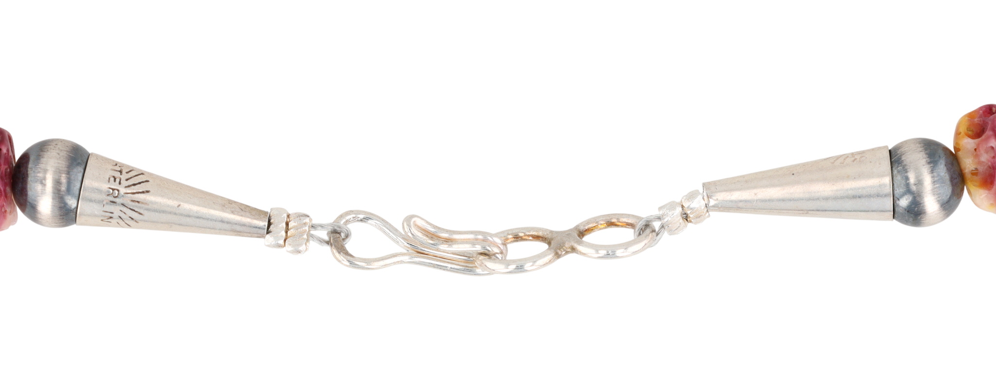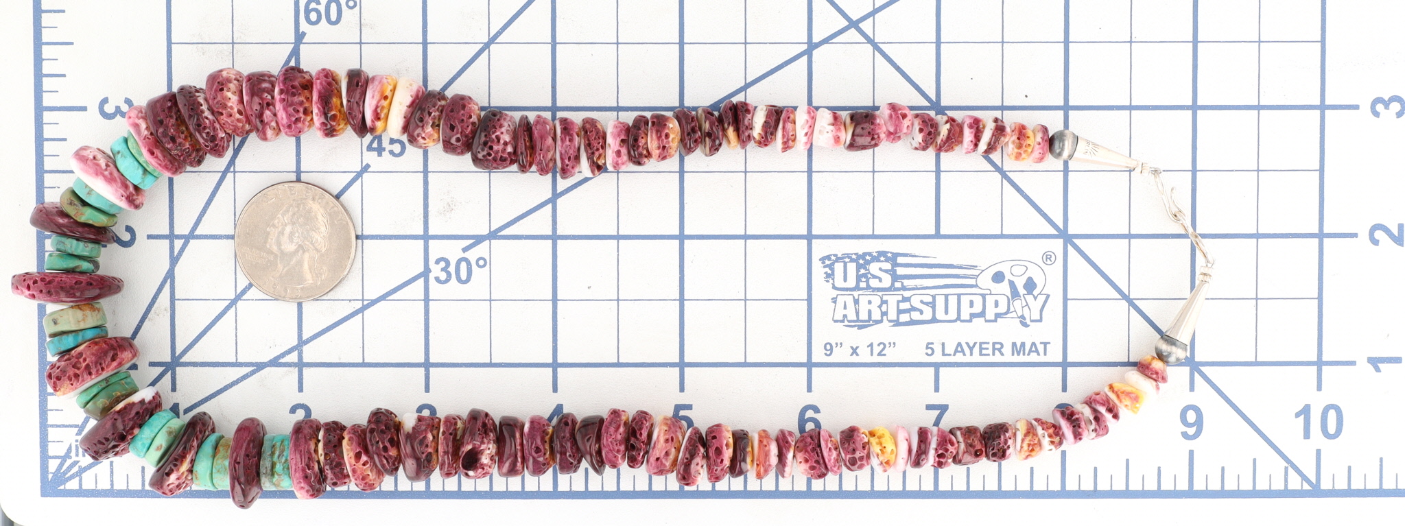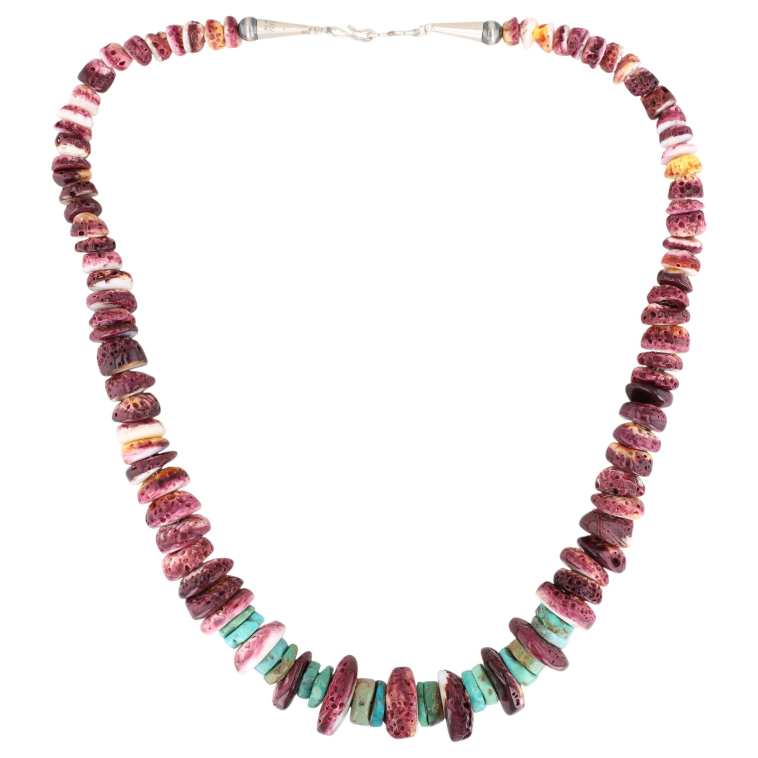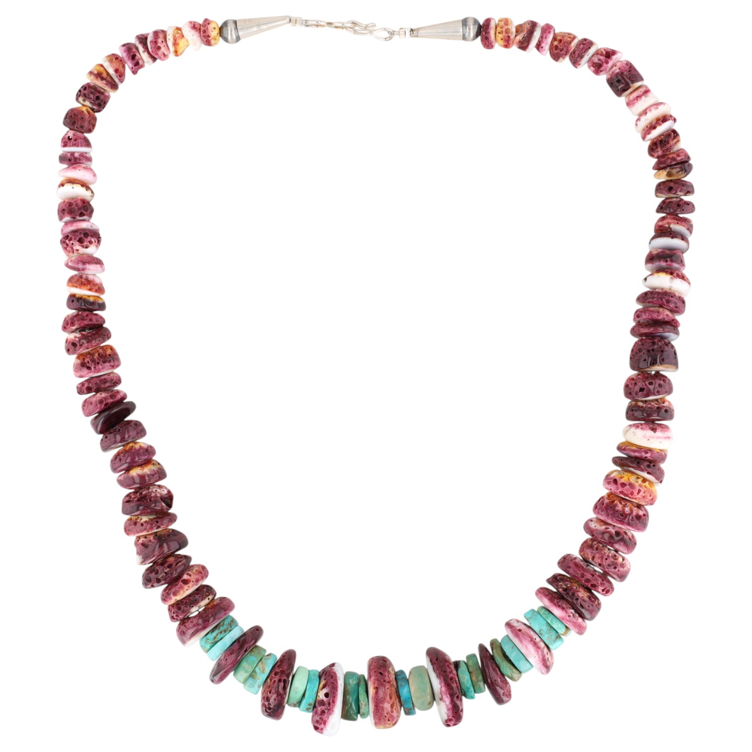 A Navajo necklace featuring purple spiny oyster and turquoise beads, completed with a sterling silver clasp, weighing 80.5g, approximately 19 inches