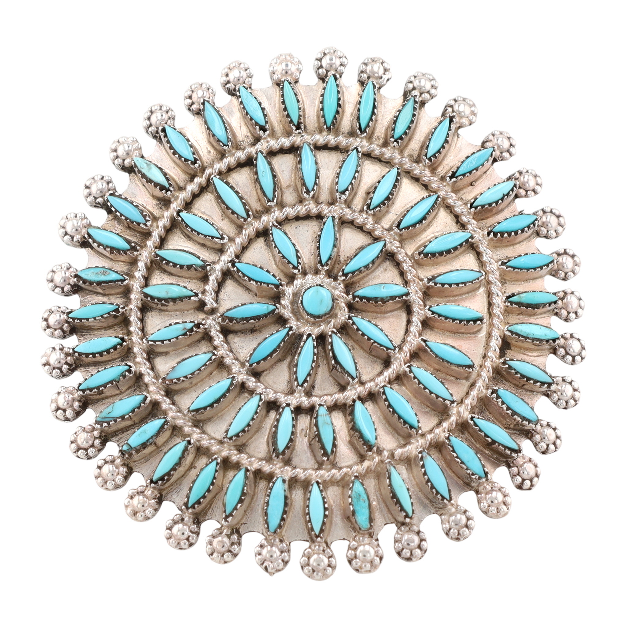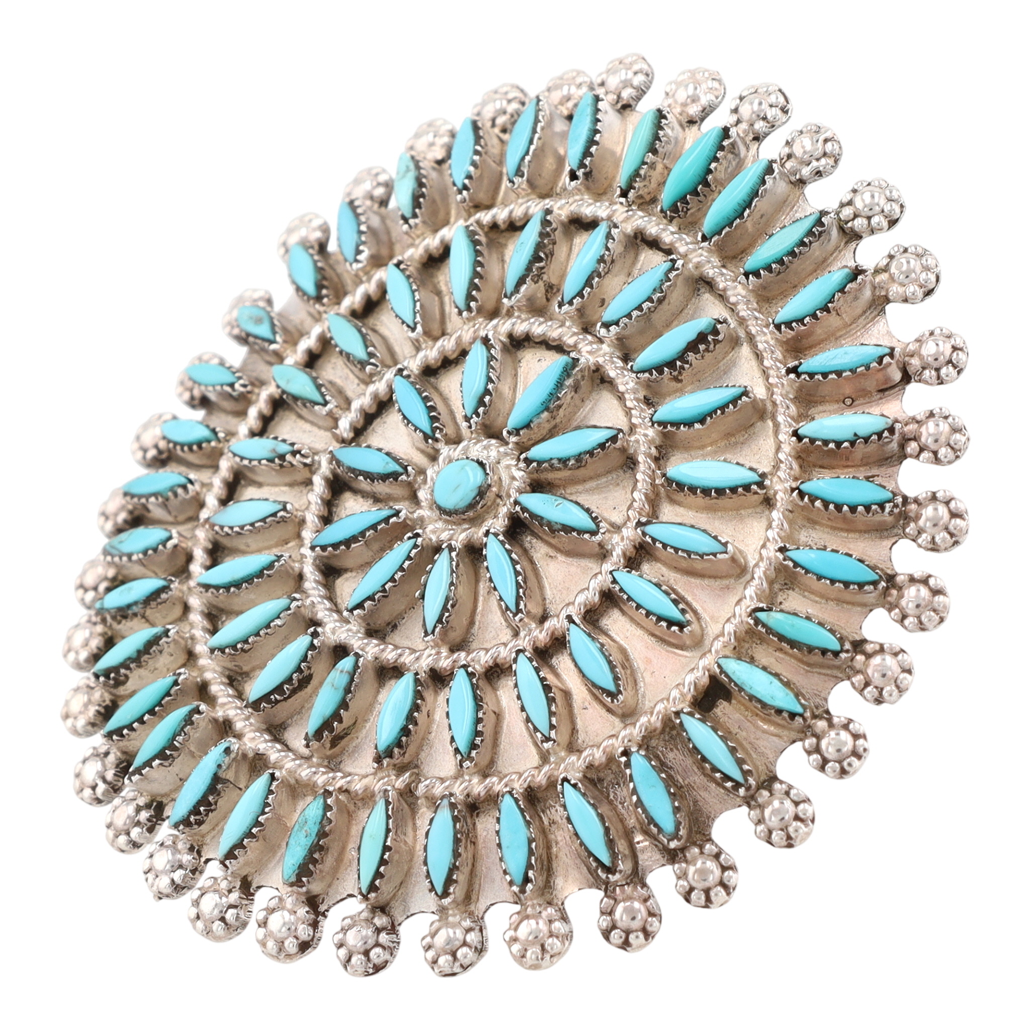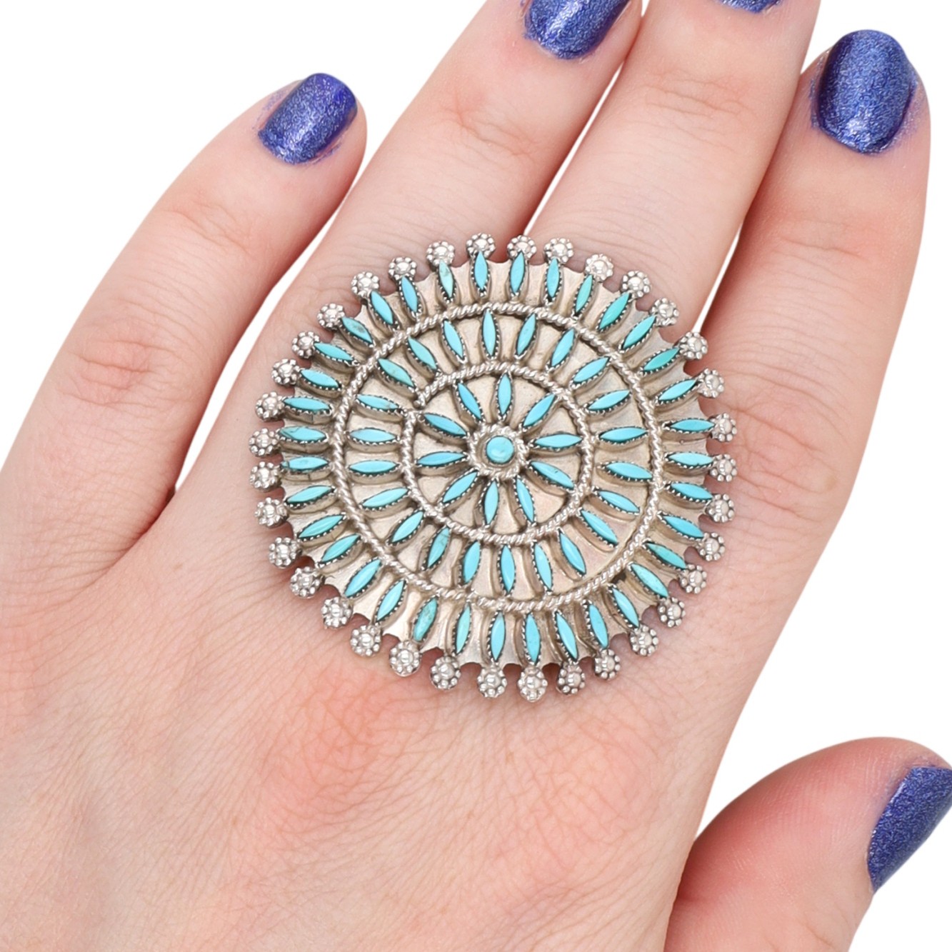 A D&M Chavez Zuni sterling silver ring with numerous light blue/turquoise stones in a large circular cluster pattern, weighing 14g and measuring approximately 2.25 inches in diameter.