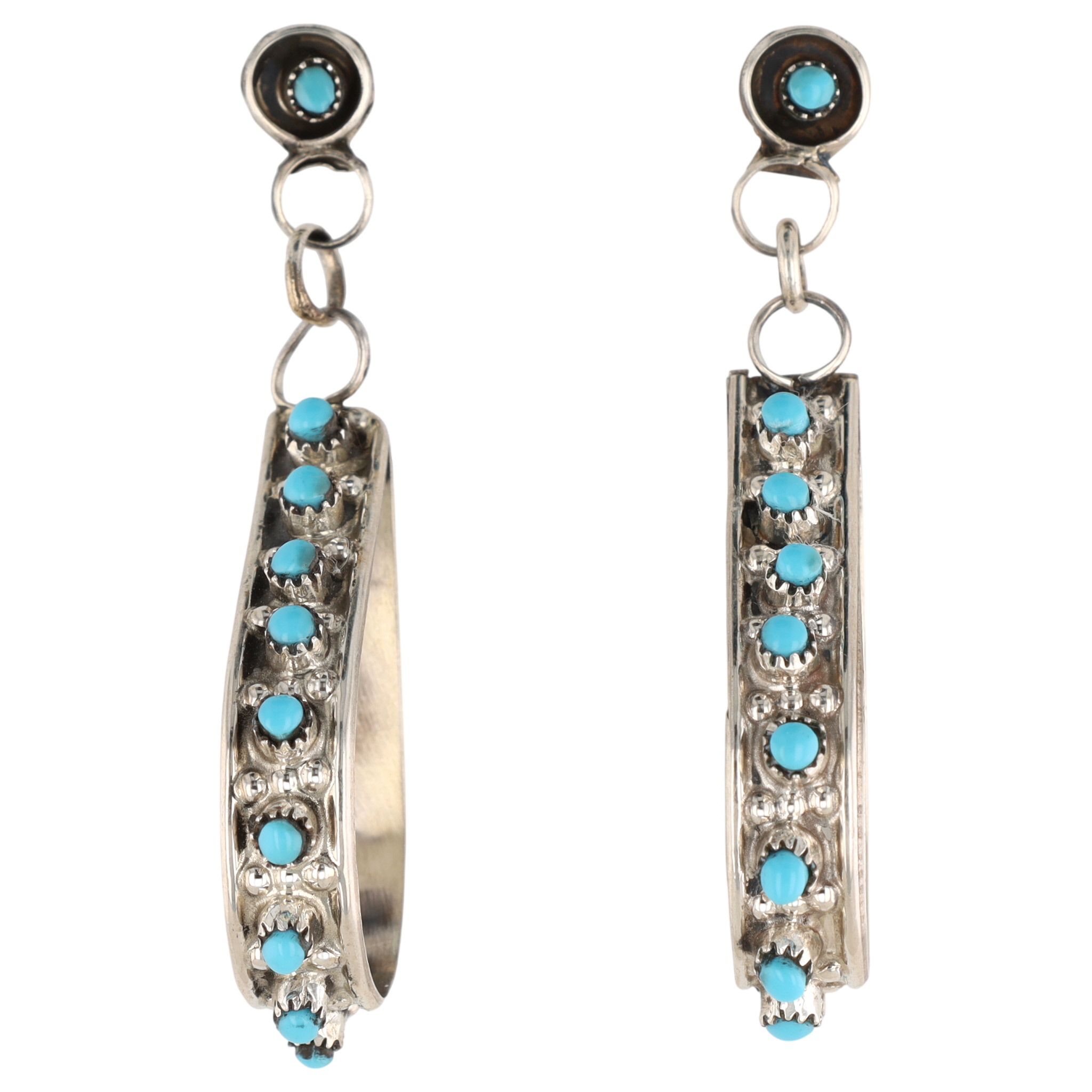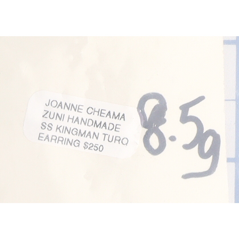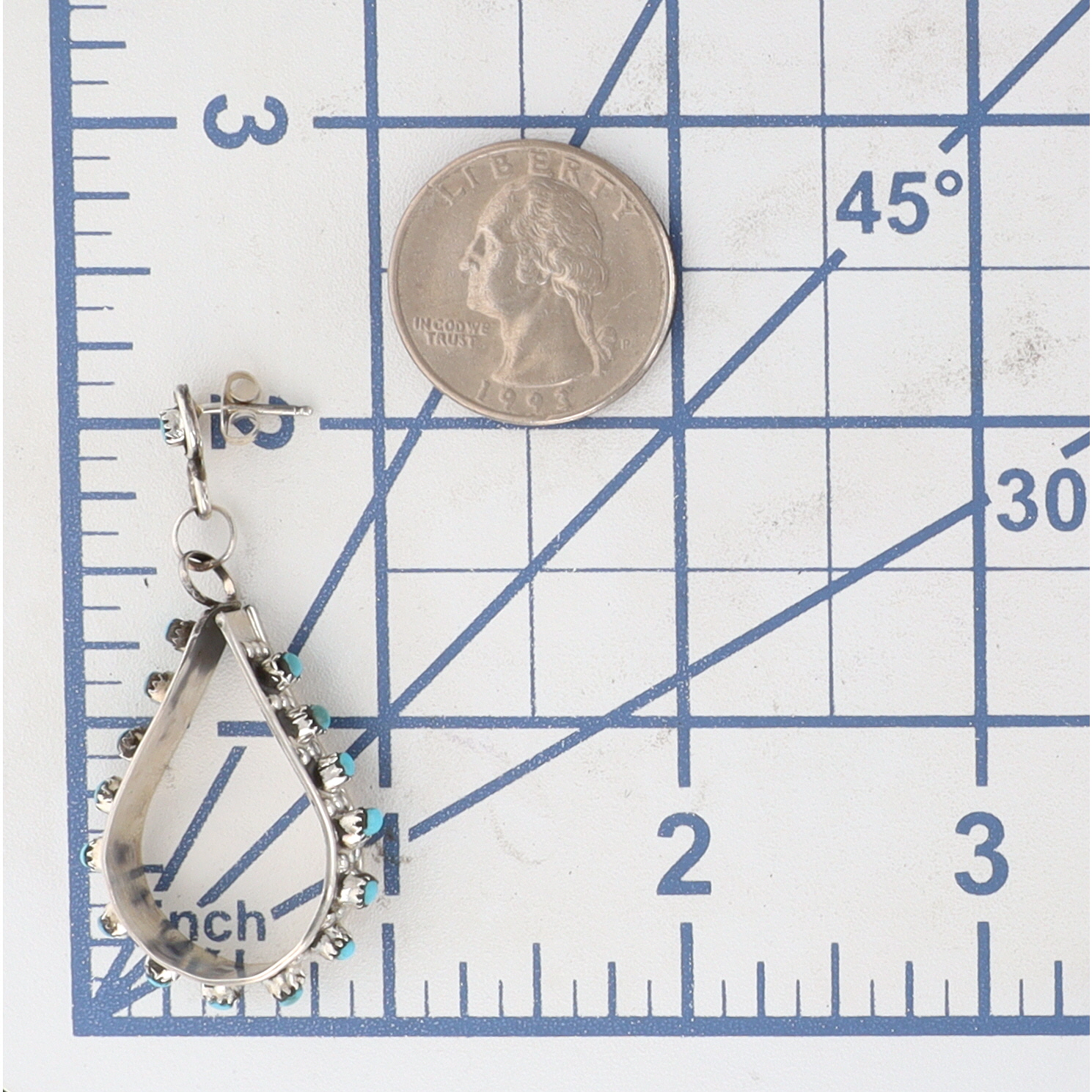 A pair of Joanne Cheama Zuni handmade sterling silver Kingman turquoise teardrop hoop earrings, weighing 8.5g and measuring approximately 1.75 inches long.