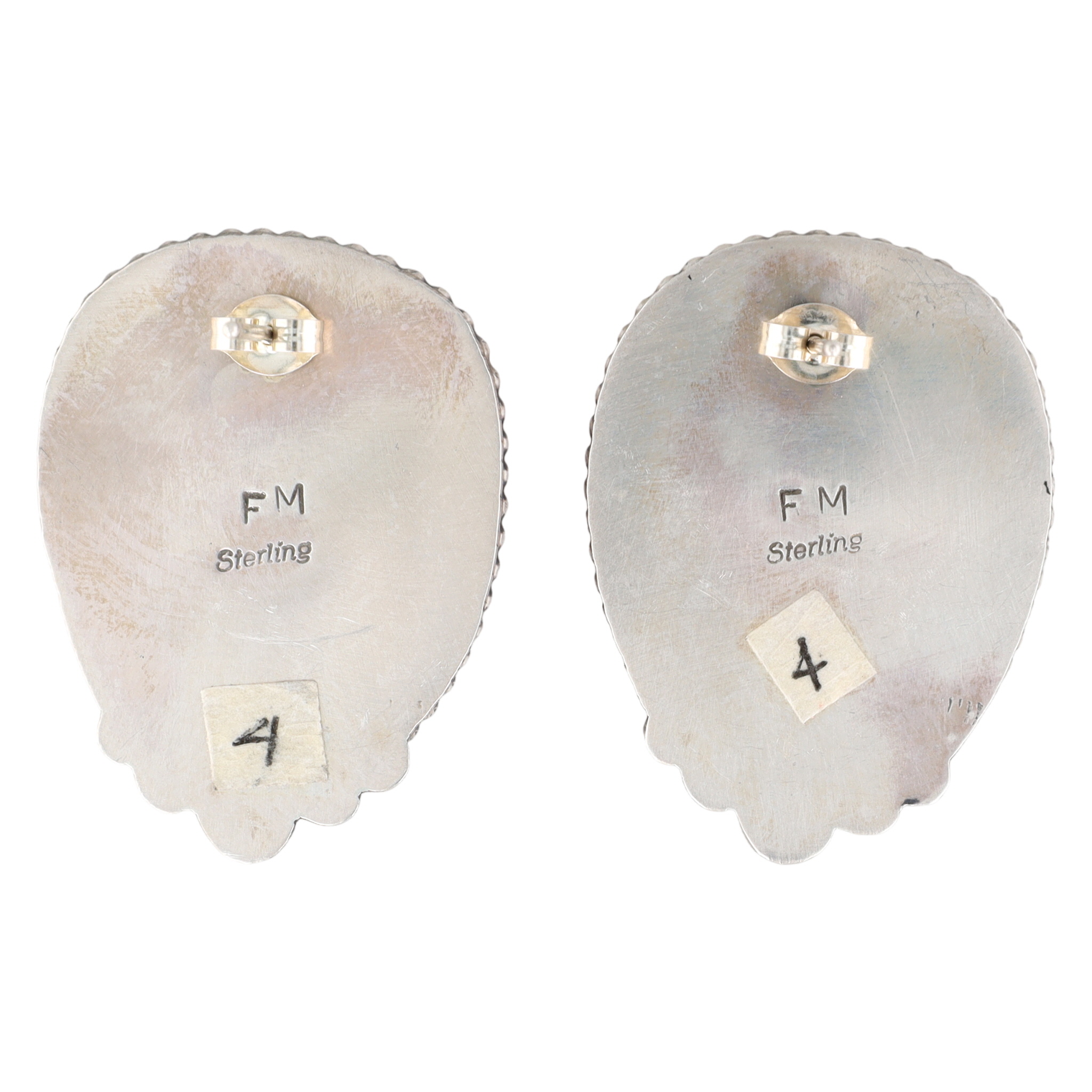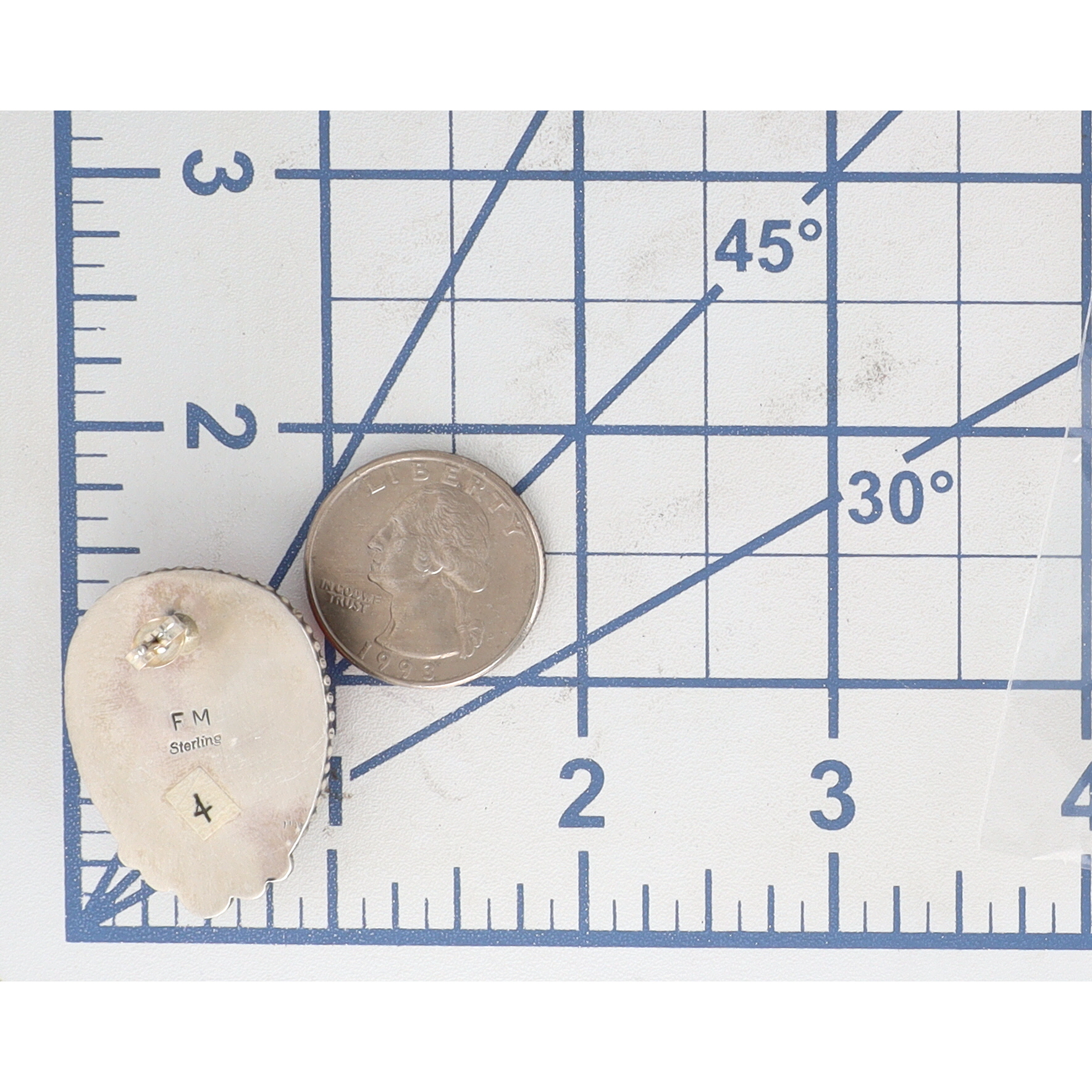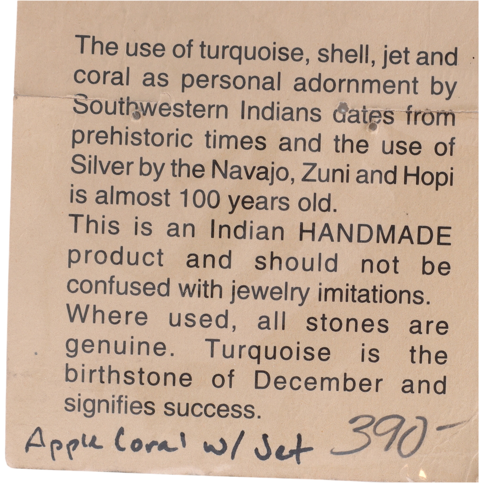 A pair of Freddie Maloney Navajo Sterling ladybug earrings featuring red apple coral, black jet, and small turquoise accents, each approximately 1.25 inches long, with a total weight of 25g, and includes a label noting “Apple Coral w/ Jet” and “Indian HANDMADE product.”