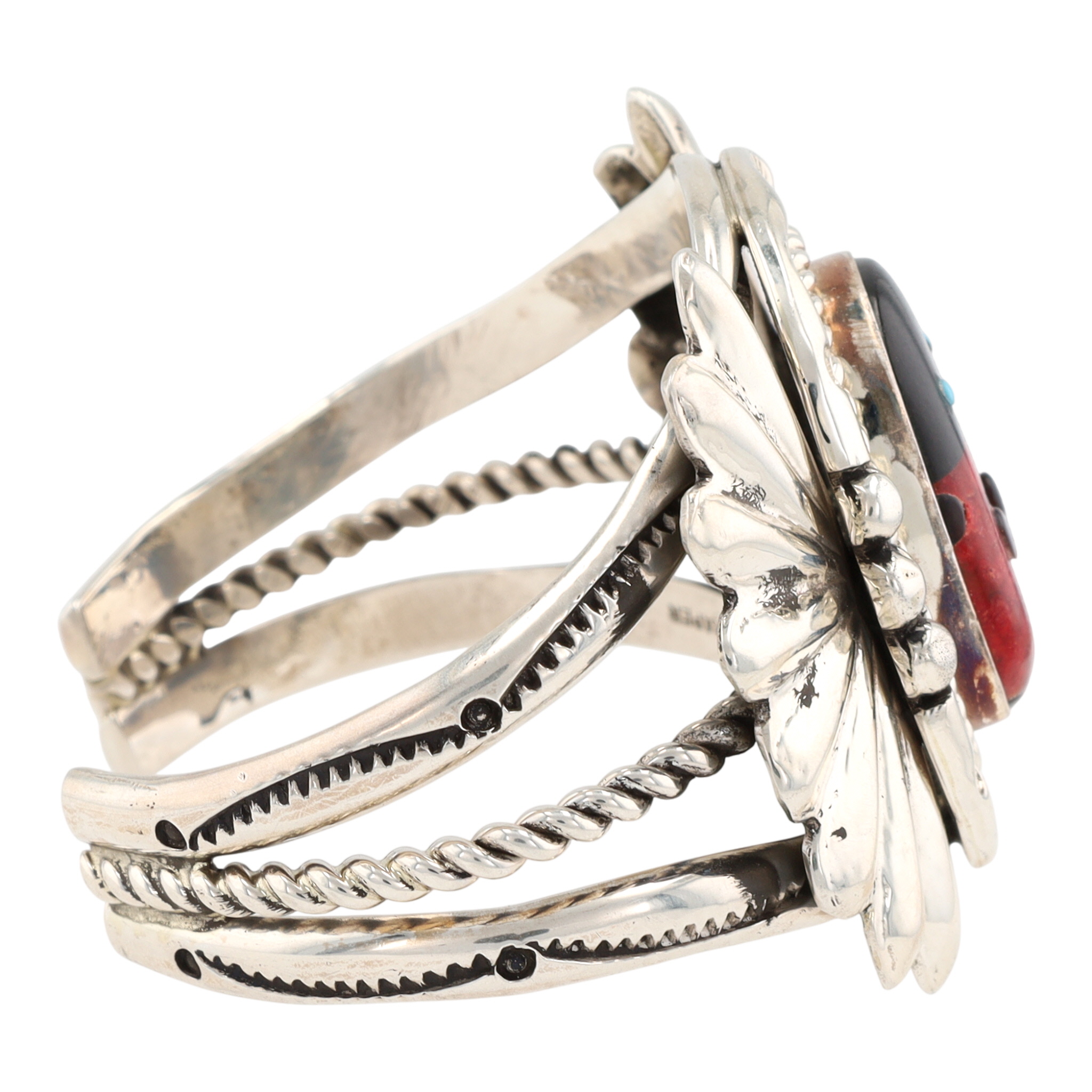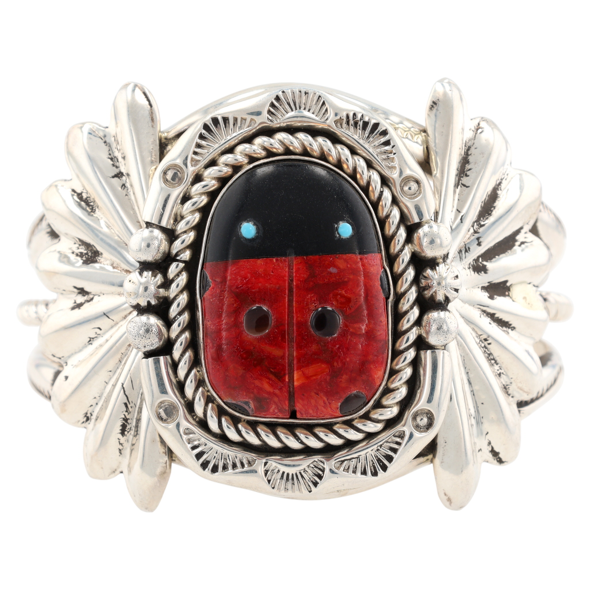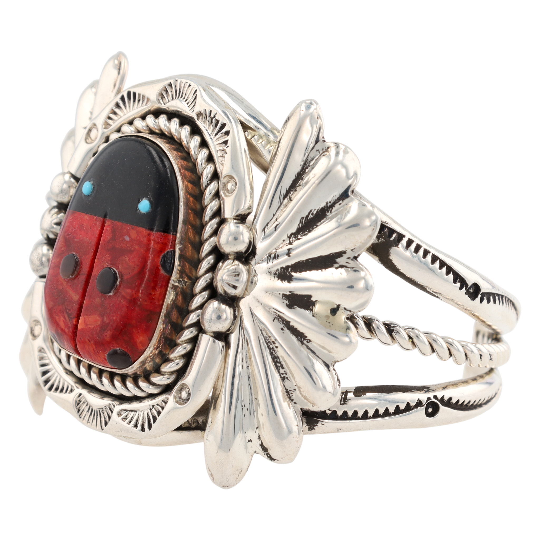 A Joelias Draper Navajo sterling silver cuff bracelet, weighing 74.5g, features a apple coral, jet, and turquoise ladybug inlay, marked “STERLING”, measures approximately 6 inches internal circumference.