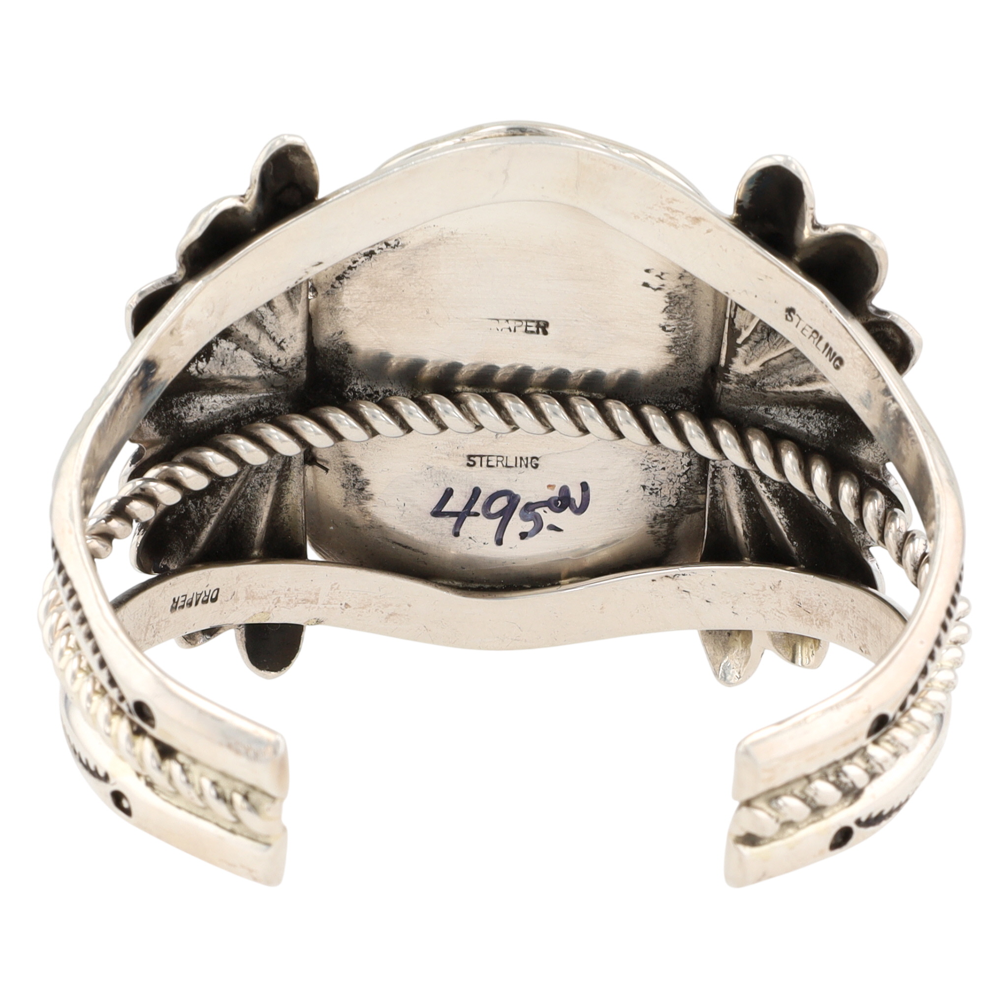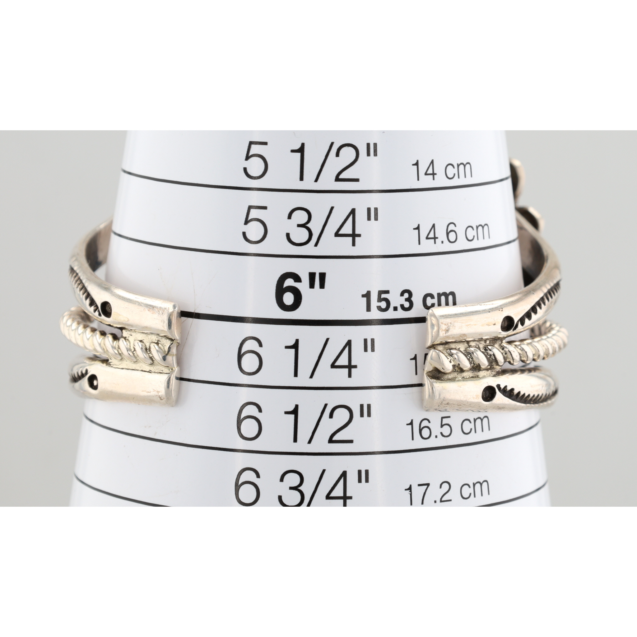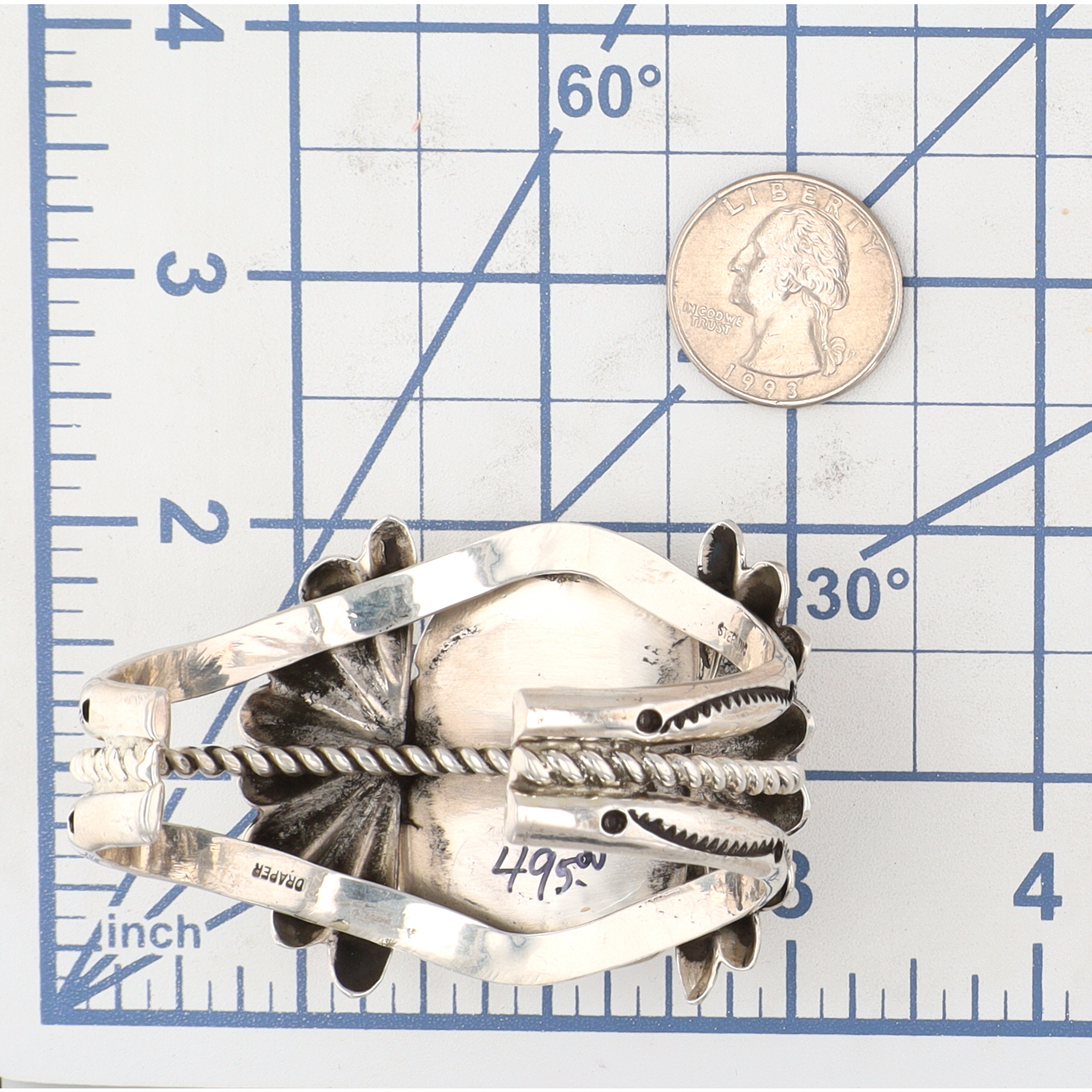 A Joelias Draper Navajo sterling silver cuff bracelet, weighing 74.5g, features a apple coral, jet, and turquoise ladybug inlay, marked “STERLING”, measures approximately 6 inches internal circumference.