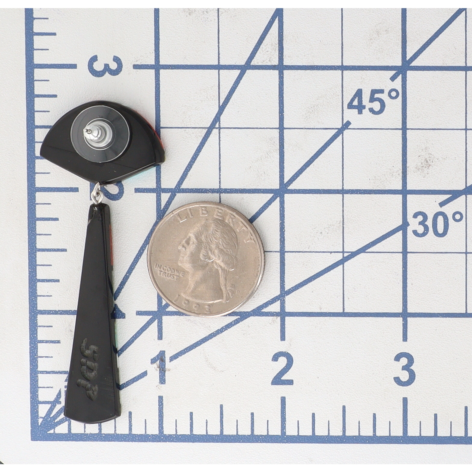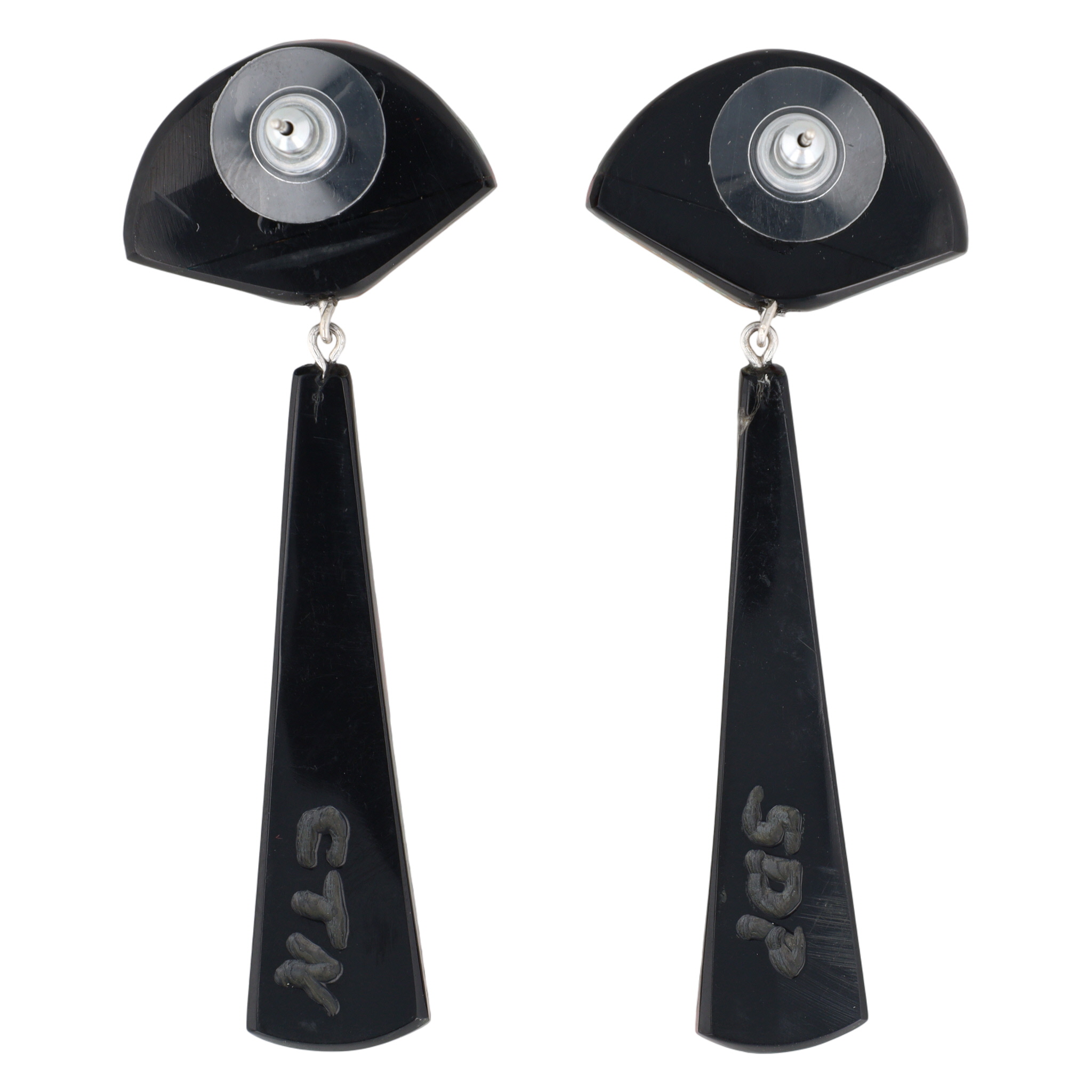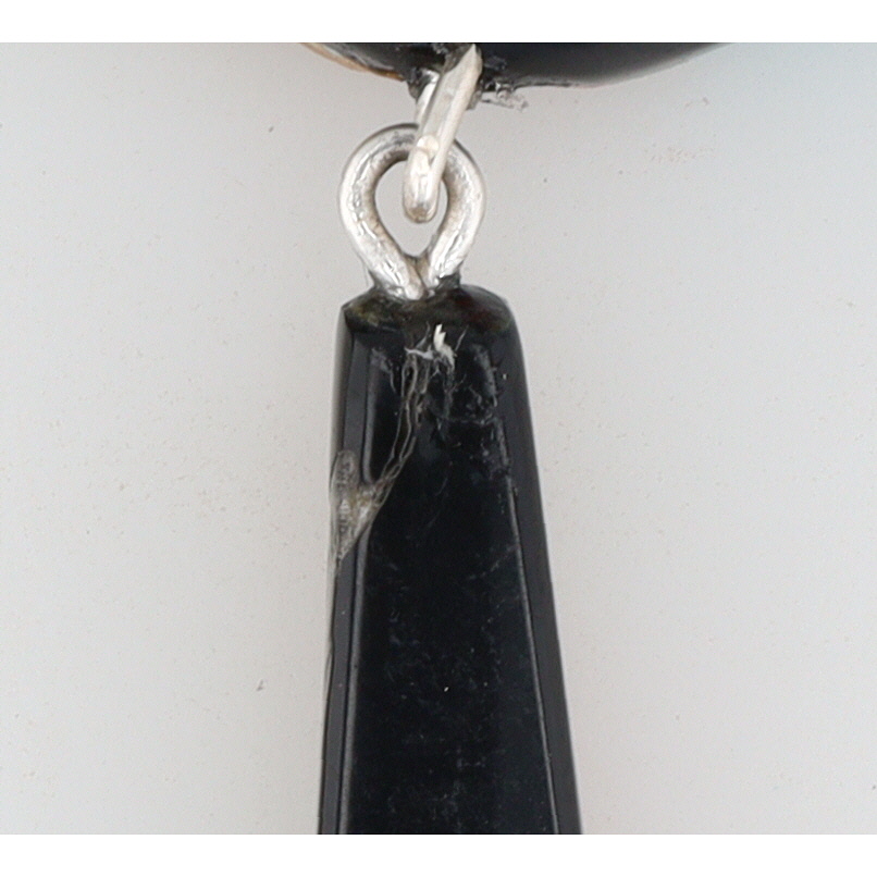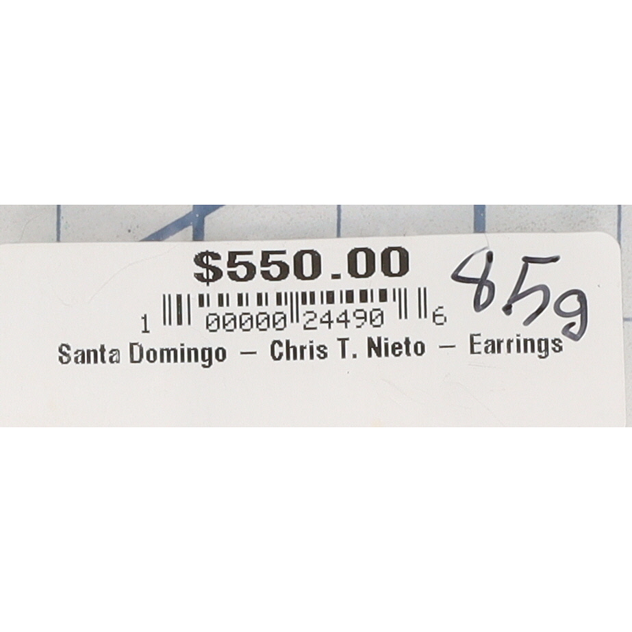 A pair of Chris T. Nieto Santa Domingo Pueblo multi-stone inlaid drop earrings, coral, turquoise, mother-of-pearl, gaspeite/variscite, jet, lapis, measuring approximately 2.5 inches long, weighing 8.5g, featuring the carved marks ‘SDP’ and ‘CTN’ on their black backs. Crack shown in photo.