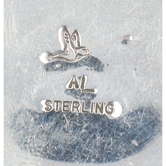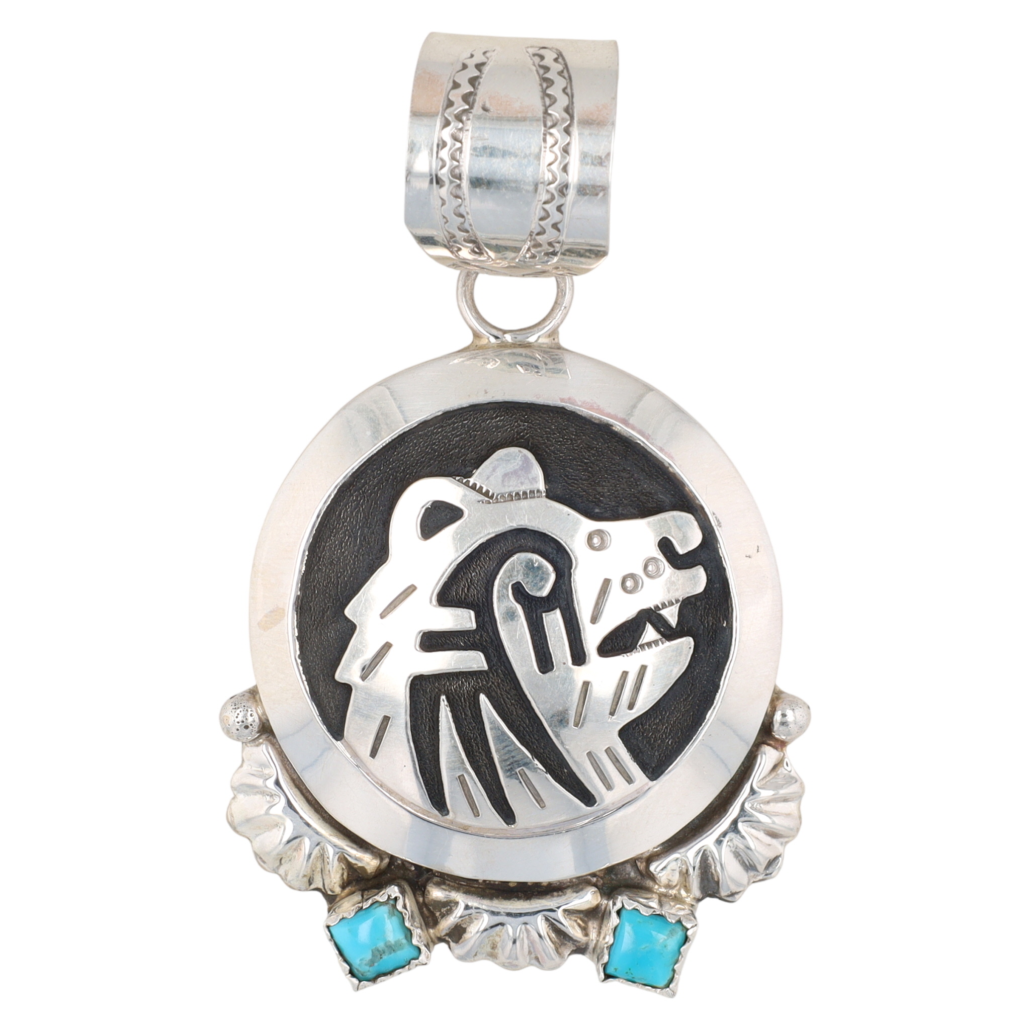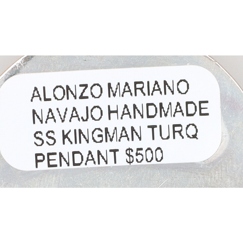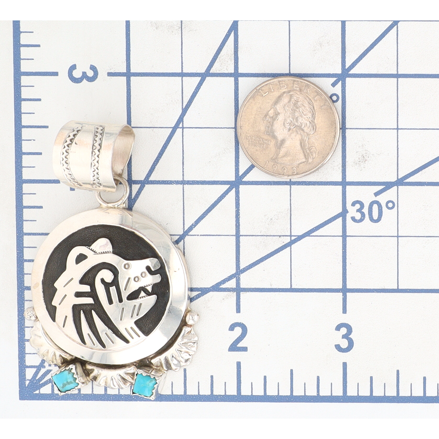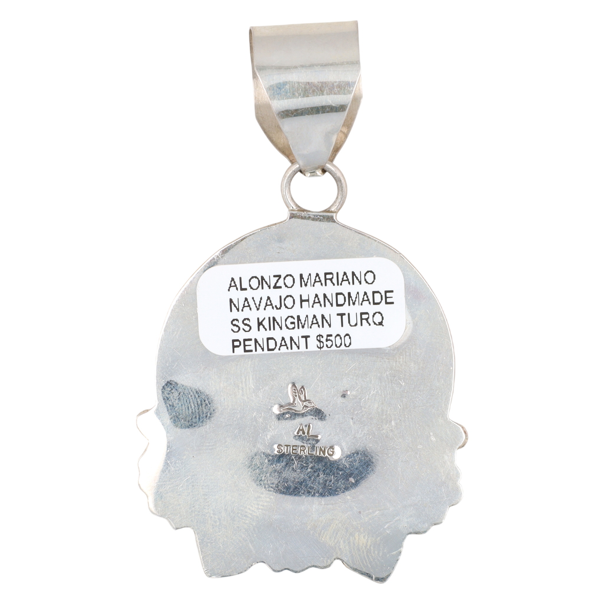 Alonzo Mariano Navajo handmade sterling silver overlay Kingman turquoise pendant featuring a stylized bear head, measuring approximately 2 inches long and weighing 18.5g.