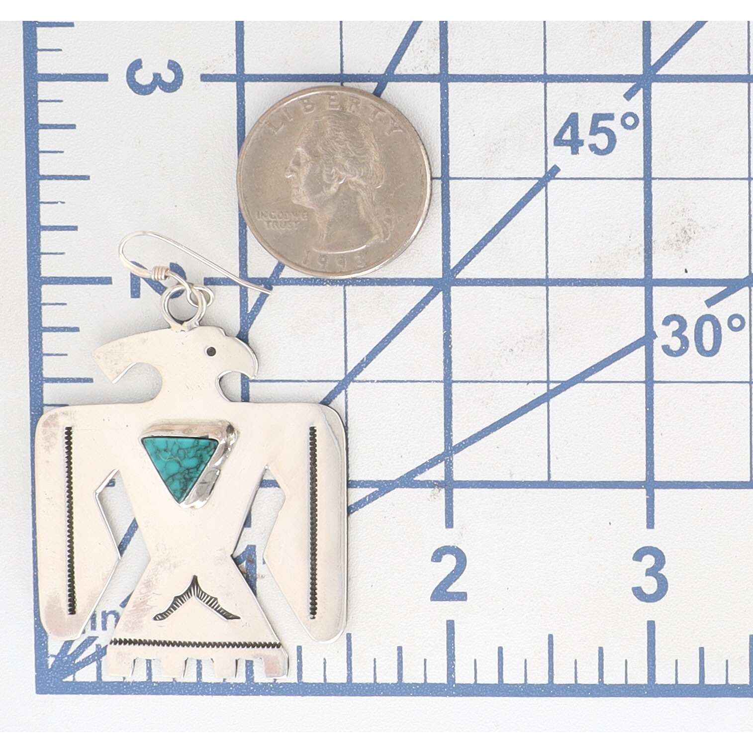 A pair of H.JOE Navajo sterling silver thunderbird dangle earrings with Hubei turquoise, measuring approximately 2.25 inches long and weighing 16.5g.