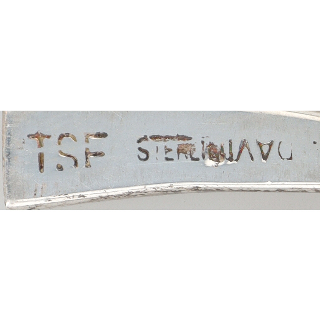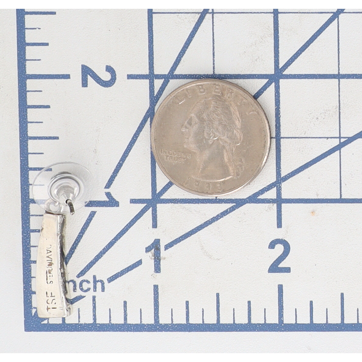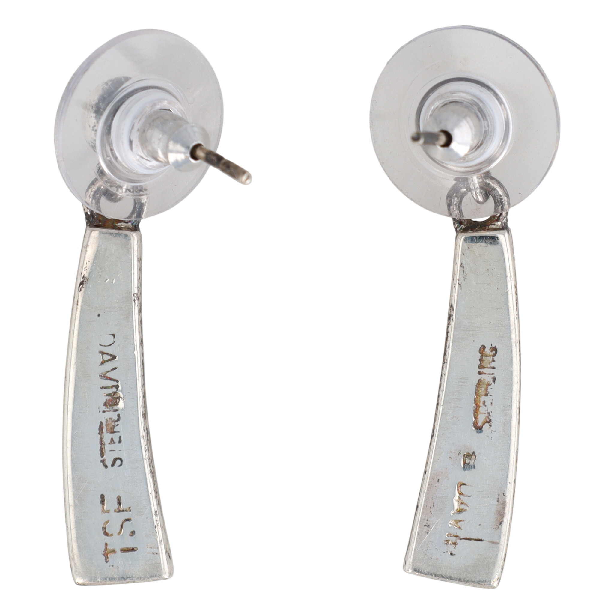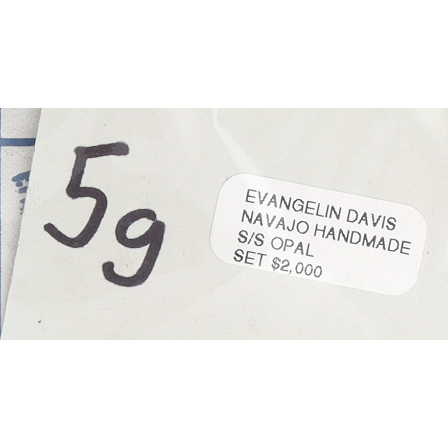 A pair of sterling silver Navajo handmade dangle earrings, shop marked Touch of Santa Fe “TSF STERLING NAVAJO”, featuring light blue/green opal inlay, measuring approximately 1.5 inches long and weighing 5g, with a label identifying them as “EVANGELIN DAVIS NAVAJO HANDMADE S/S OPAL”.