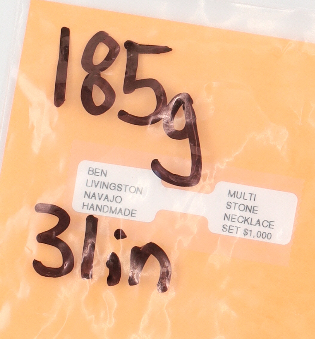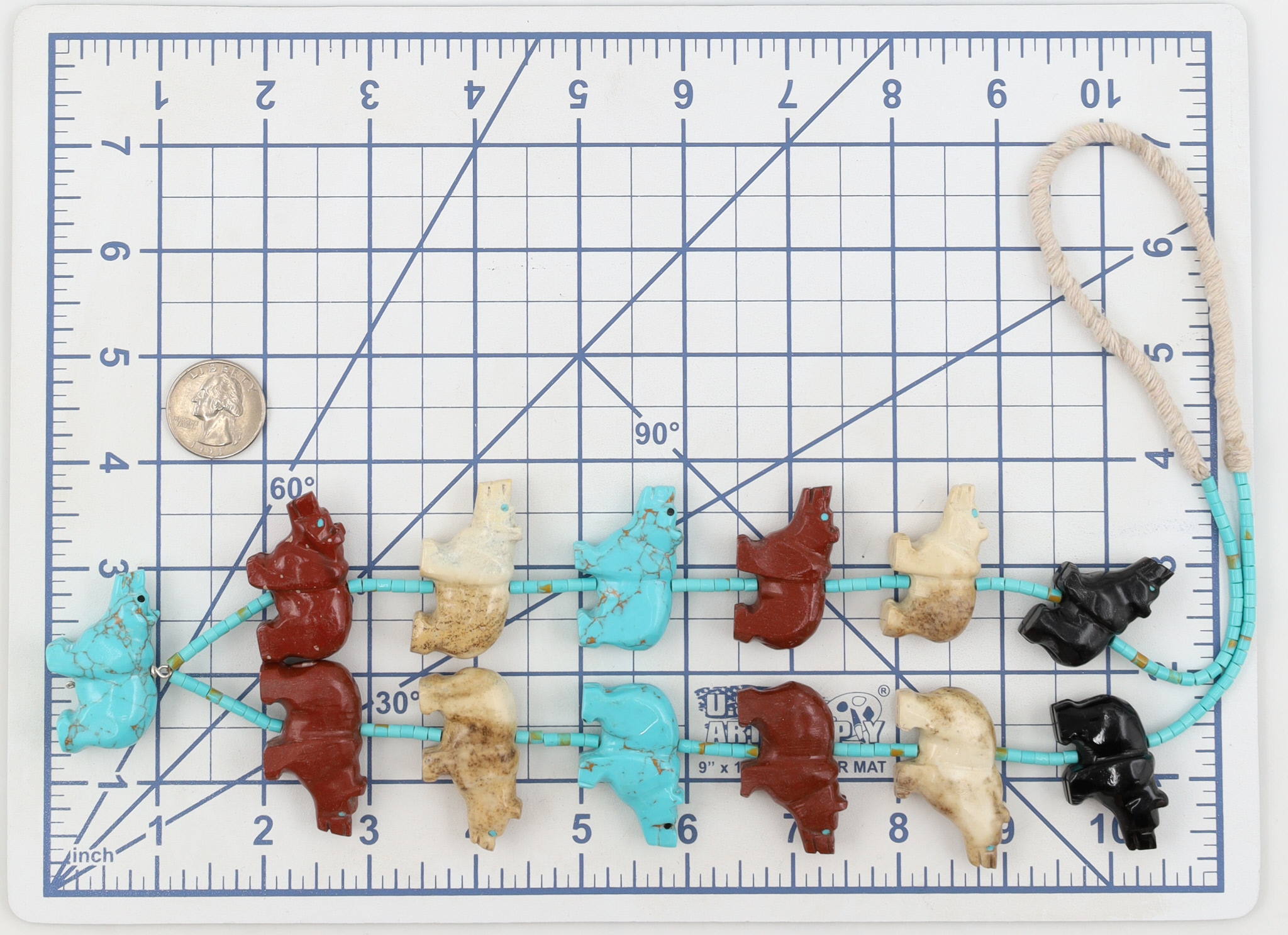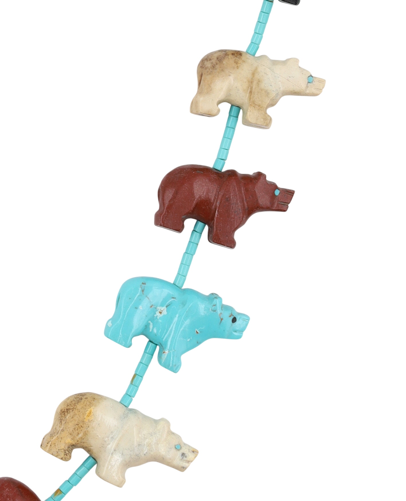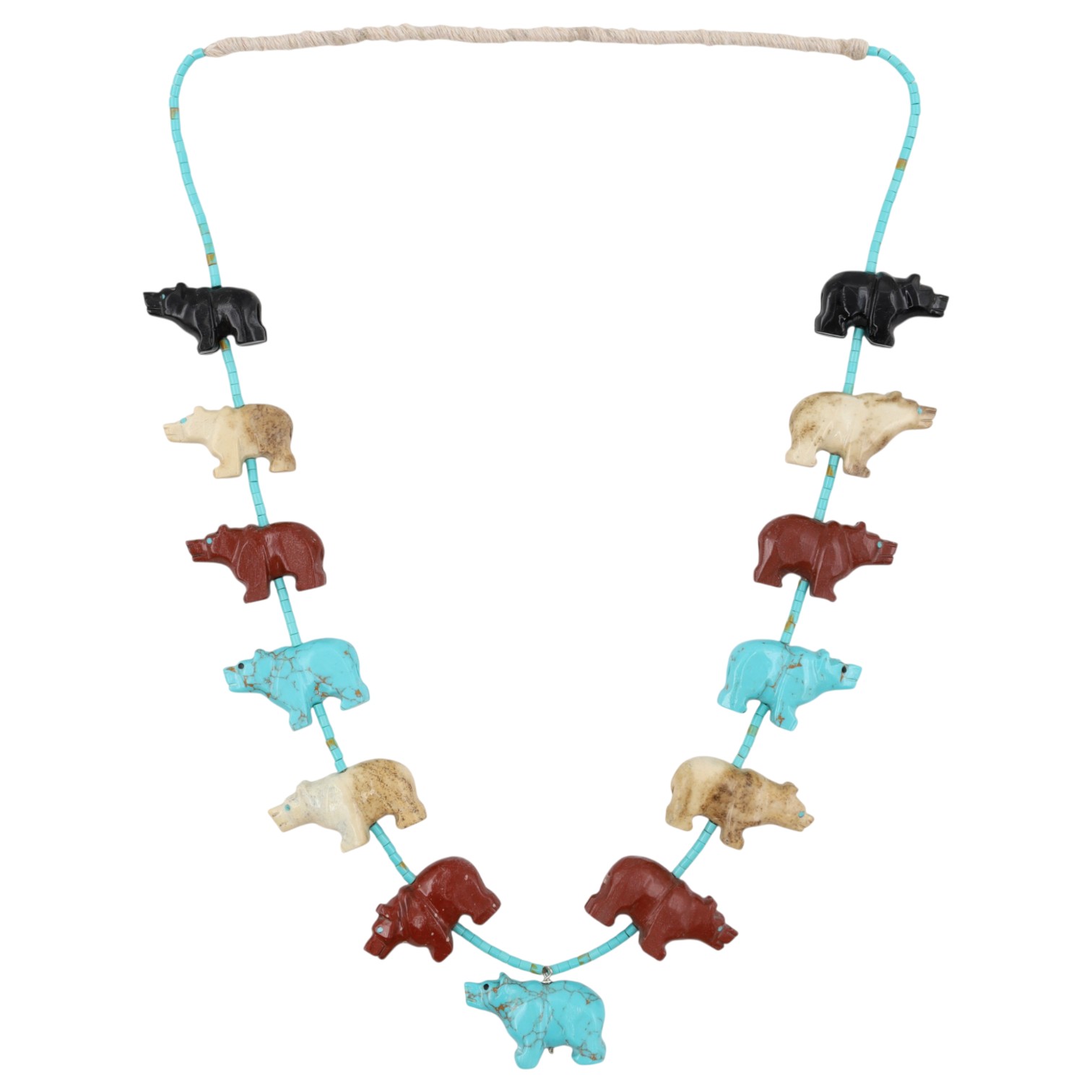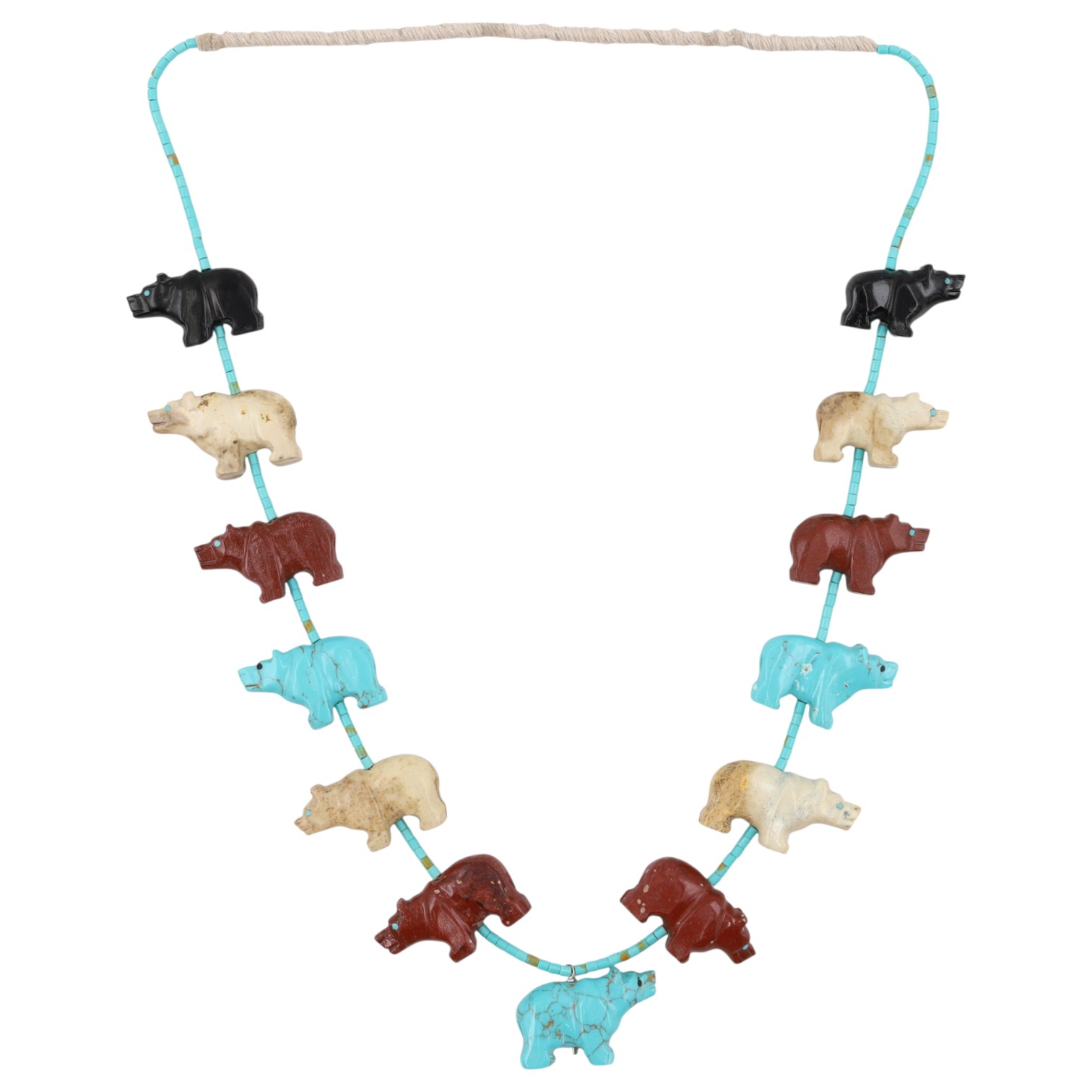 A Ben Livingston Navajo multi-stone necklace featuring eighteen carved bear fetishes in jet, brown jasper, rhyolite, turquoise, strung on turquoise beads, 185g, approximately 32 inches