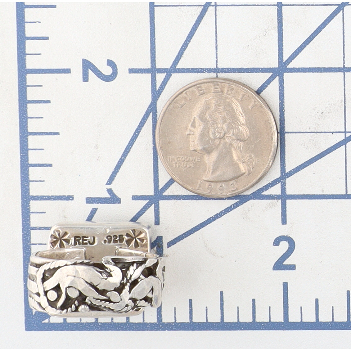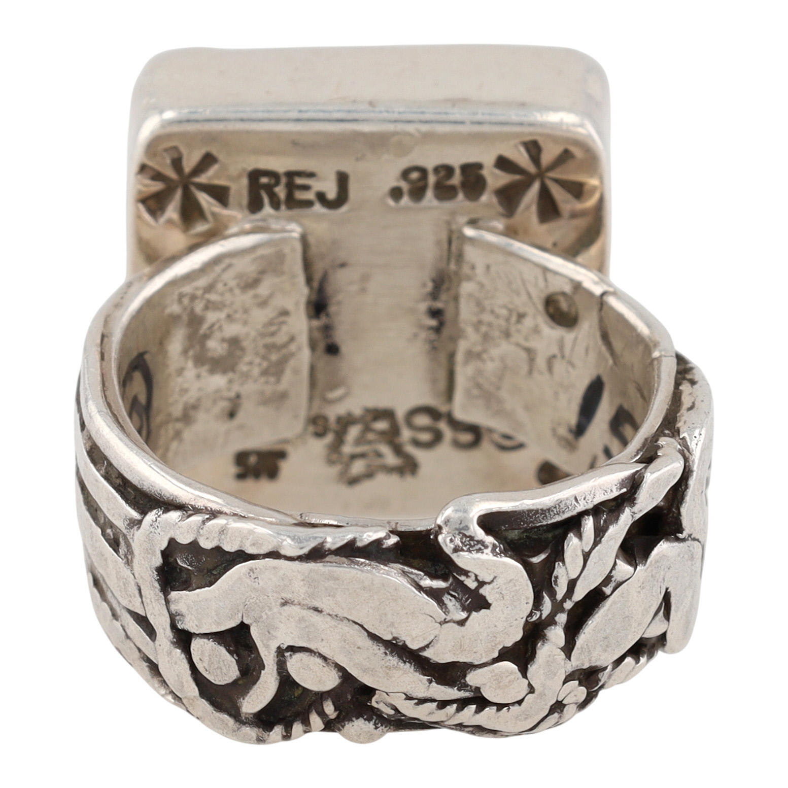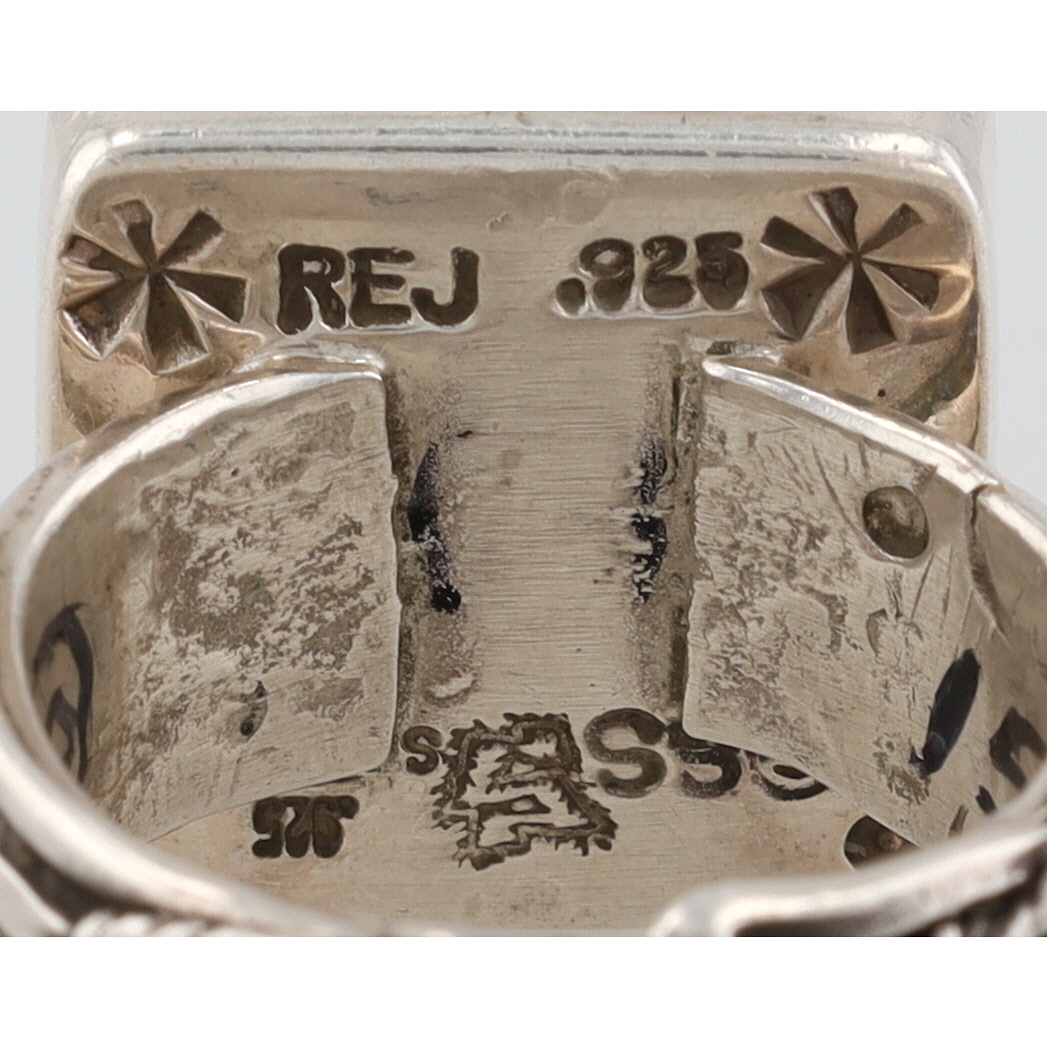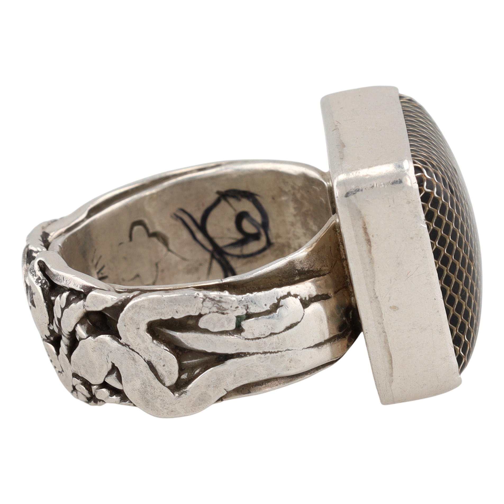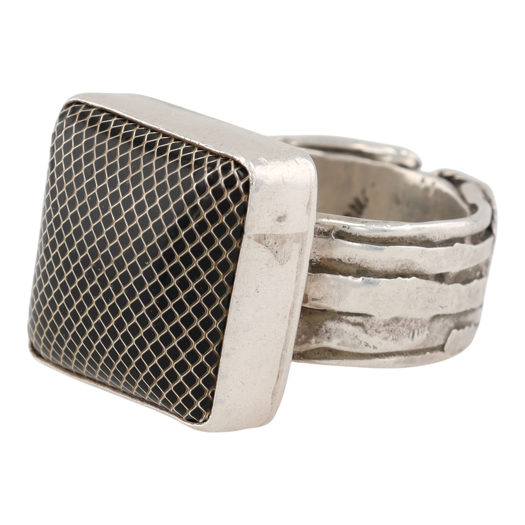 Robert E. Jones Zuni & Cochiti Pueblo sterling ring with a square black onyx top covered by a fine silver mesh, weighing 19g, size US 9, inscribed ‘REJ’ and ‘.925’ on the inner band, and a stylized “S” for another unknown artist/shop.