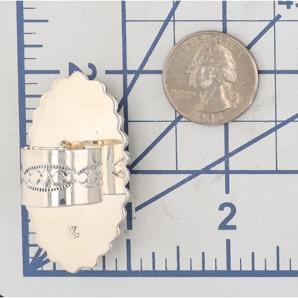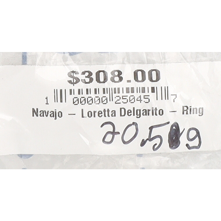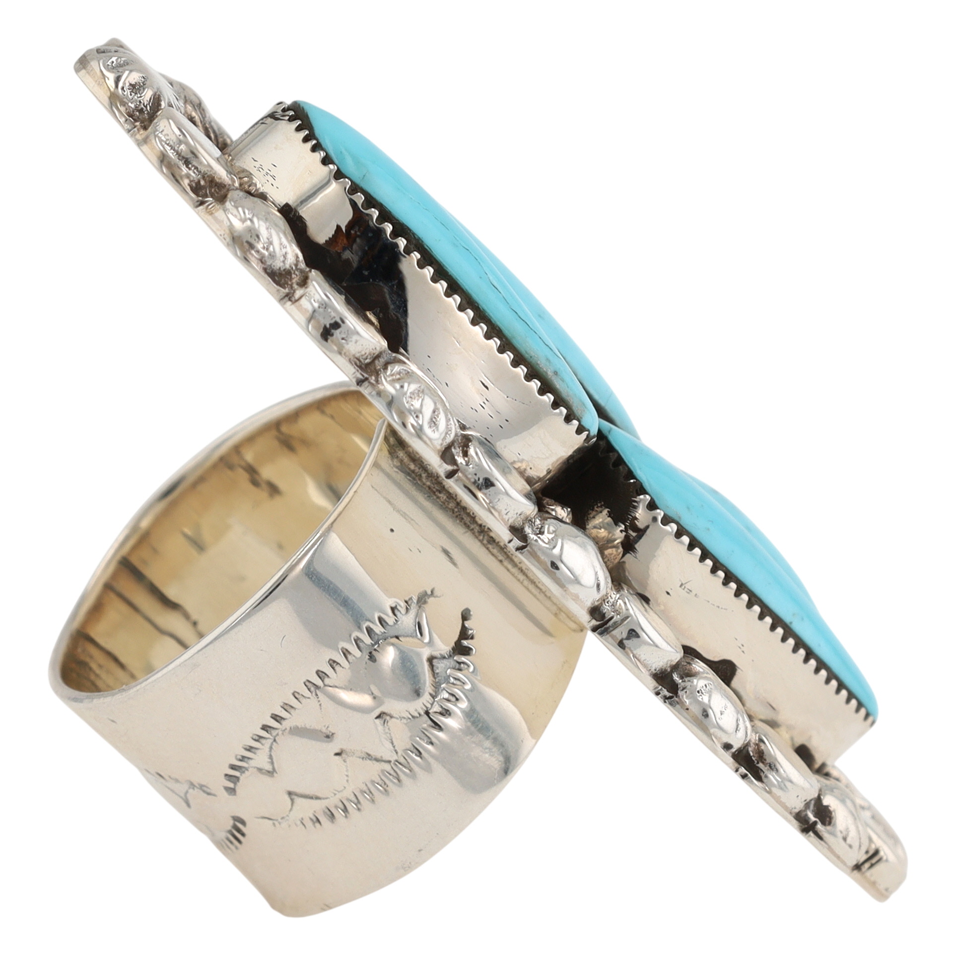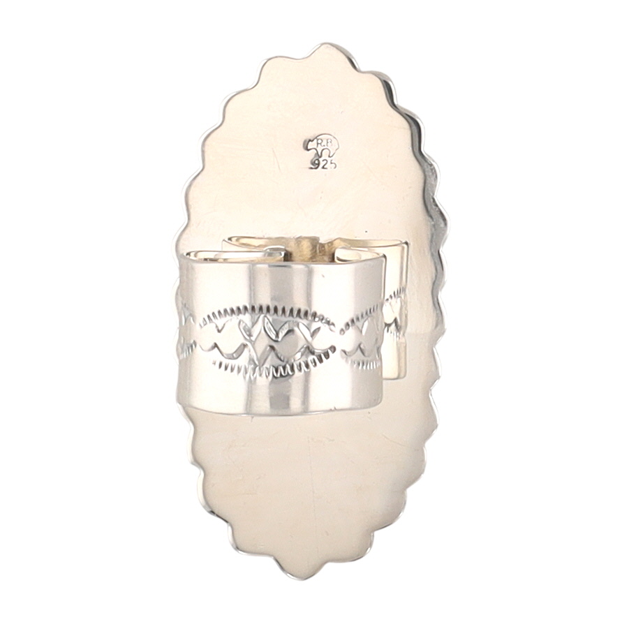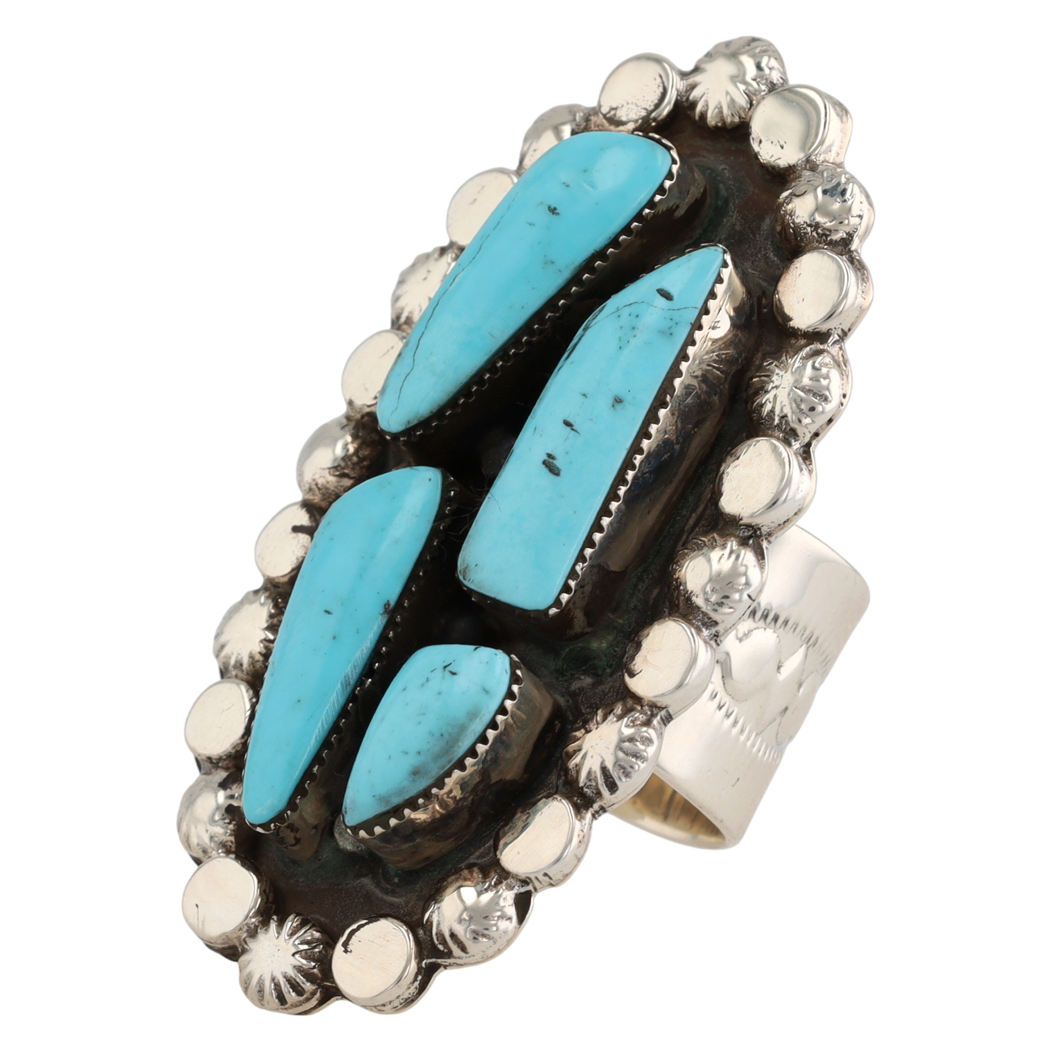 A Navajo silver and turquoise cluster ring by Loretta Delgarito, marked “R.B.” and “925” for Running Bear Shop, measuring approximately 1.5 inches long, weighing 20.5g, size US 6. Crack in top left stone shown in photo 1.