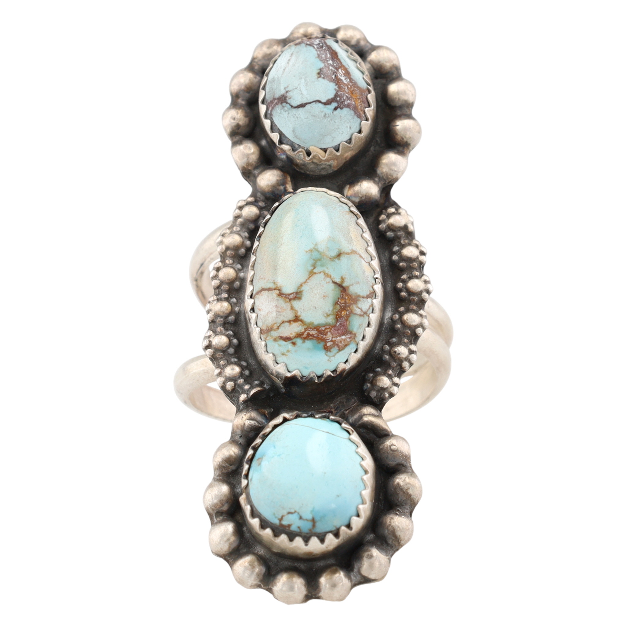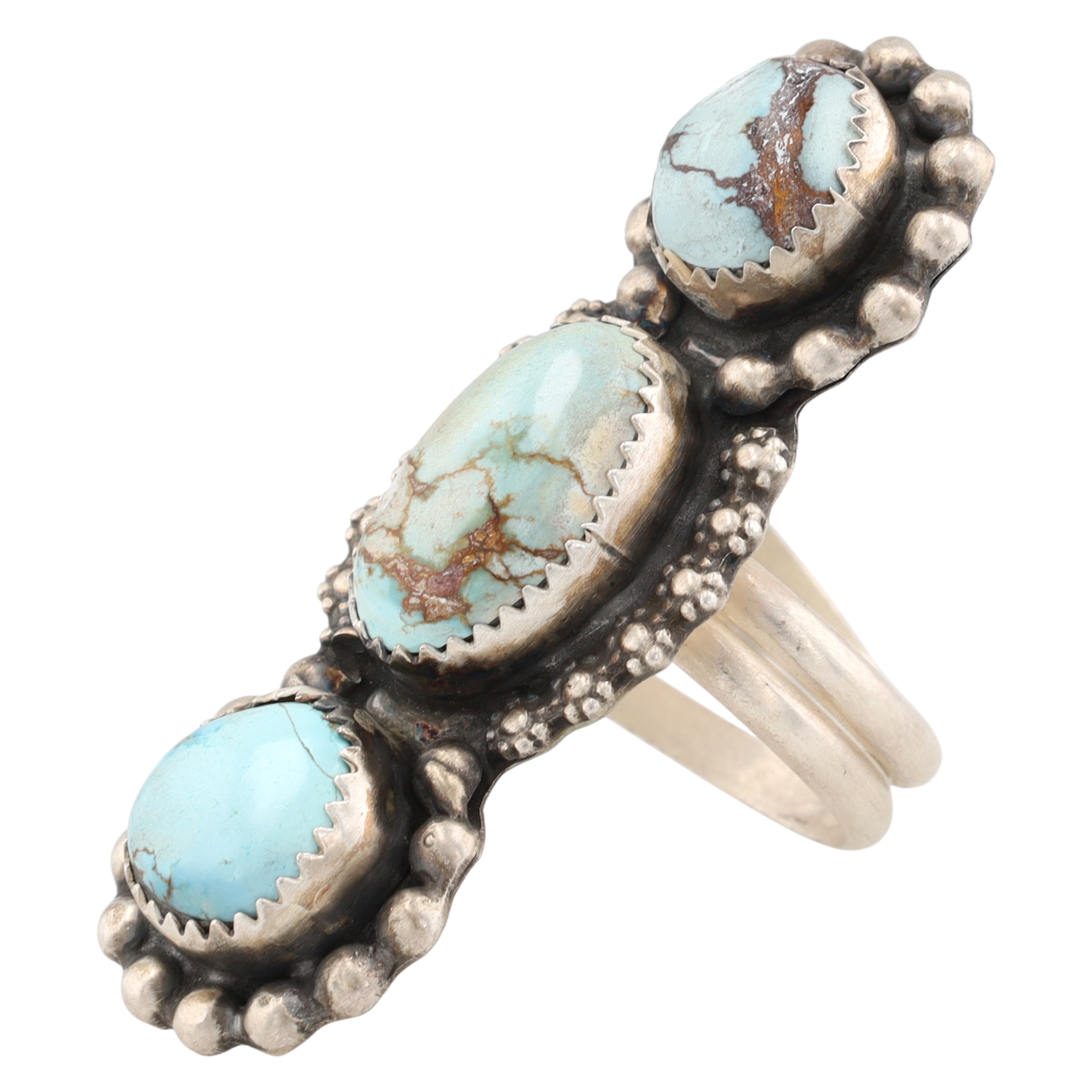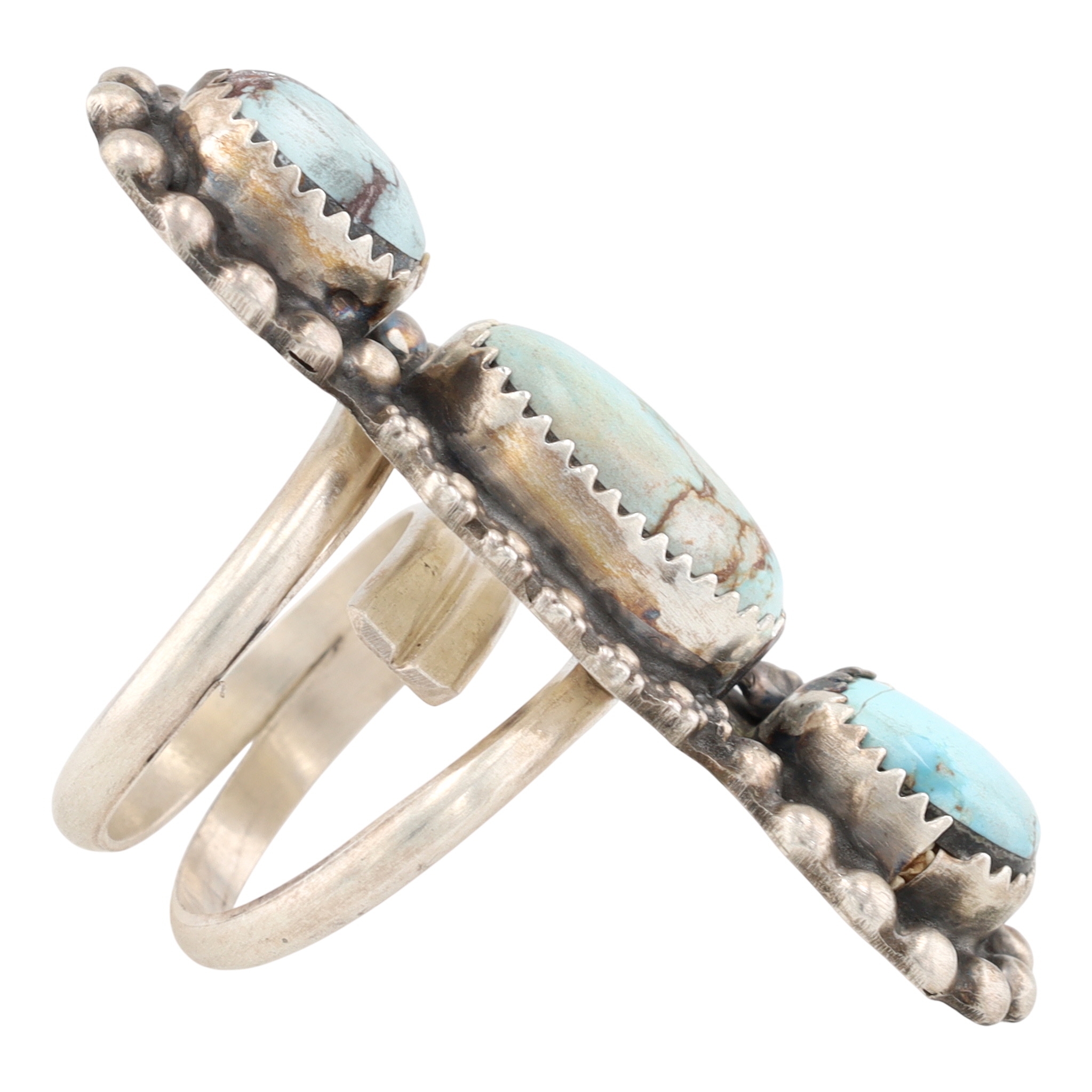 A Donovan Nez Navajo handmade sterling silver adjustable ring featuring three Golden Hills turquoise stones with brown matrix, weighing 12.5g and measuring approximately 2.5 inches long, core ring size US 6. Crack in bottom stone, best seen in image 2.