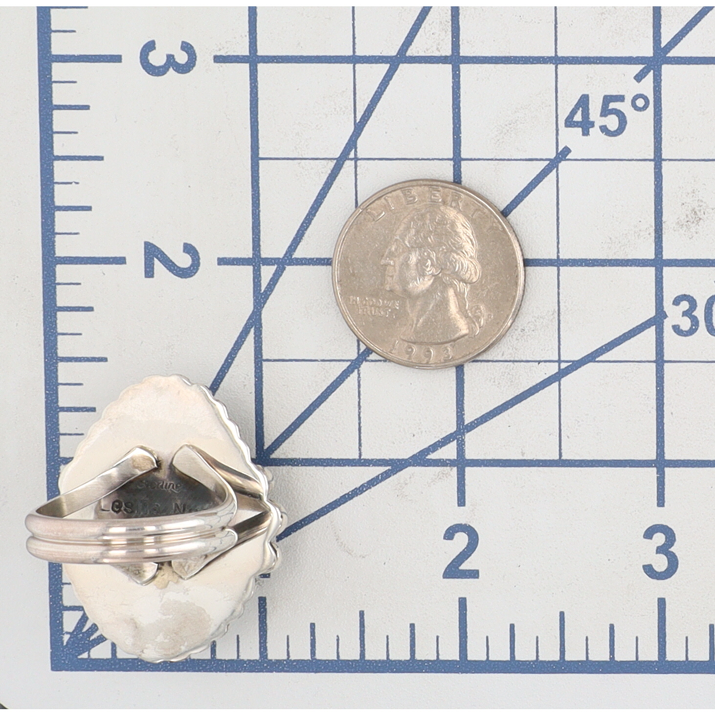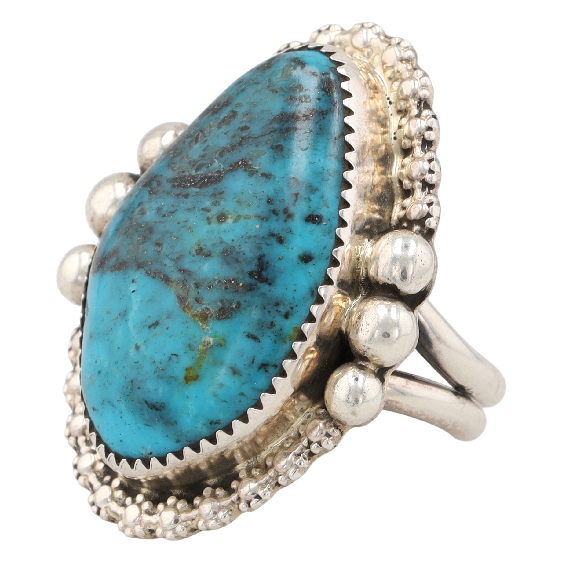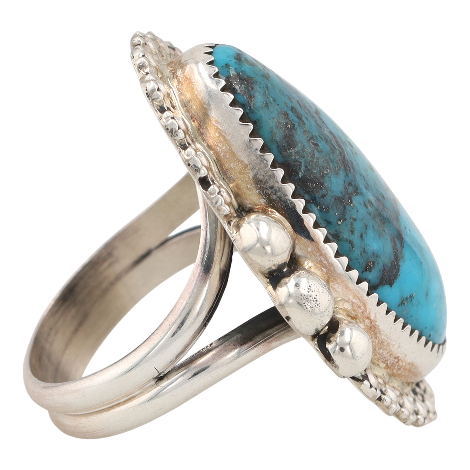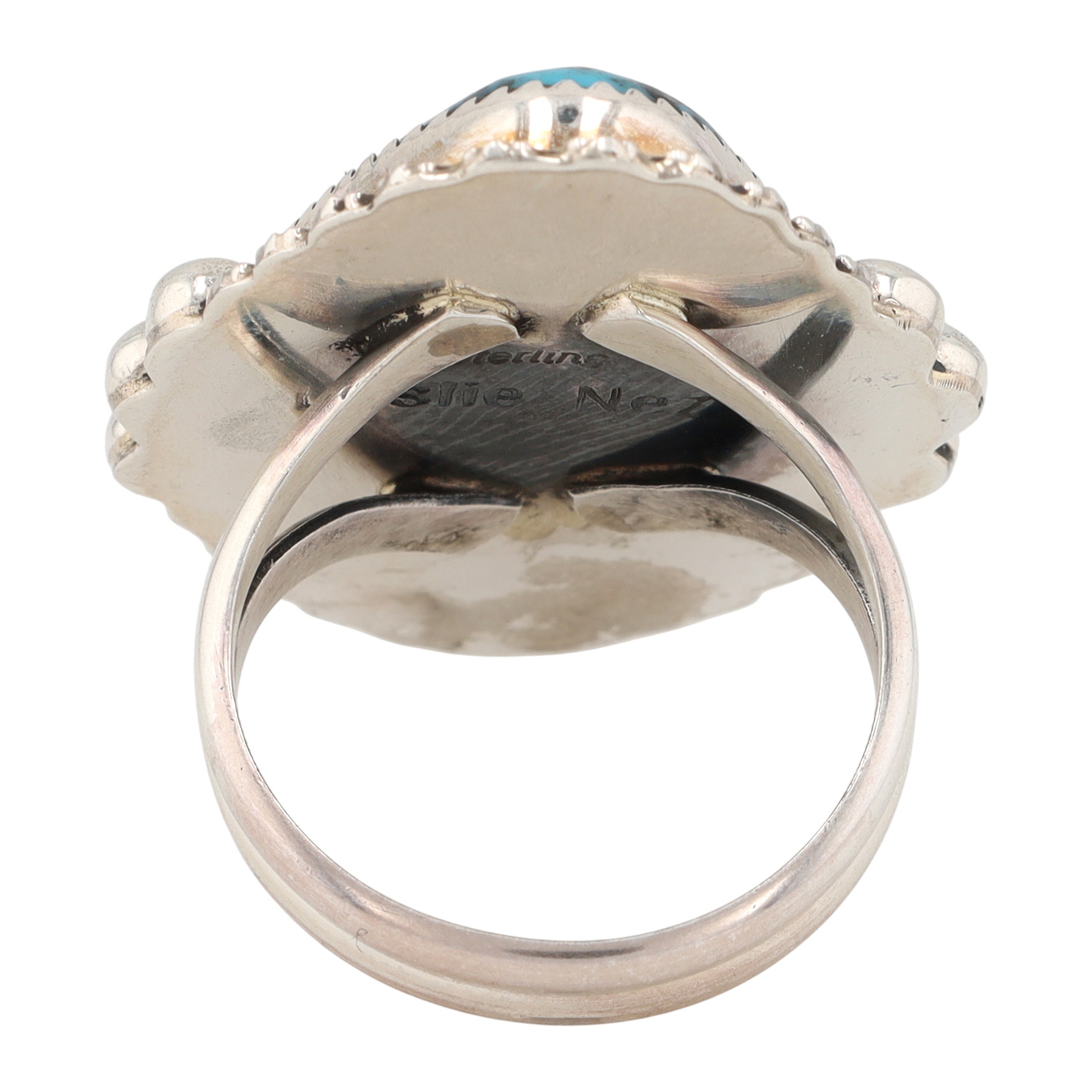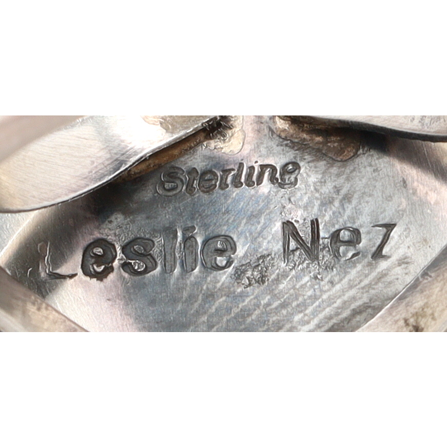 A Navajo sterling ring featuring a large turquoise stone, visibly marked “Sterling” and “Leslie Nez”, weighing 14g, with the face measuring approximately 1.5 inches long, size 9.5