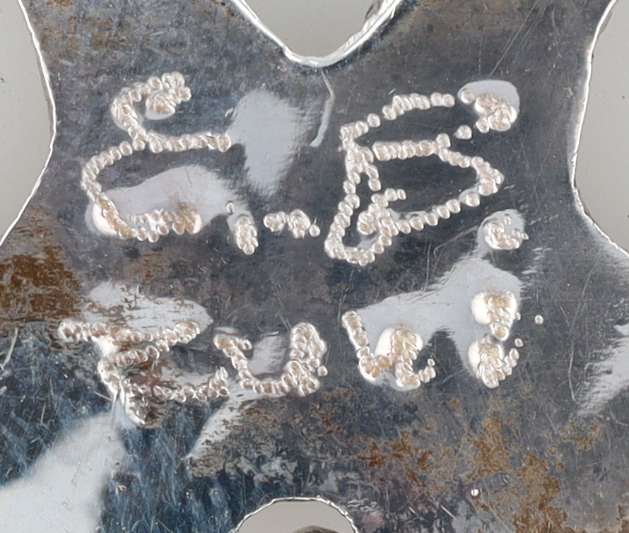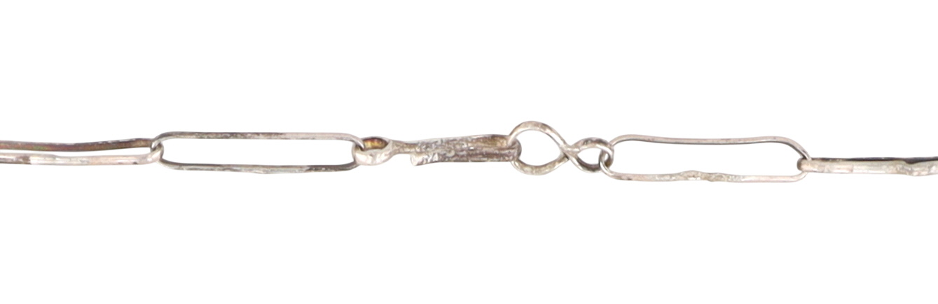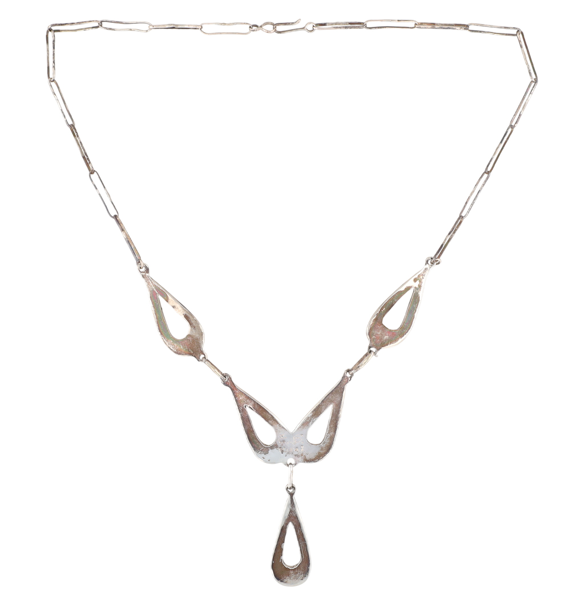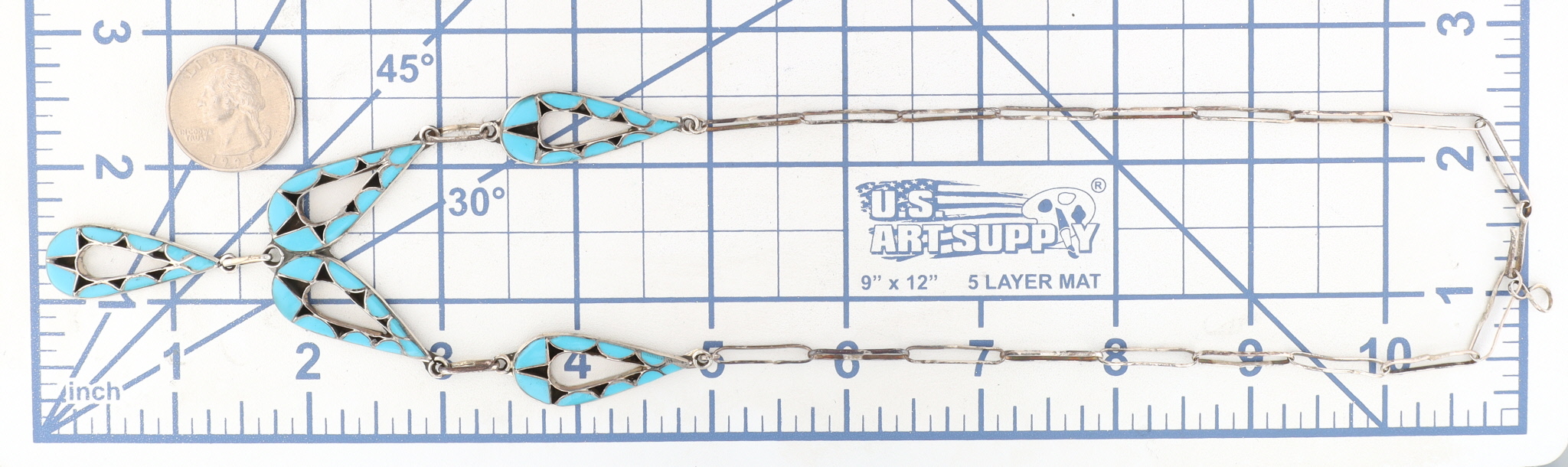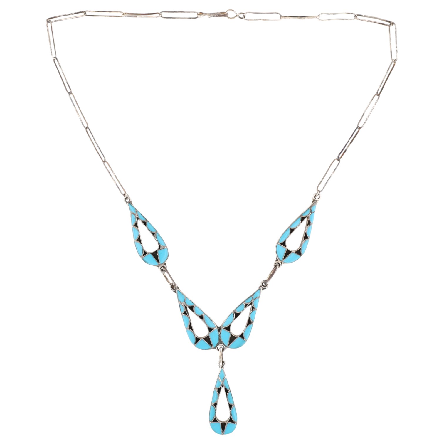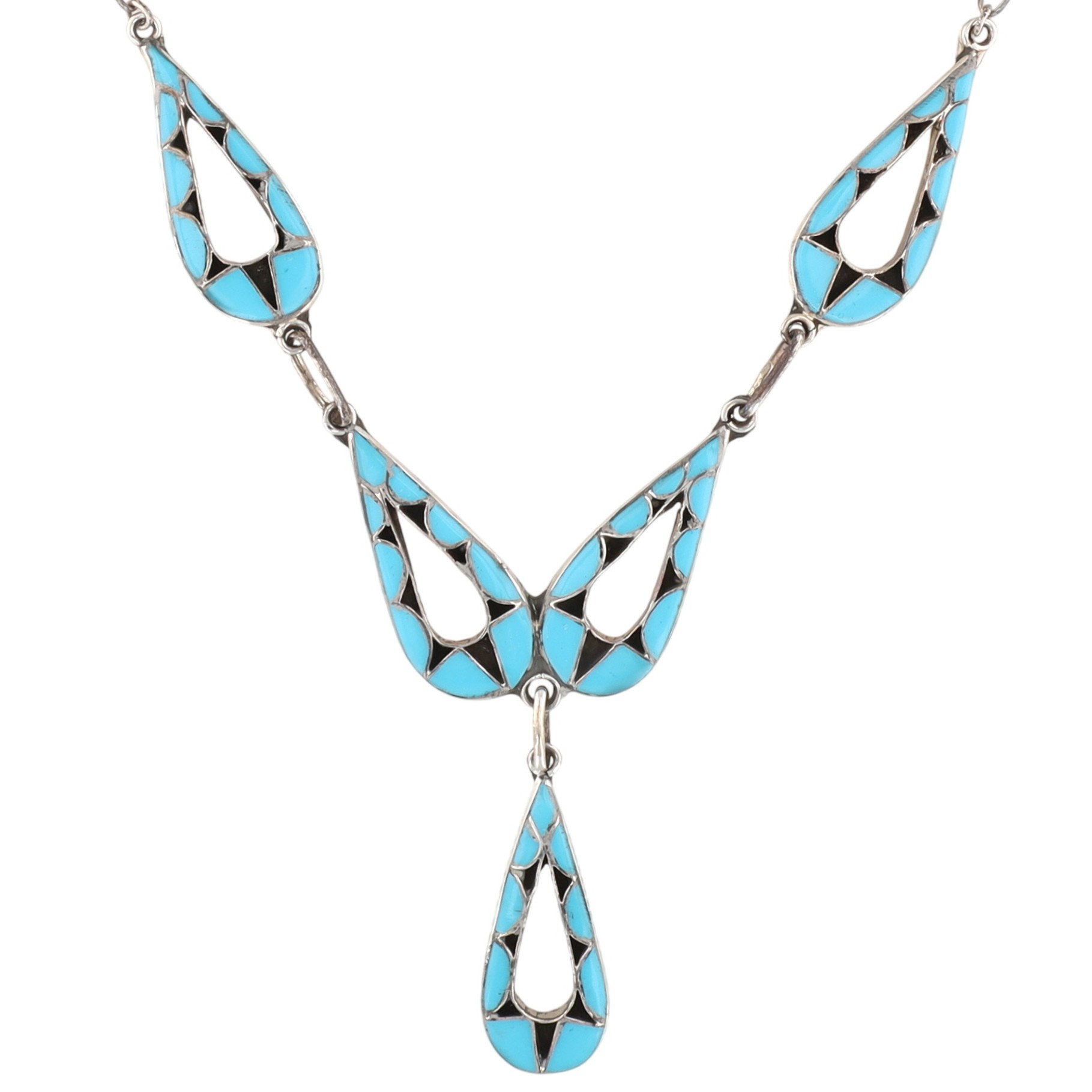 A Emma Bowakaty Zuni 16g sterling necklace, approximately 10 inches long, adorned with five teardrop-shaped elements of turquoise and oxidized shadowbox, bearing the maker’s mark ‘E.B. Zuni’ on its reverse.