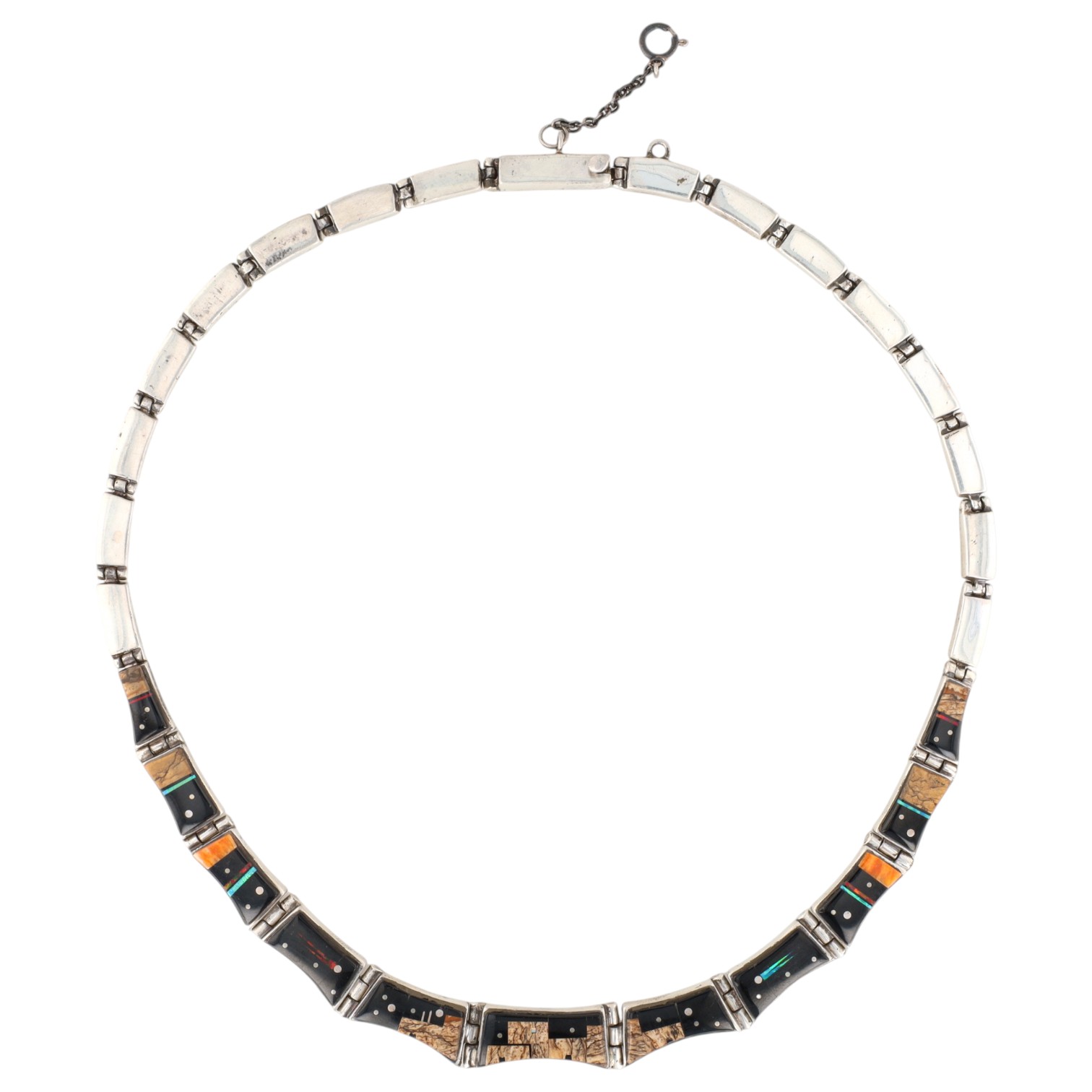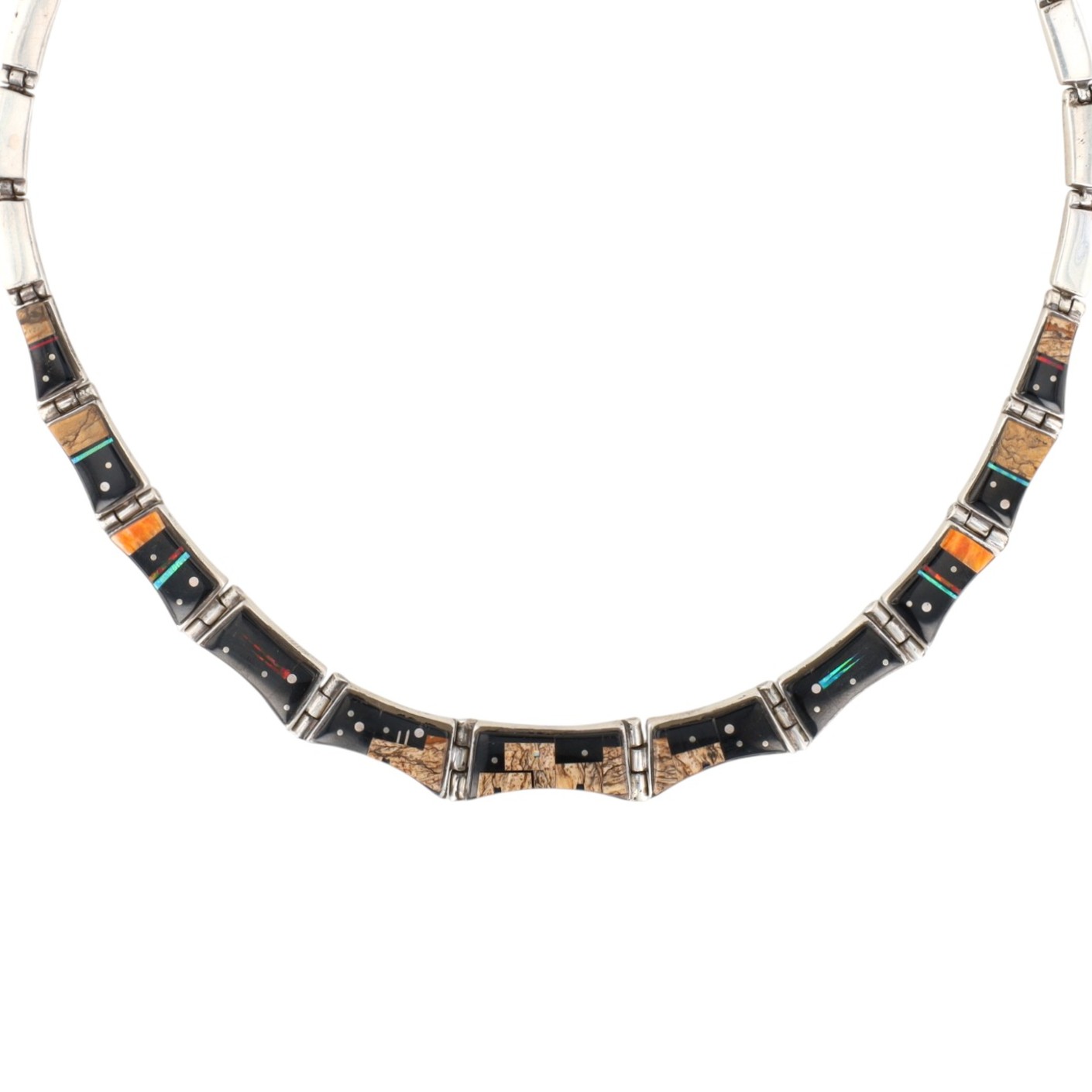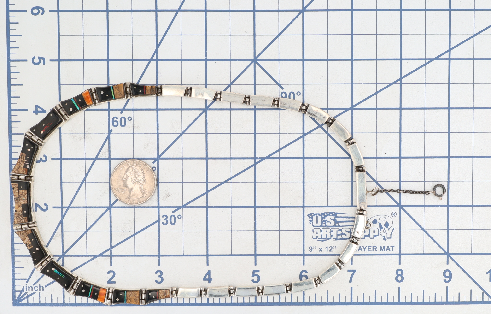 A segmented necklace of sterling silver with black and brown/tan stone inlay, accented by small orange, blue, and green stones, marked ‘OLSON CHARLESTON’, ‘H. Souih Of Santa Fe’, and ‘STERLING’, measuring approximately 16-17 inches long and weighing 67g.