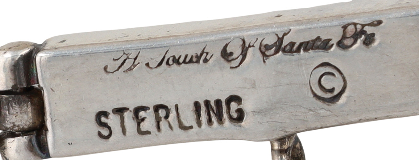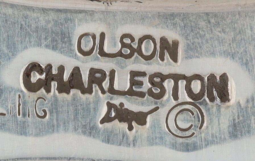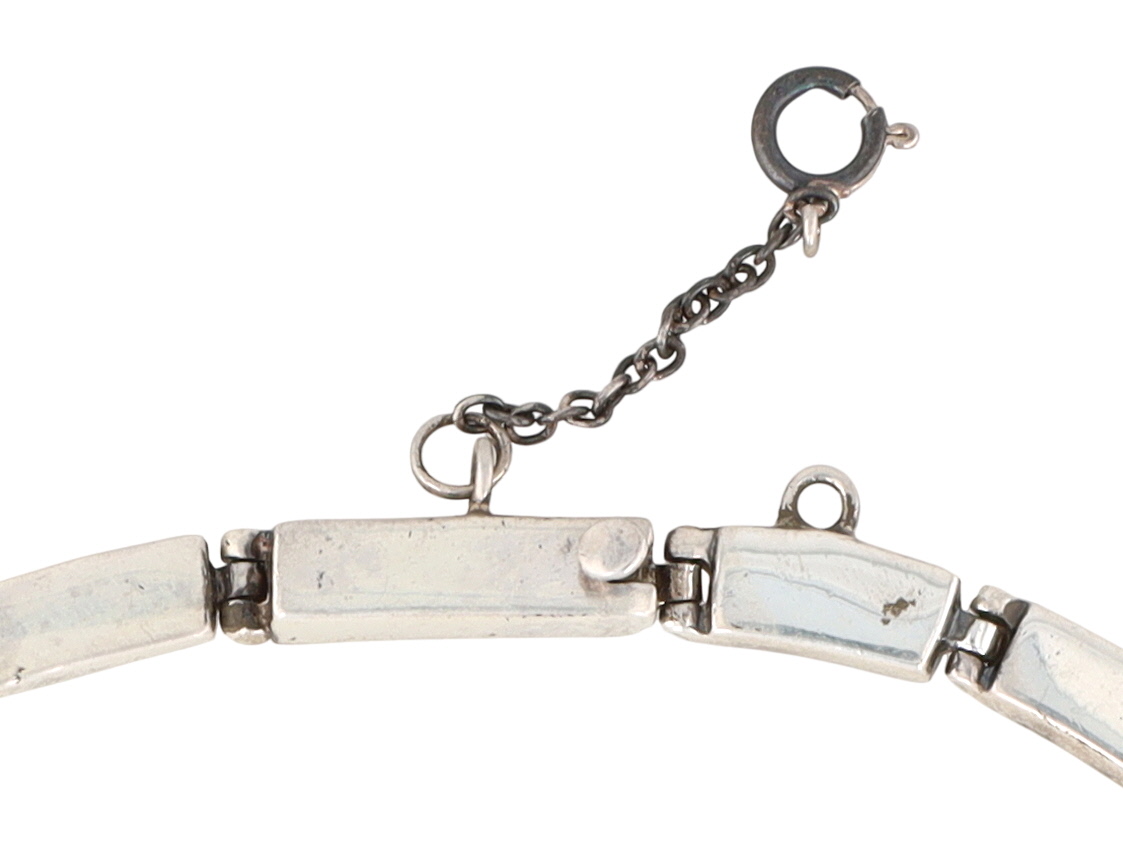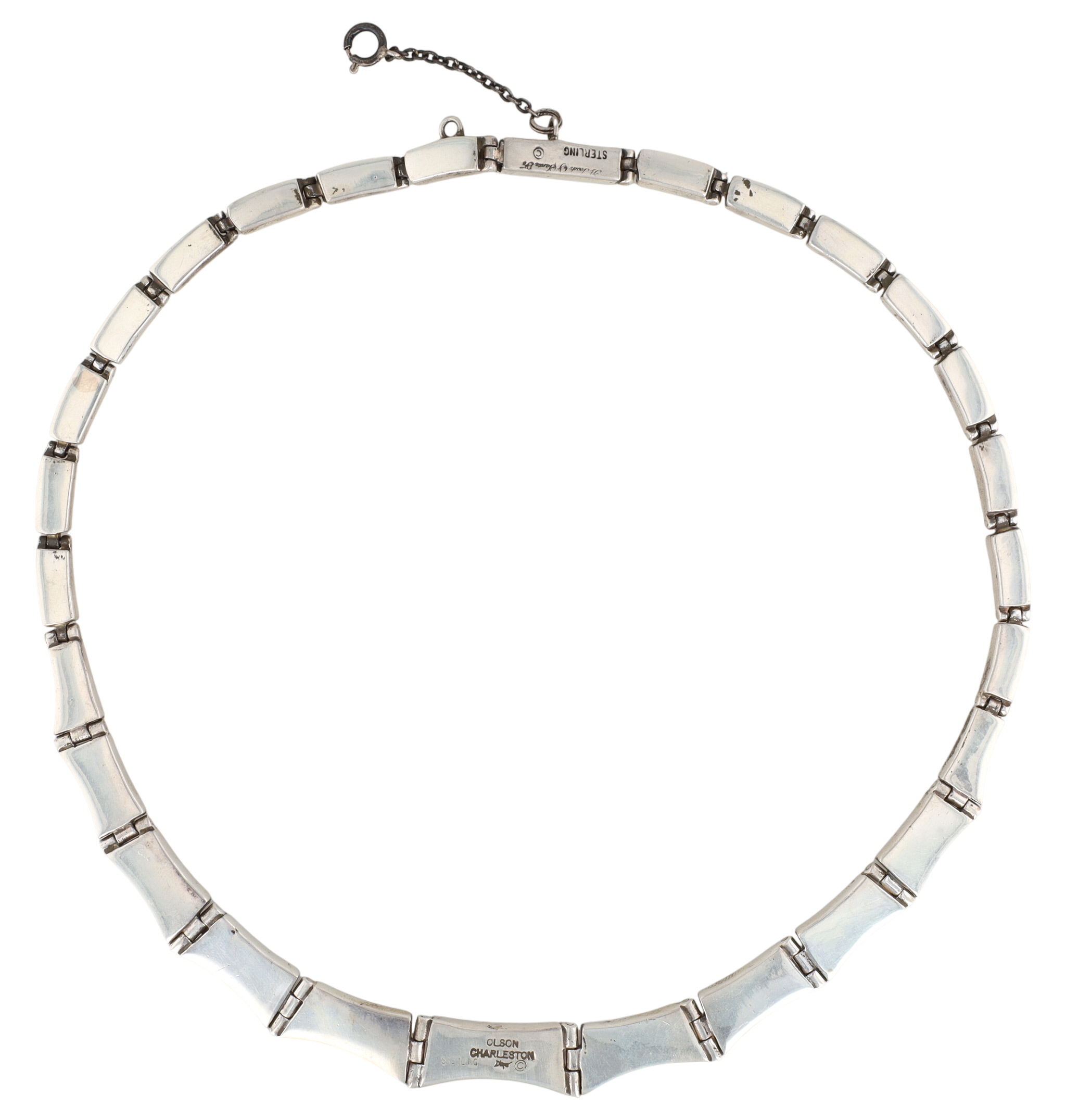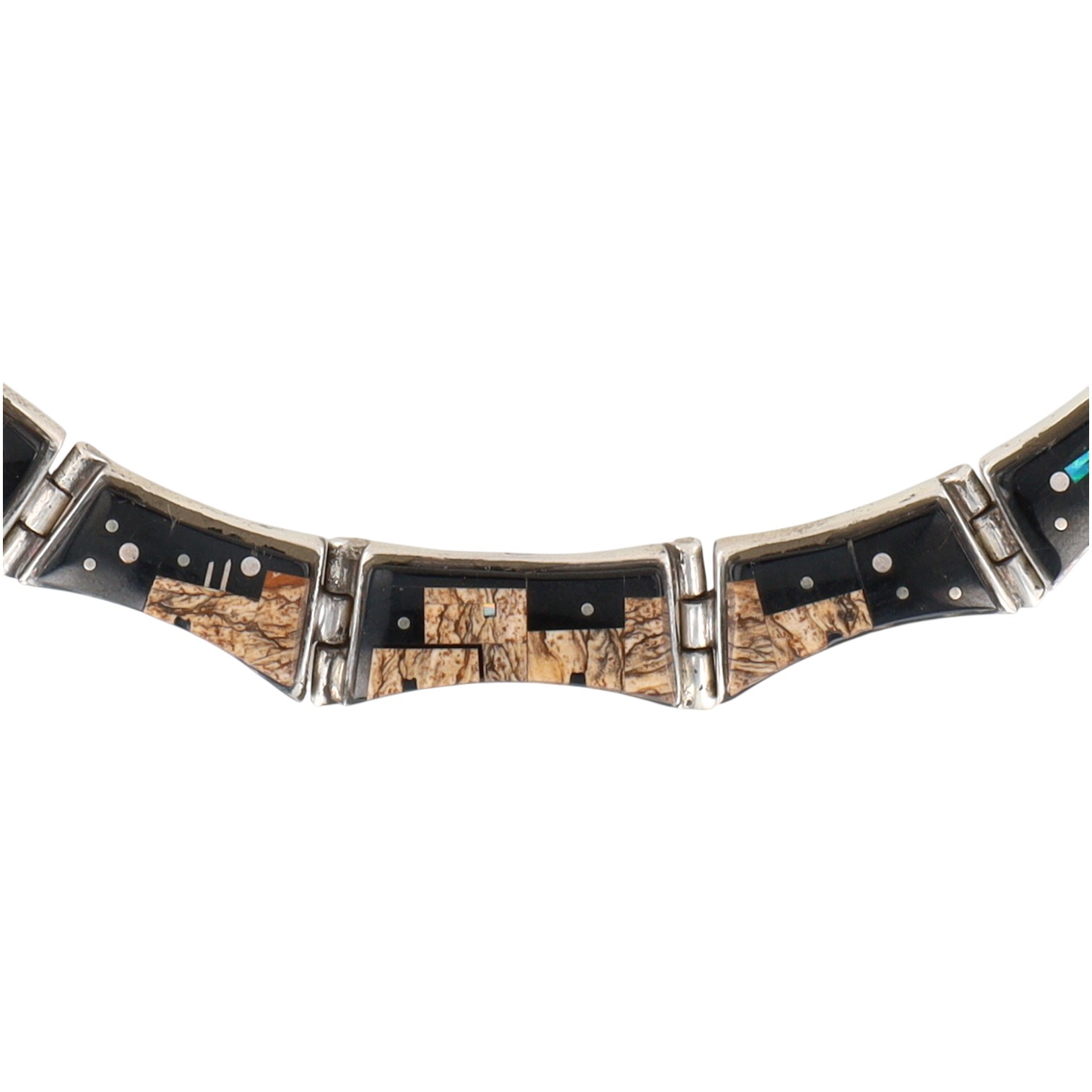 A segmented necklace of sterling silver with black and brown/tan stone inlay, accented by small orange, blue, and green stones, marked ‘OLSON CHARLESTON’, ‘H. Souih Of Santa Fe’, and ‘STERLING’, measuring approximately 16-17 inches long and weighing 67g.