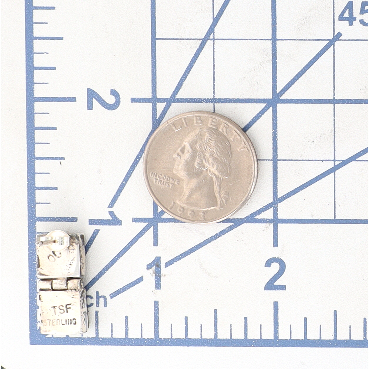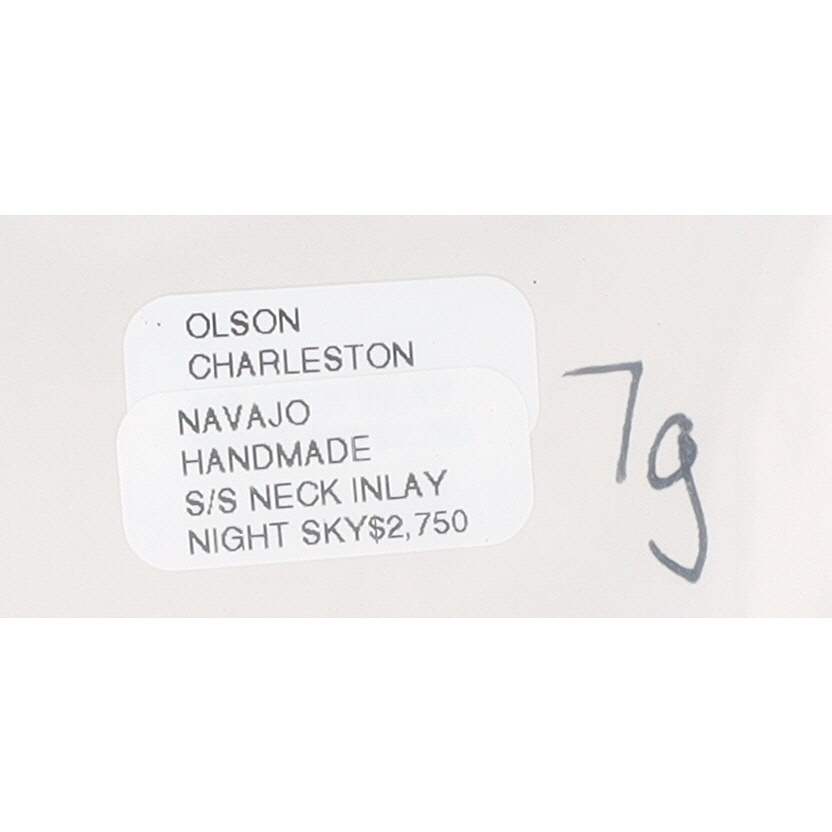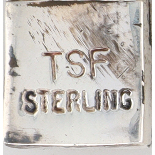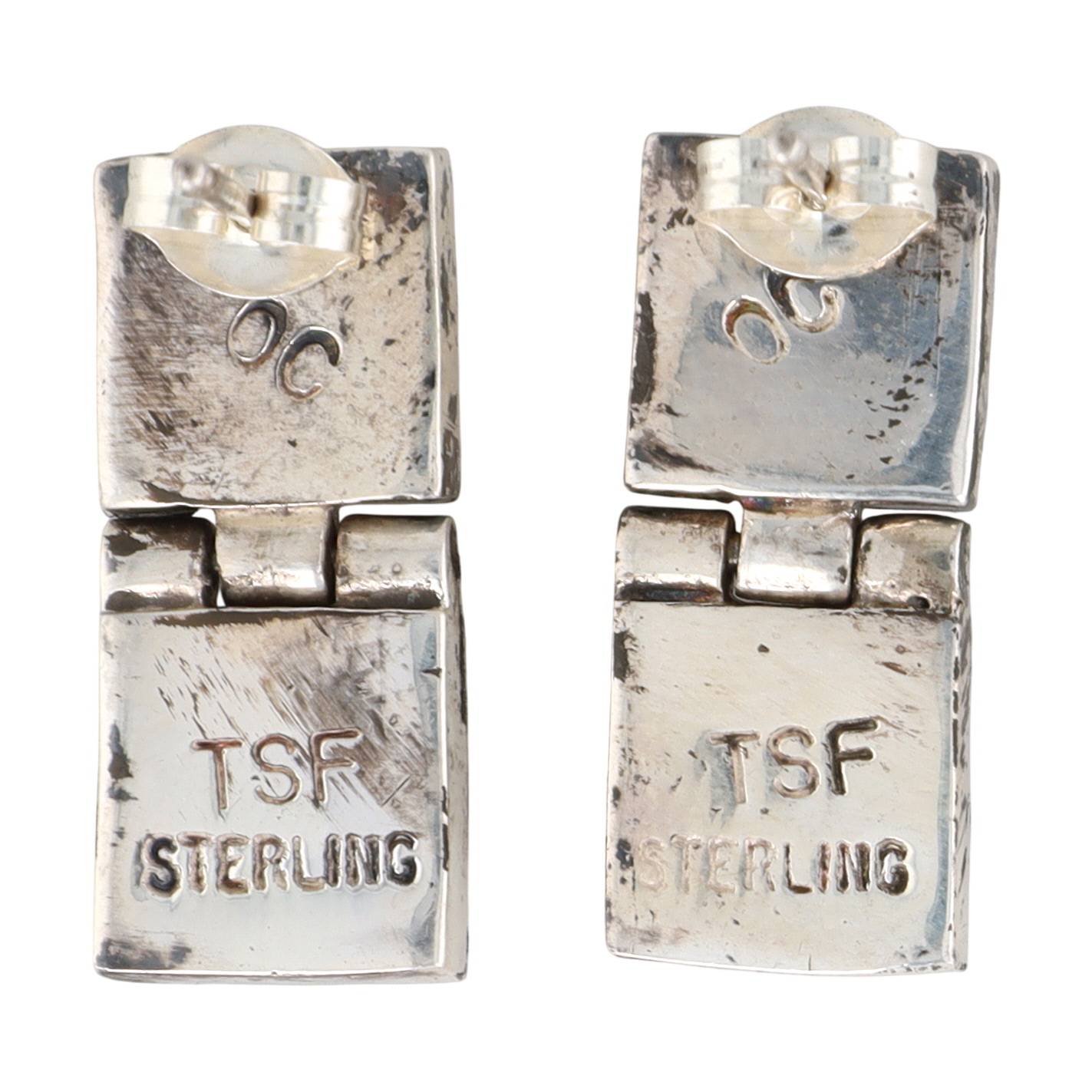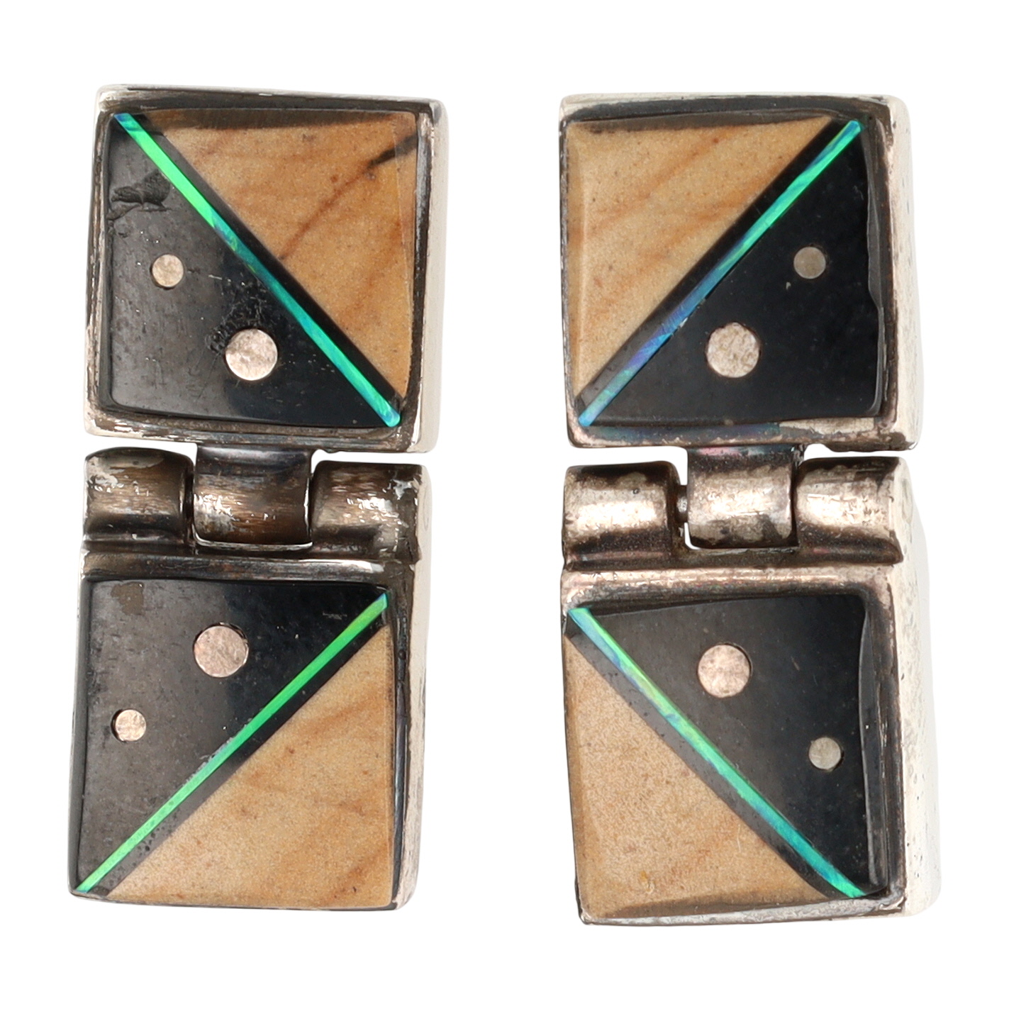 A pair of Navajo hinged, sterling silver earrings with onyx, picture jasper, opal, and small silver dots, marked “TSF” for Touch of Santa Fe, and “OC”, weighing 7g