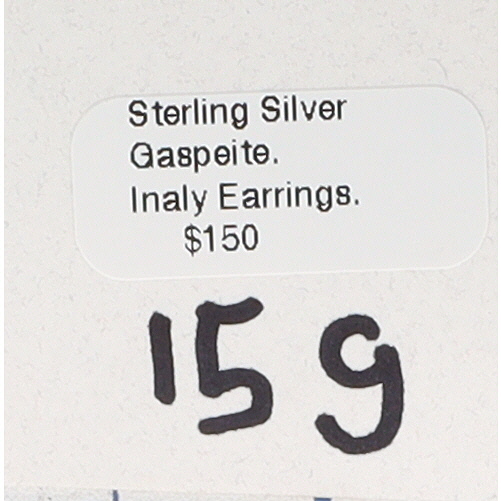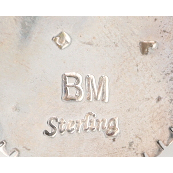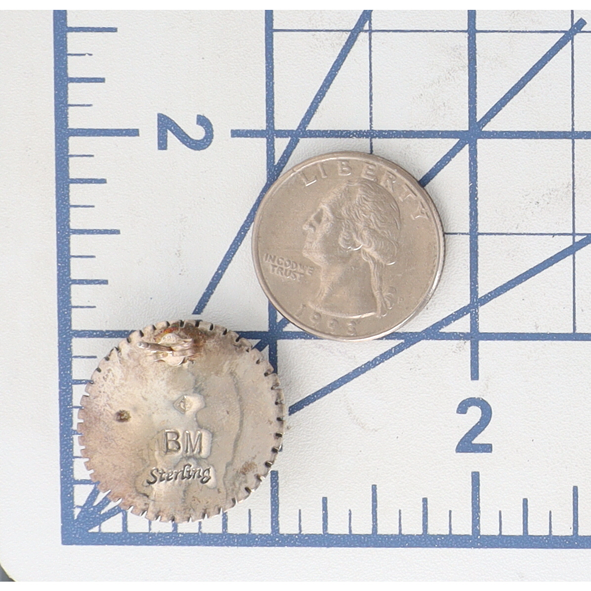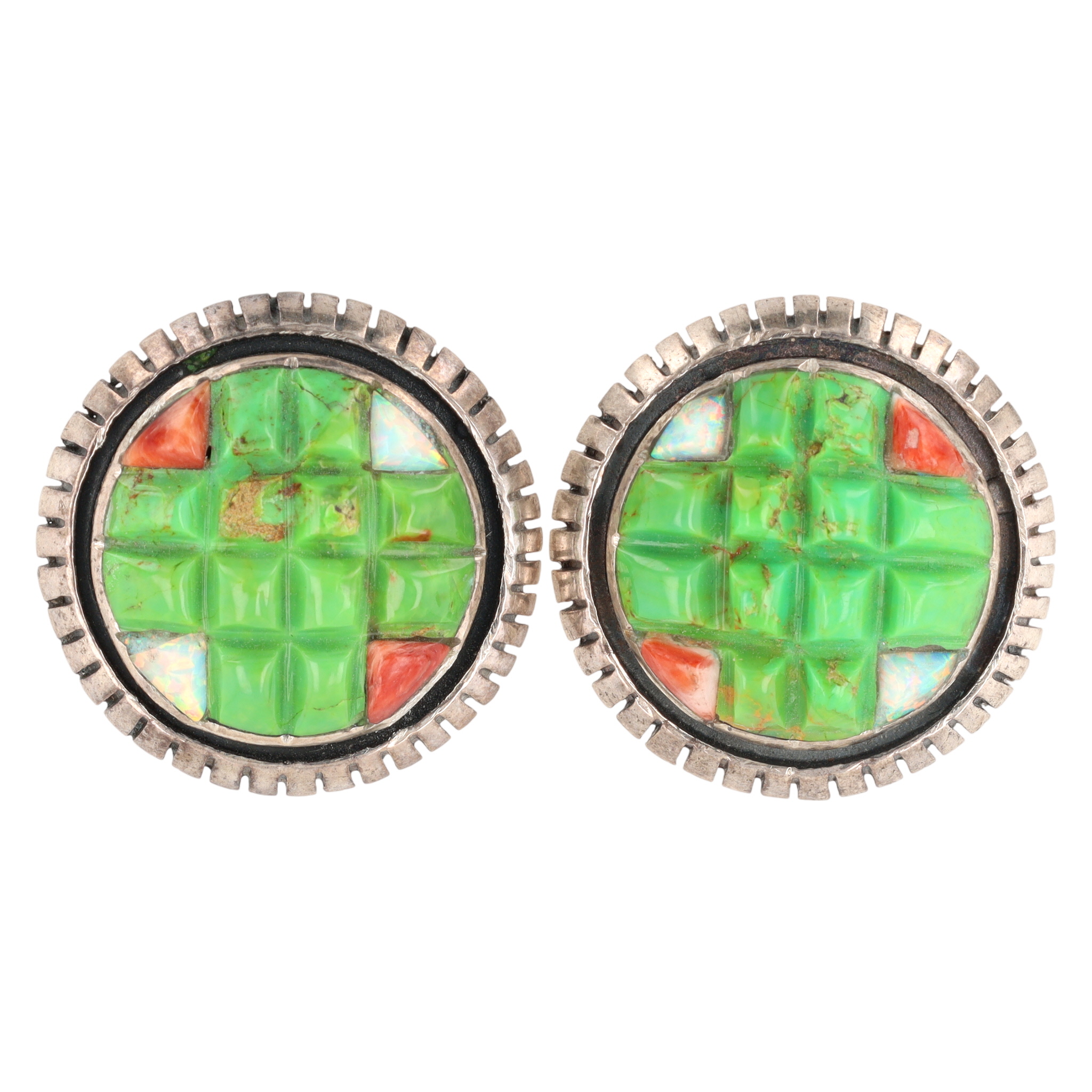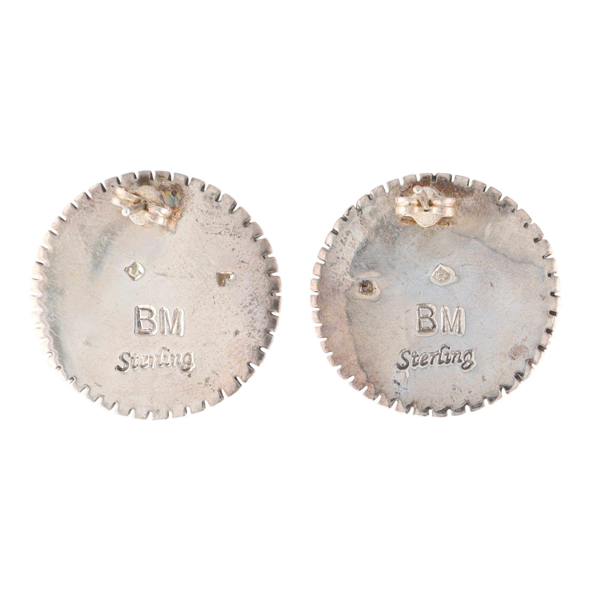A pair of round sterling silver carved Gaspeite inlay earrings, approximately 1 inch in diameter, 15g, accented by opal and spiny oyster, marked ‘BM Sterling’ on the back.