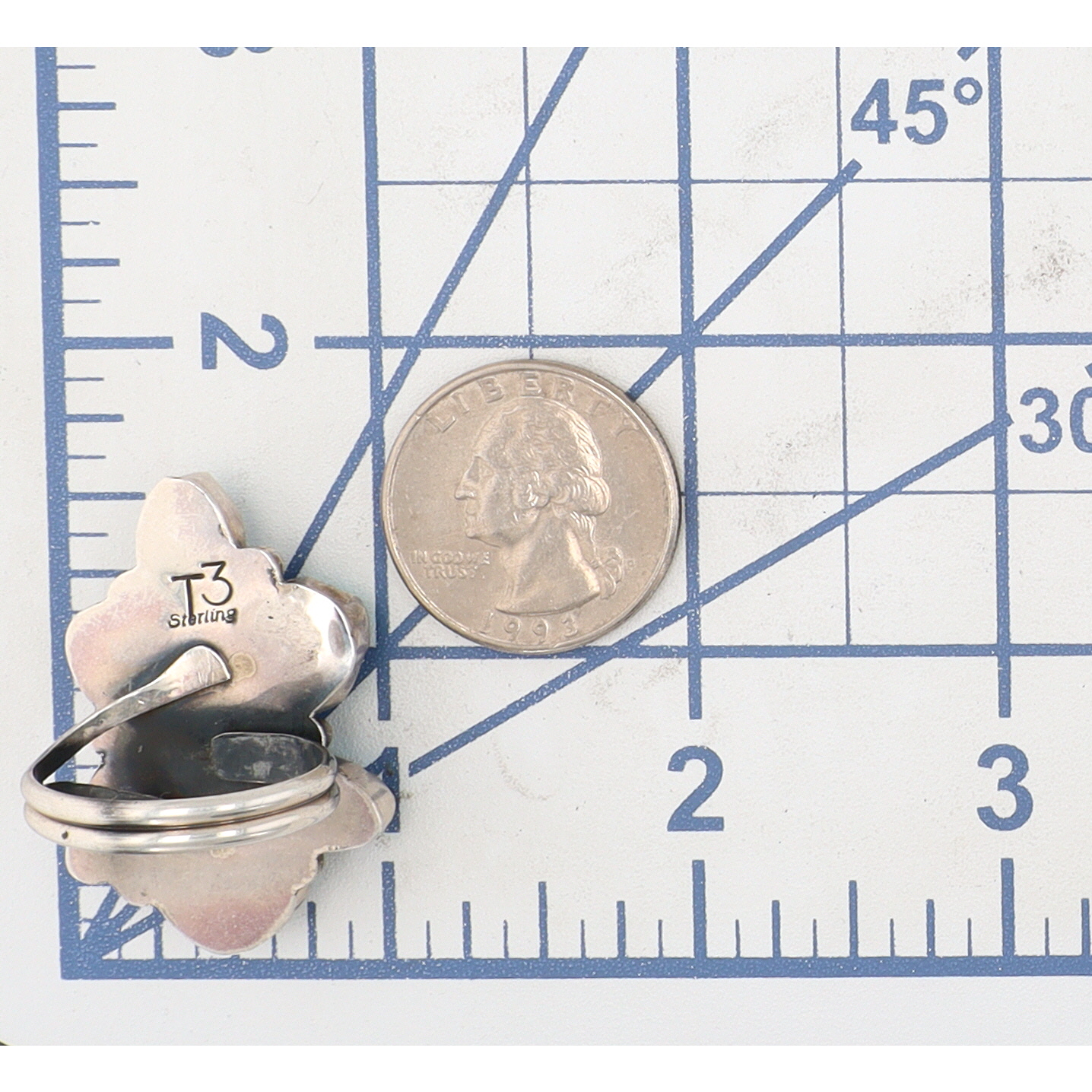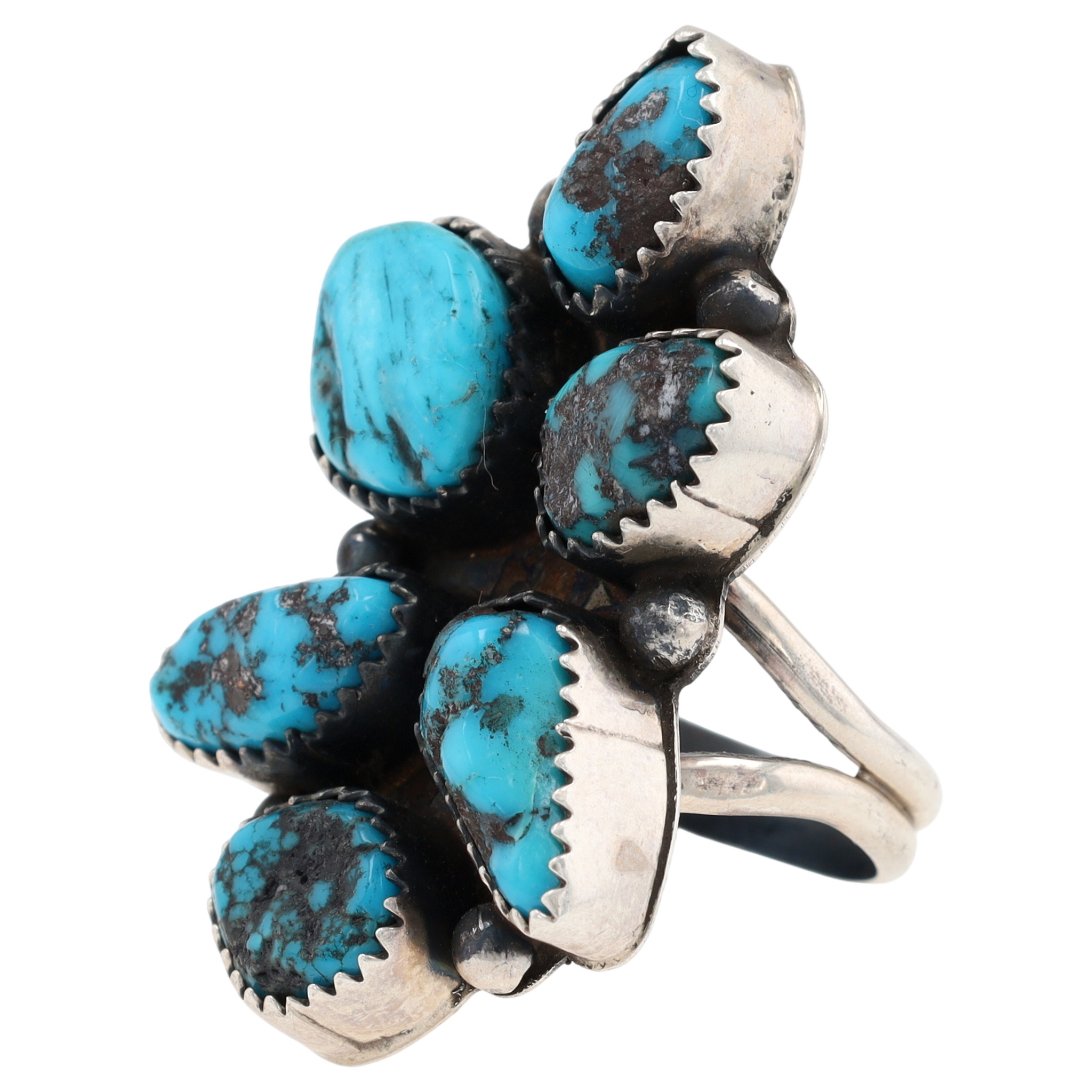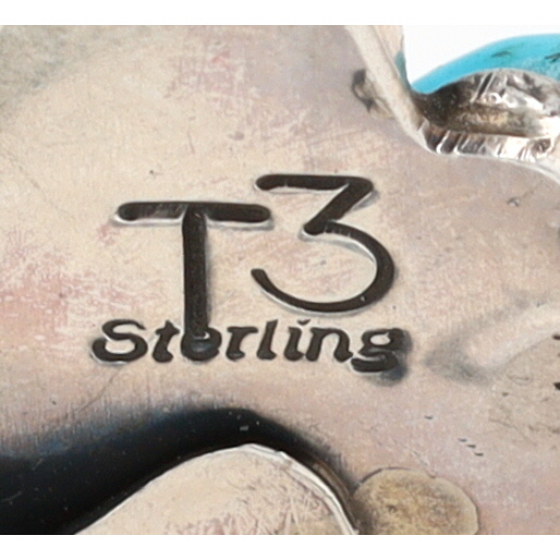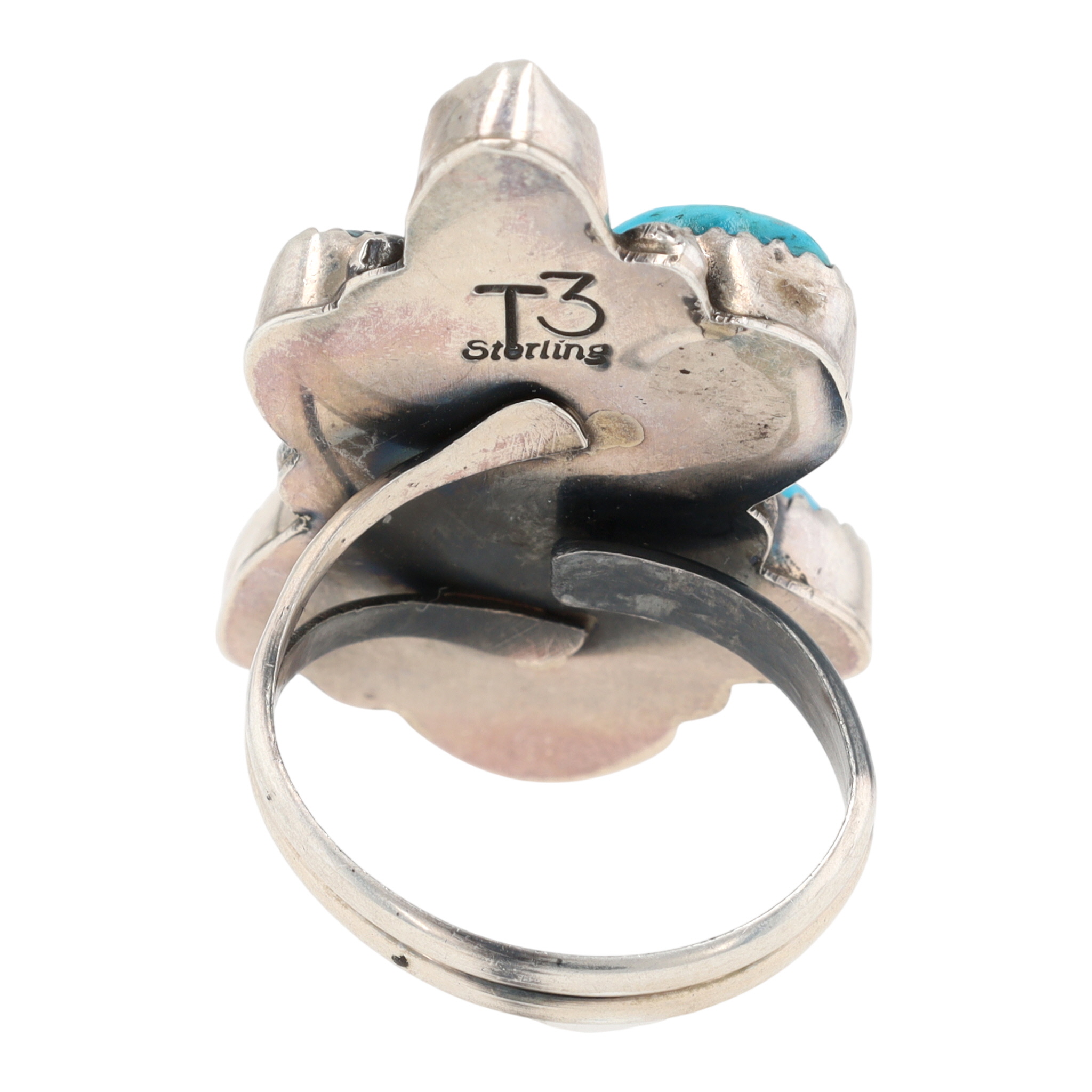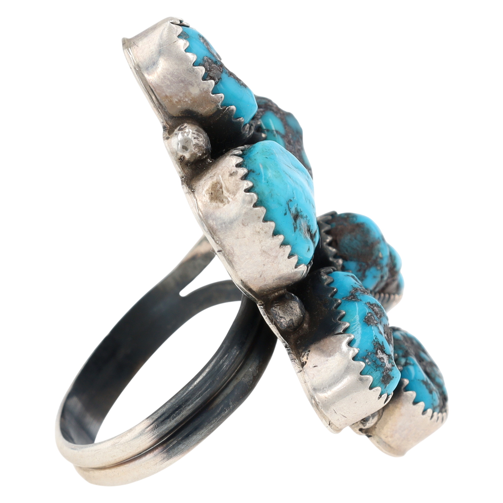 A Tia Long Navajo Sterling ring adorned with multiple blue-green turquoise stones, measuring approximately 1.5 inches long, inscribed “T3” and “Sterling”, weighing 11.5g, and core sized 7.5