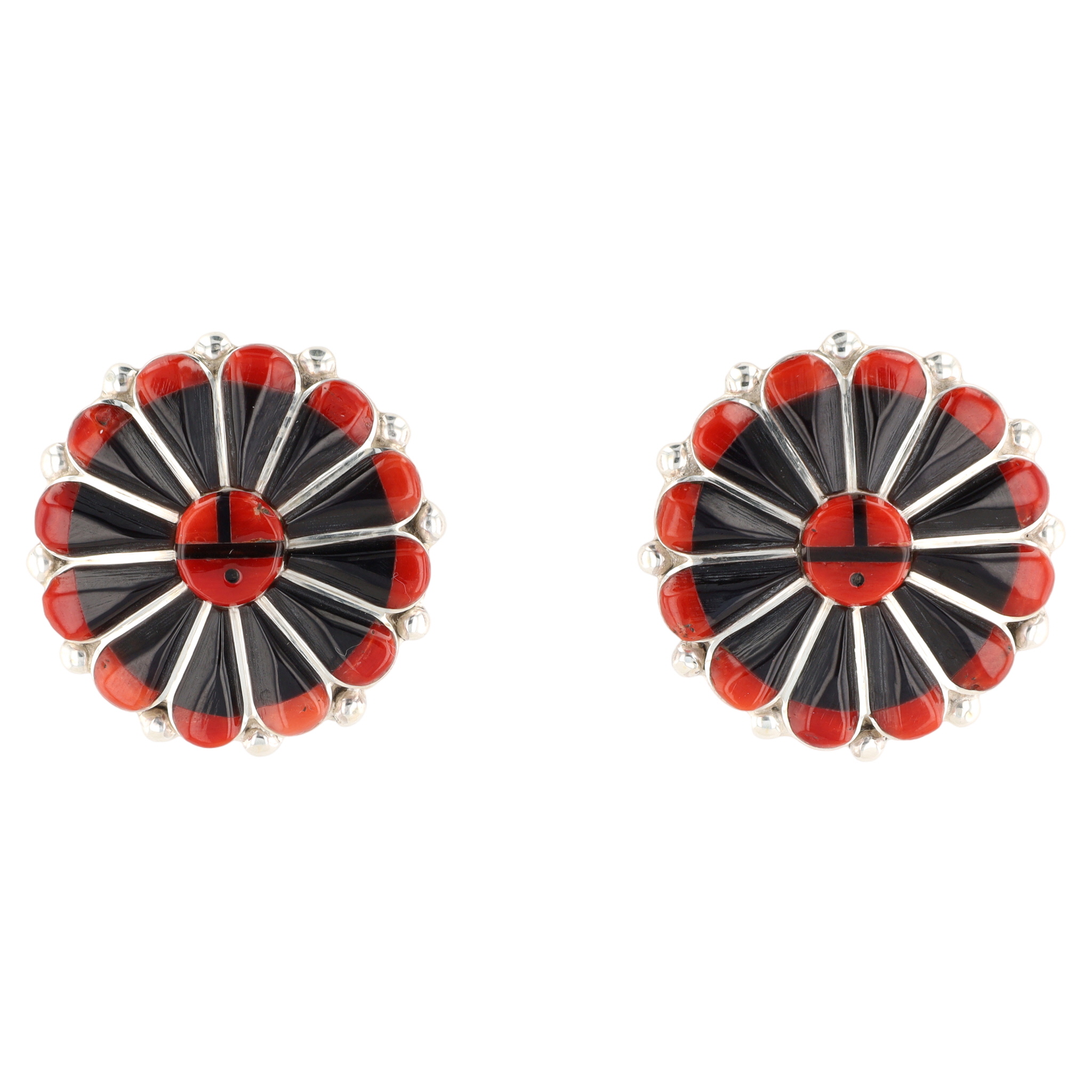 W&C Niiha Zuni Sterling Coral Onyx Sunface Earrings