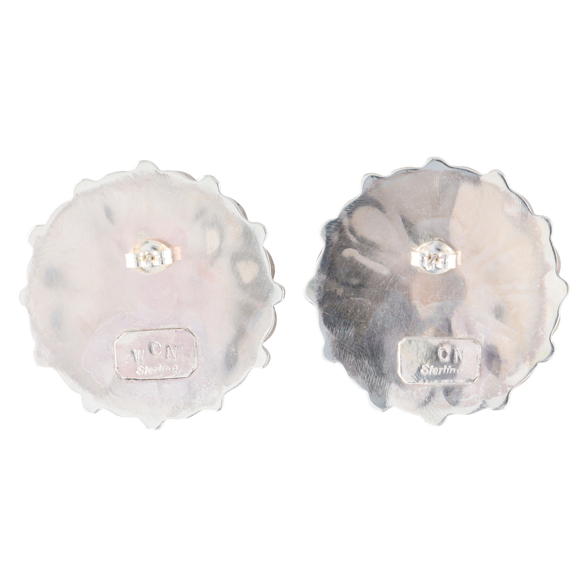 Wilson & Carolyn Niiha Zuni sterling, coral, onyx Sunface inlay earrings, each marked on the back with “WCN” and “Sterling”, measuring approximately 1 inch in diameter, weighing 22g