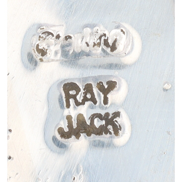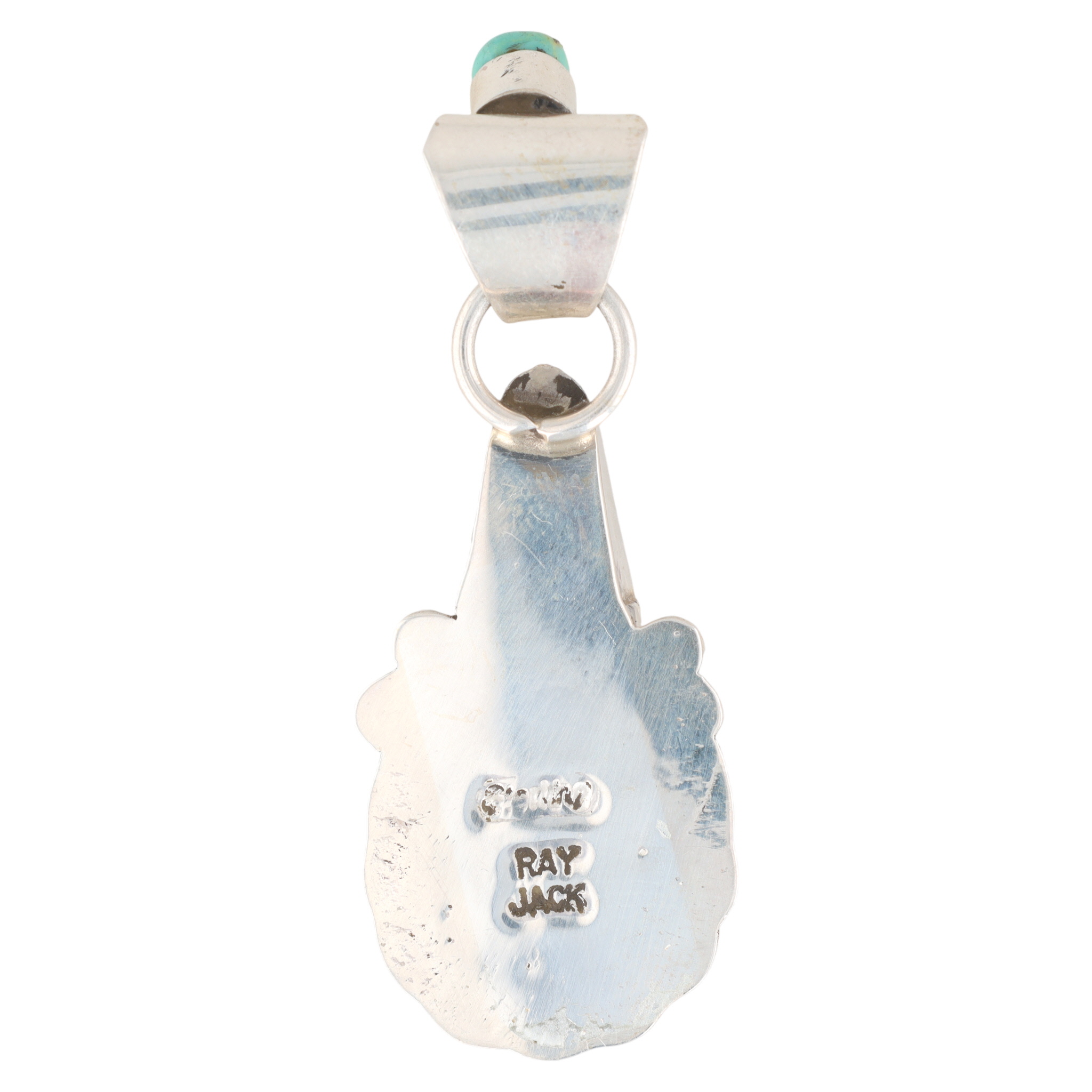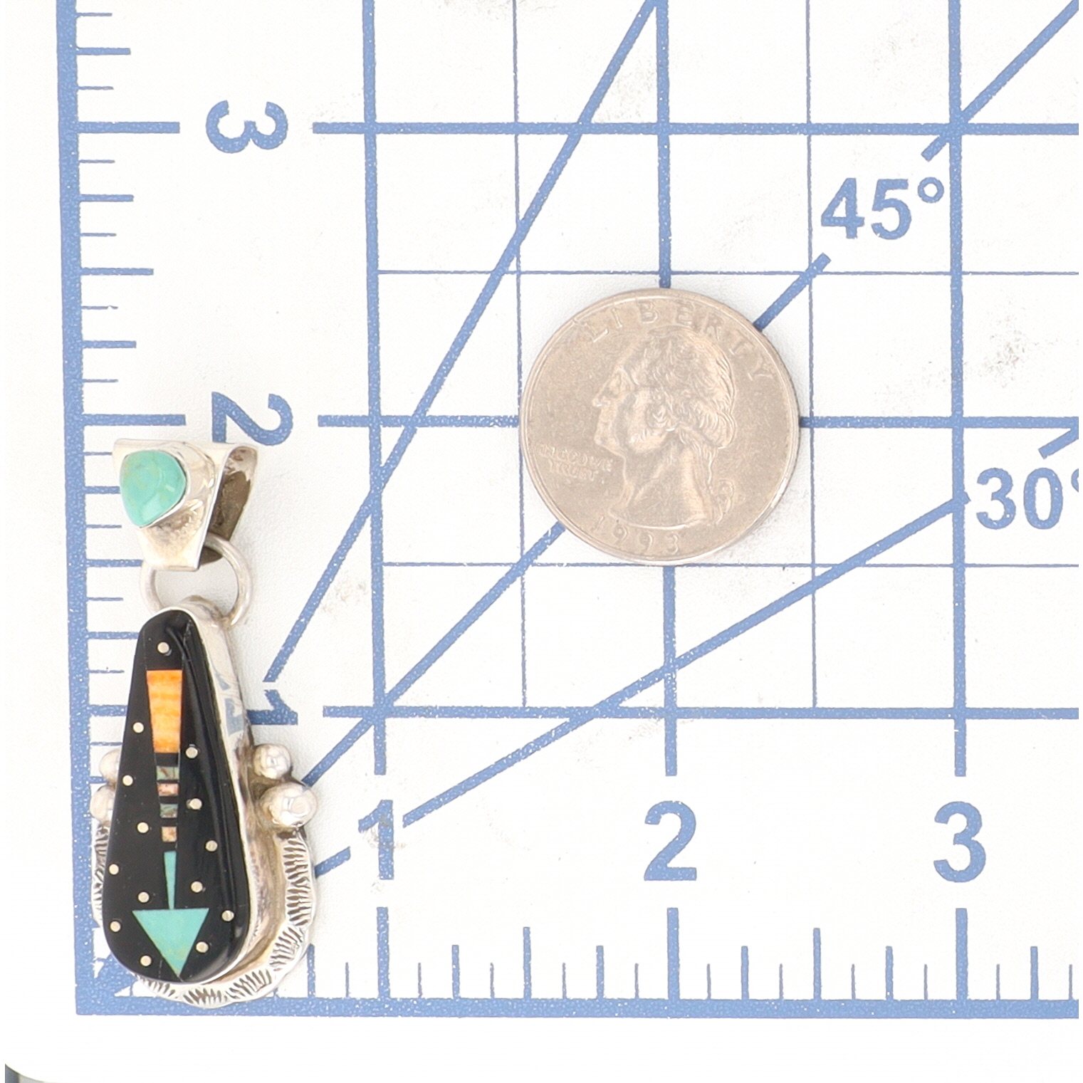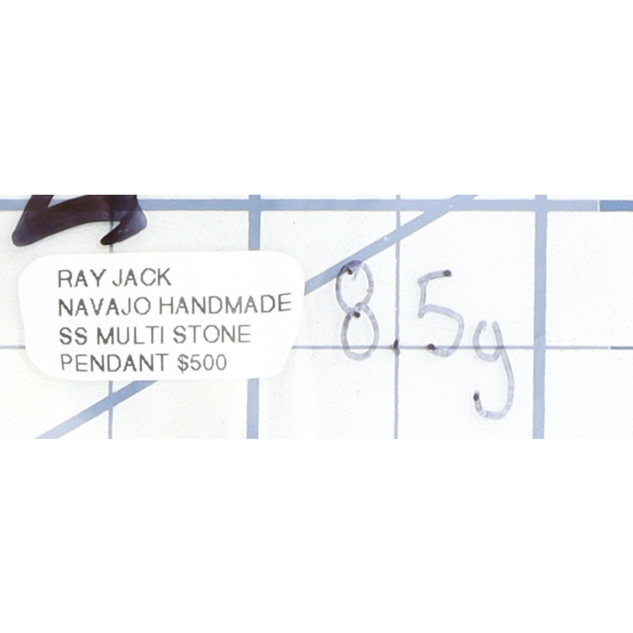 A Ray Jack Navajo sterling multi-stone inlay pendant in onyx, spiny oyster, turquoise, marked “STERLING” and “RAY JACK”, weighing 8.5g and measuring approximately 1.75 inches long.