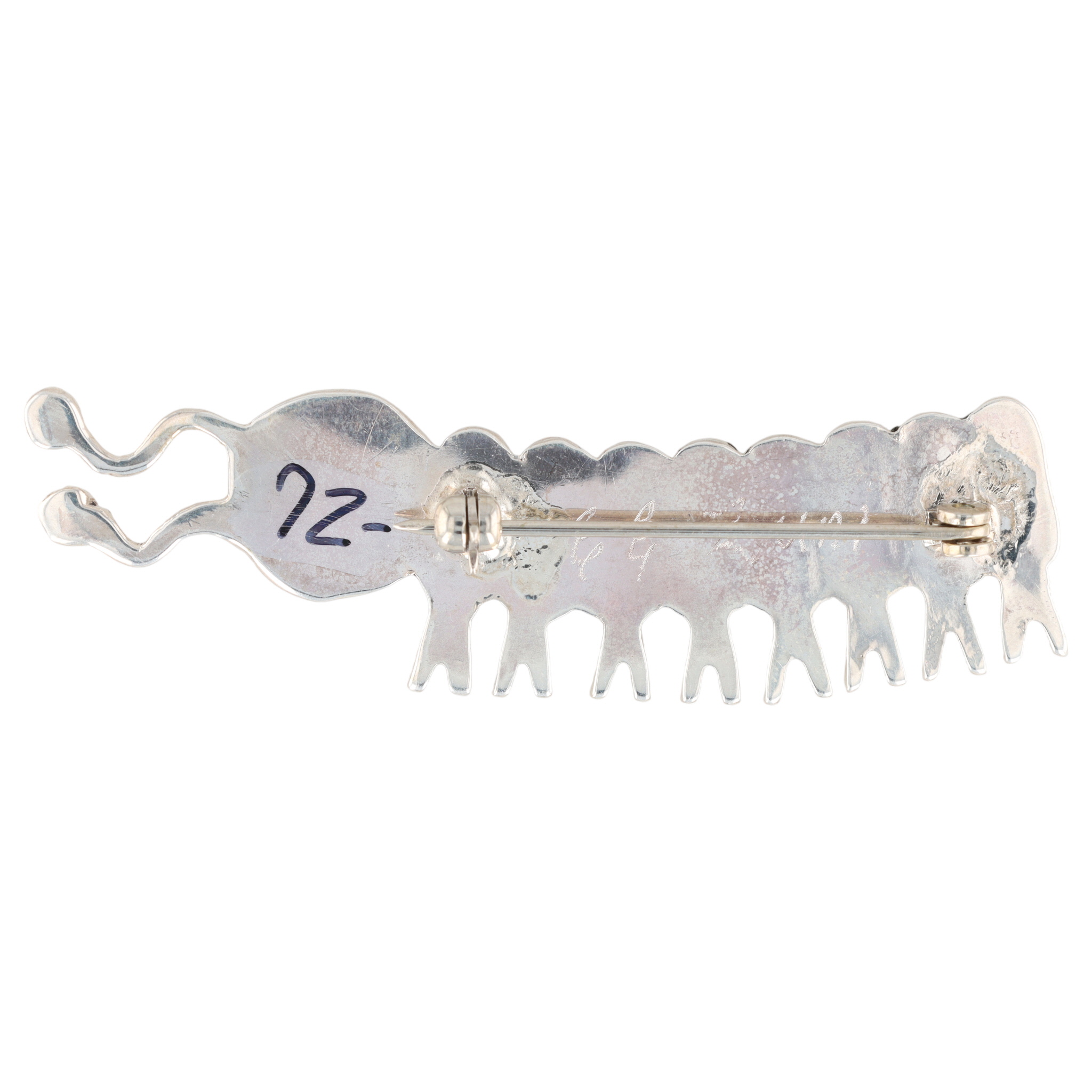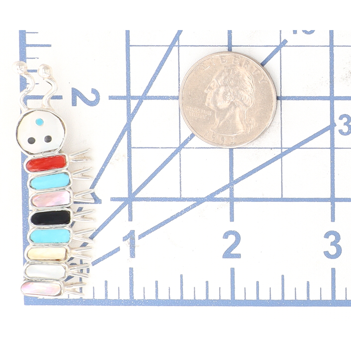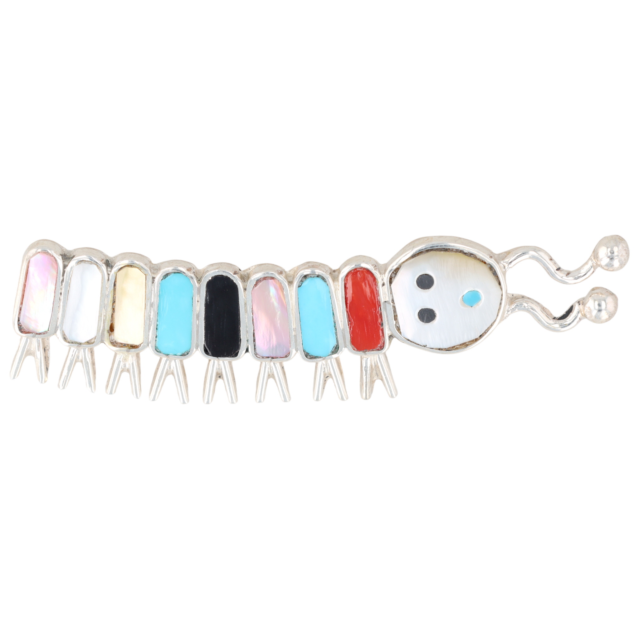 A Earline Edaakie Zuni sterling silver caterpillar-shaped brooch with abalone, mother-of-pearl, turquoise, onyx, coral, marked “E.E. Zuni”, weighing 6.5g and measuring approximately 2.25 inches long.