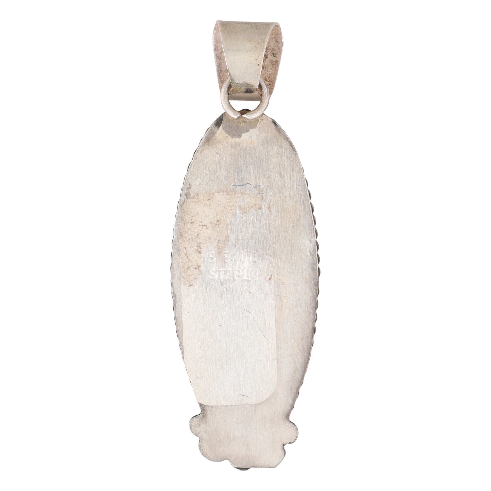 A Scott Skeets Navajo sterling silver pendant featuring an oval Kingman turquoise and brown/orange stone, marked ‘S SKEETS STERLING’, weighing 10.5g, and measuring approximately 2.25 inches long.