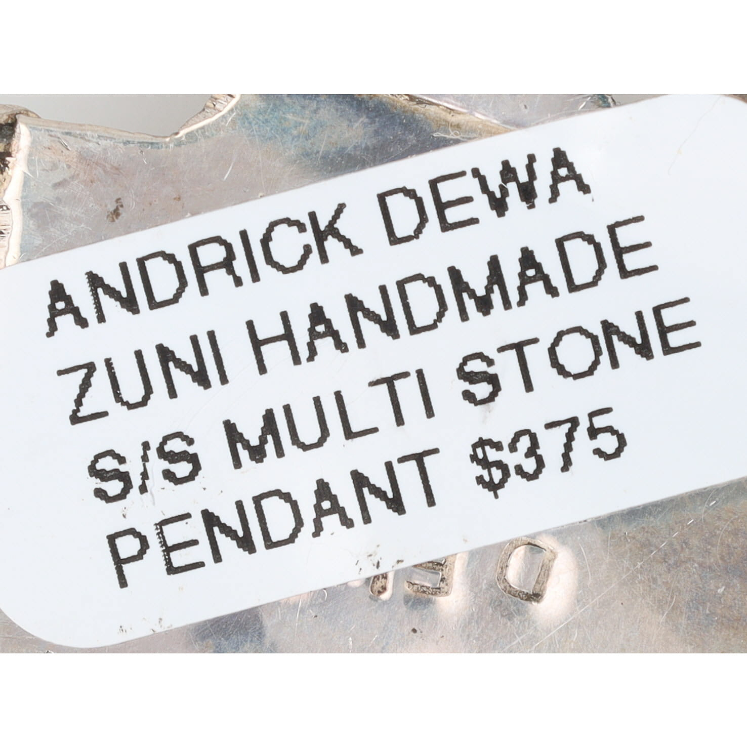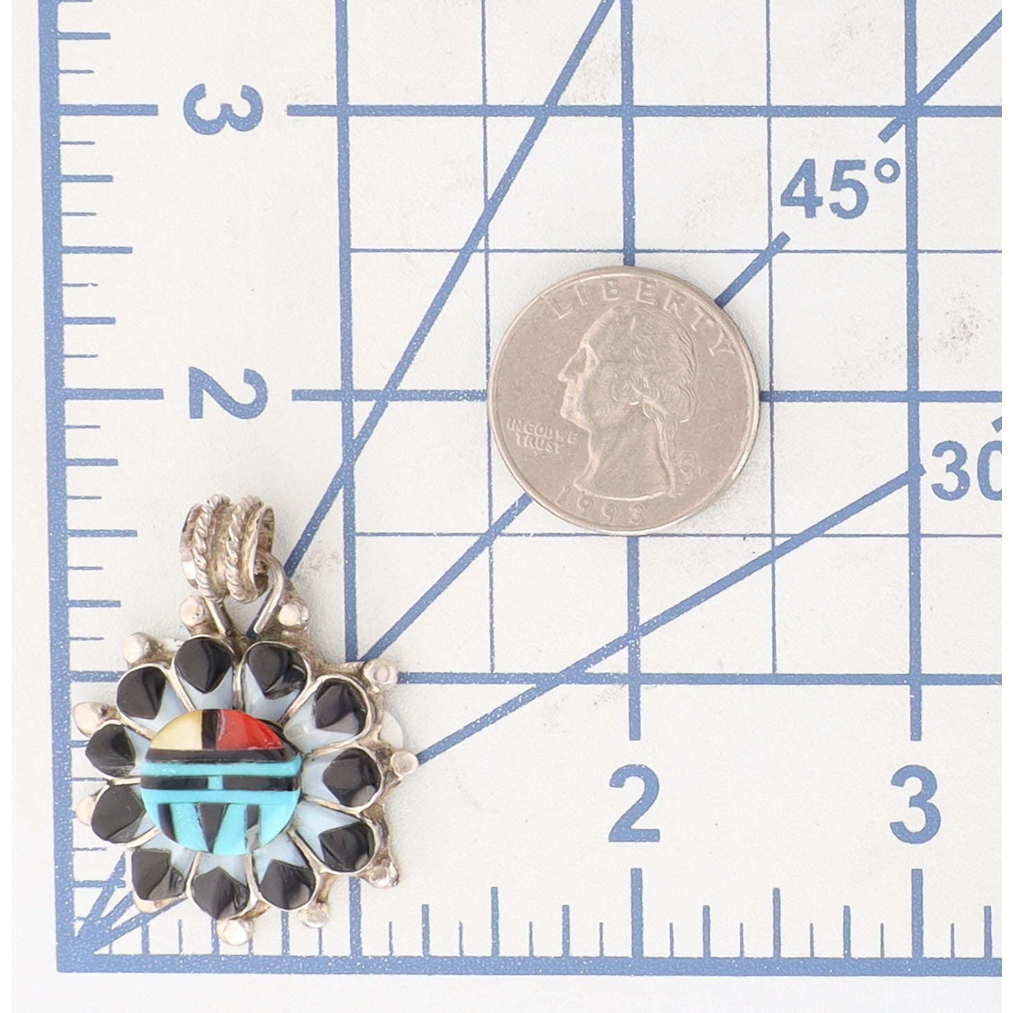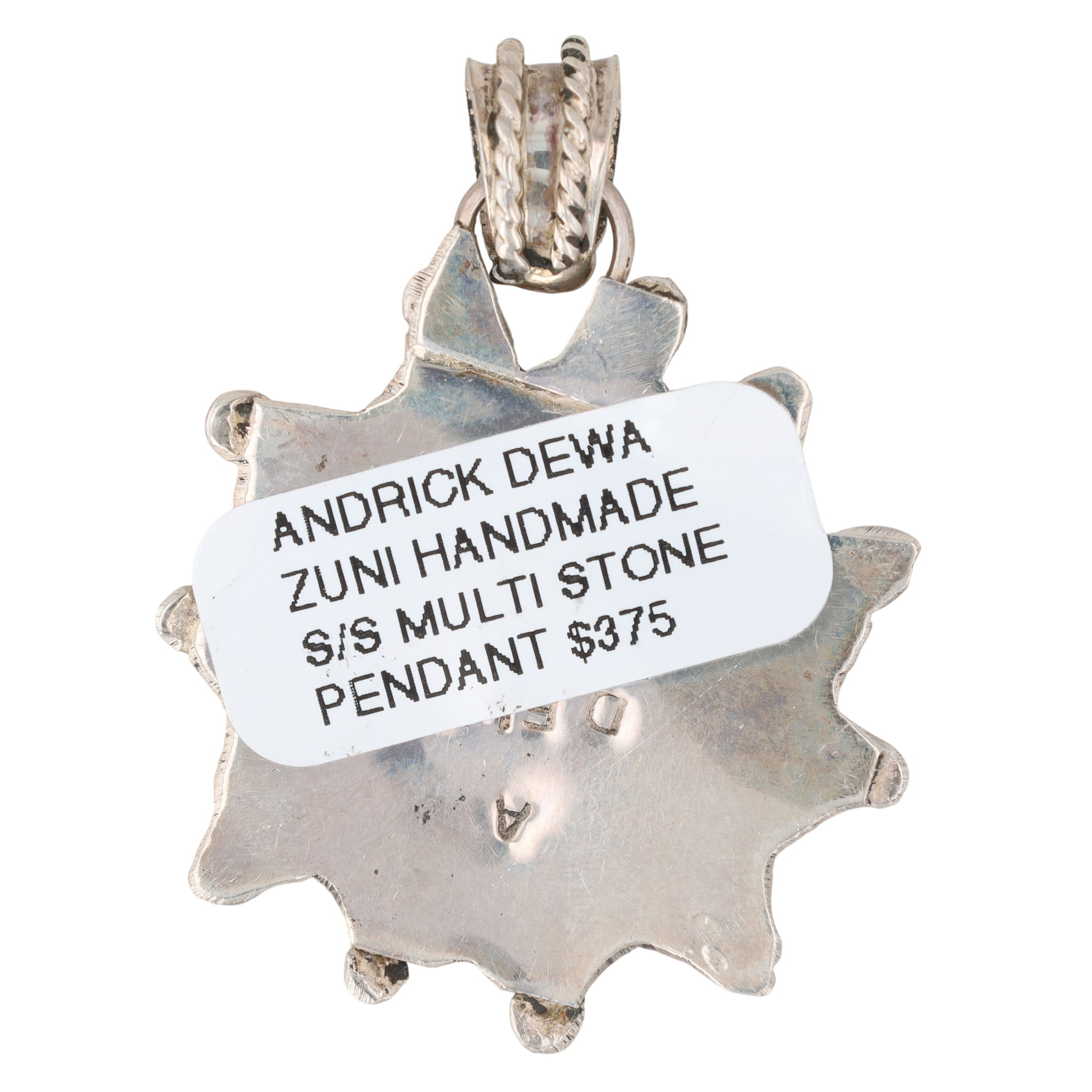 A Zuni handmade sterling silver Sunface pendant by Andrick Dewa, featuring onyx, mother-of-pearl, turquoise, coral inlay, weighing 8g and measuring approximately 1.5 inches.
