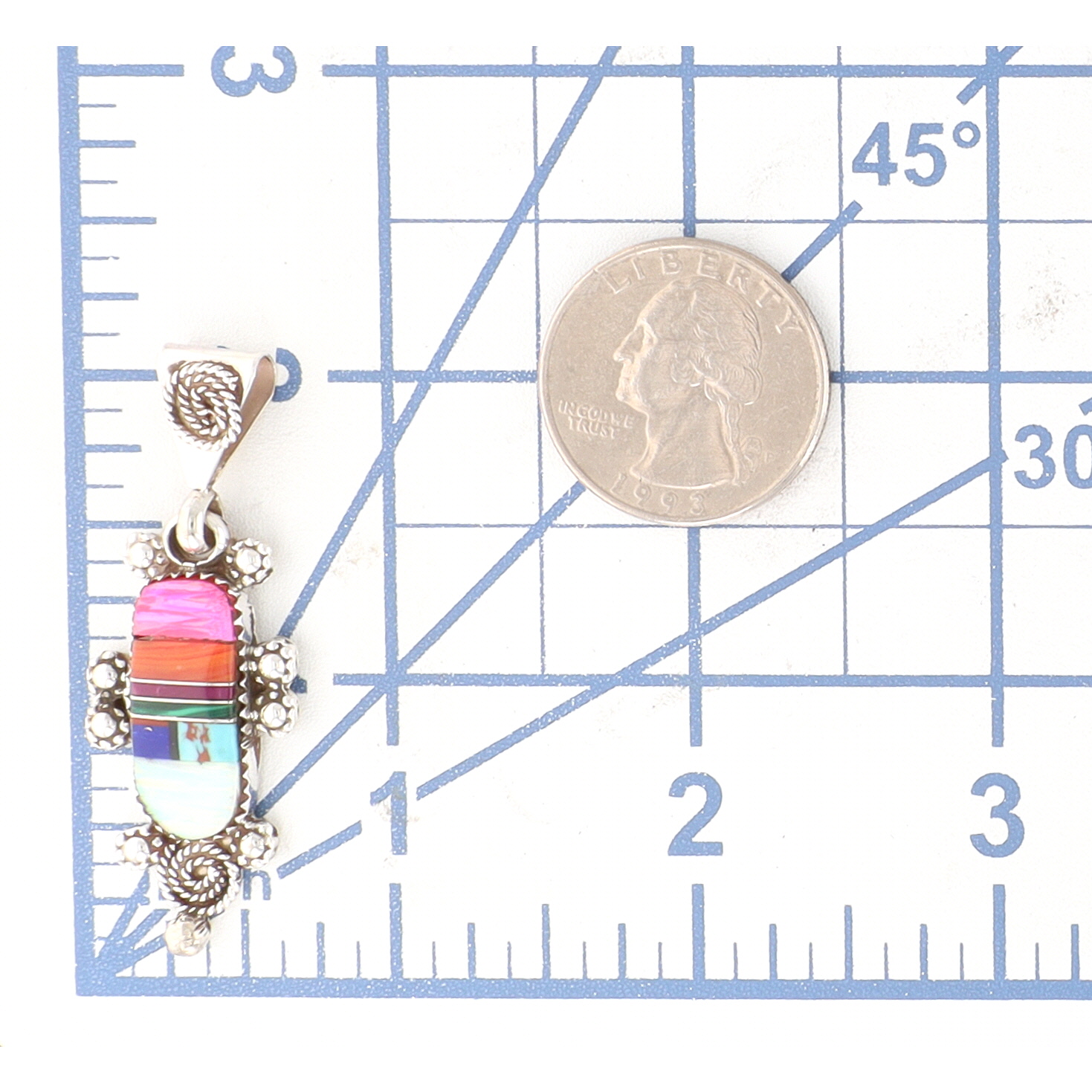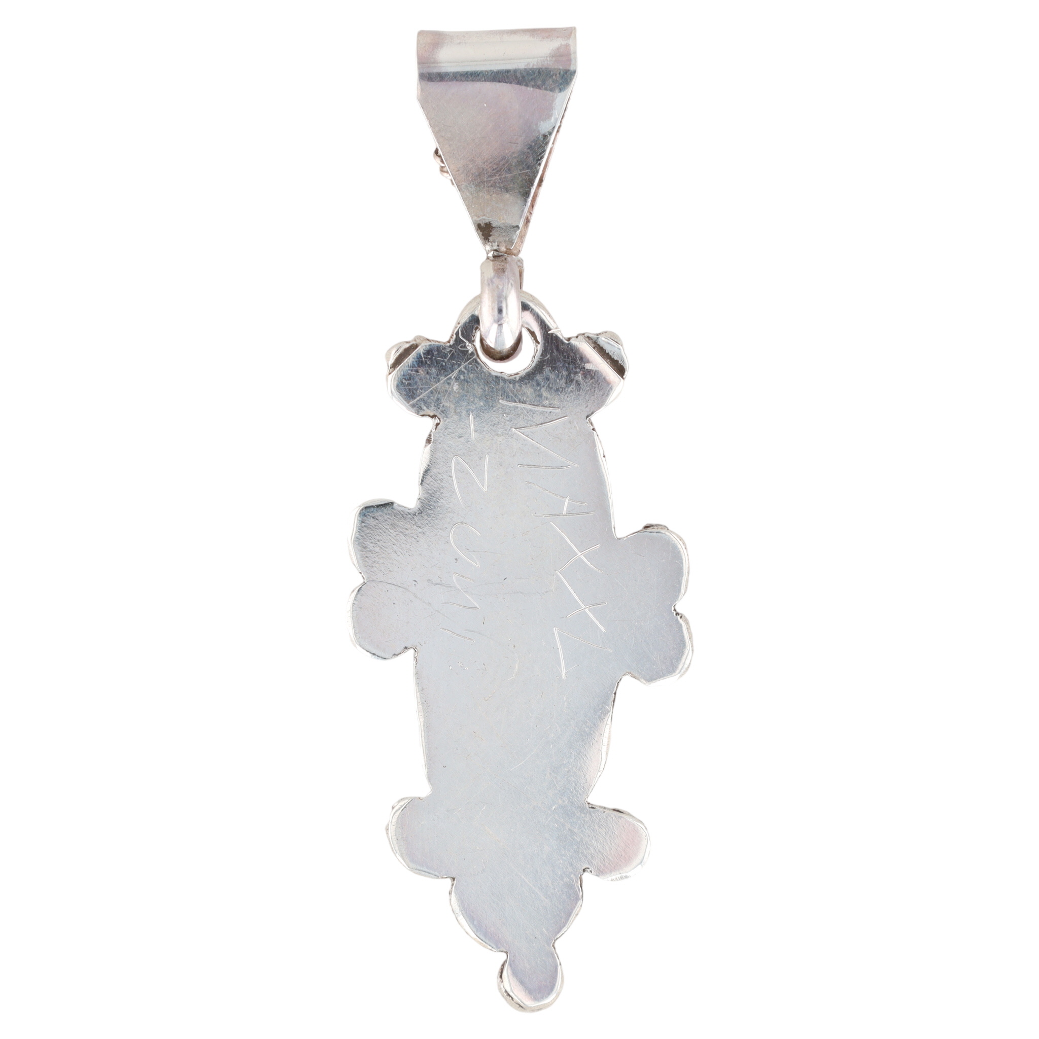Maxx Laate Zuni Sterling Multi-Stone Inlay Pendant, measuring approximately 1.5 inches, weighing 5.5g, made of opal, lapis, onyx, malachite, coral, spiny oyster, and purple spiny oyster