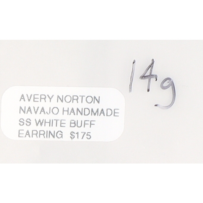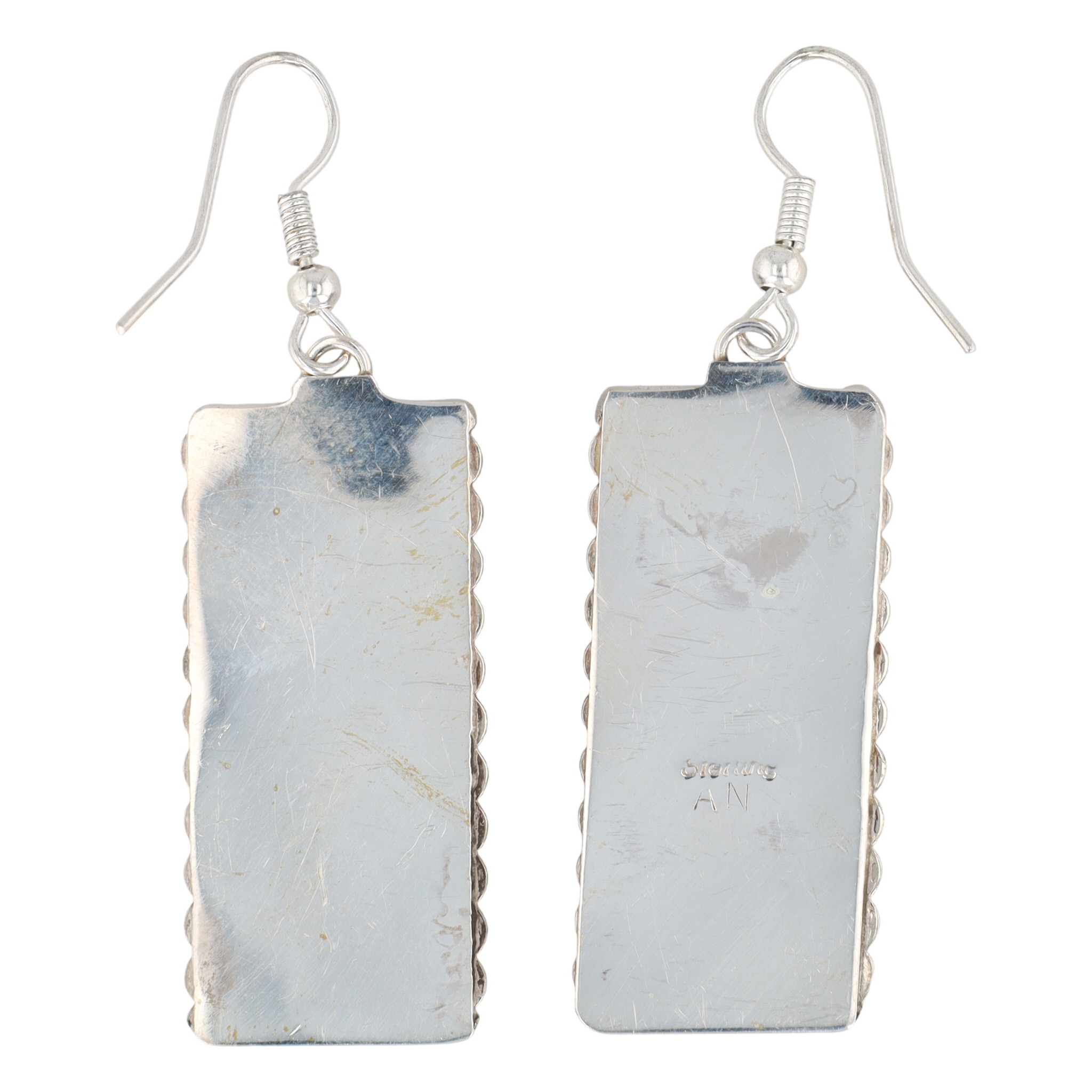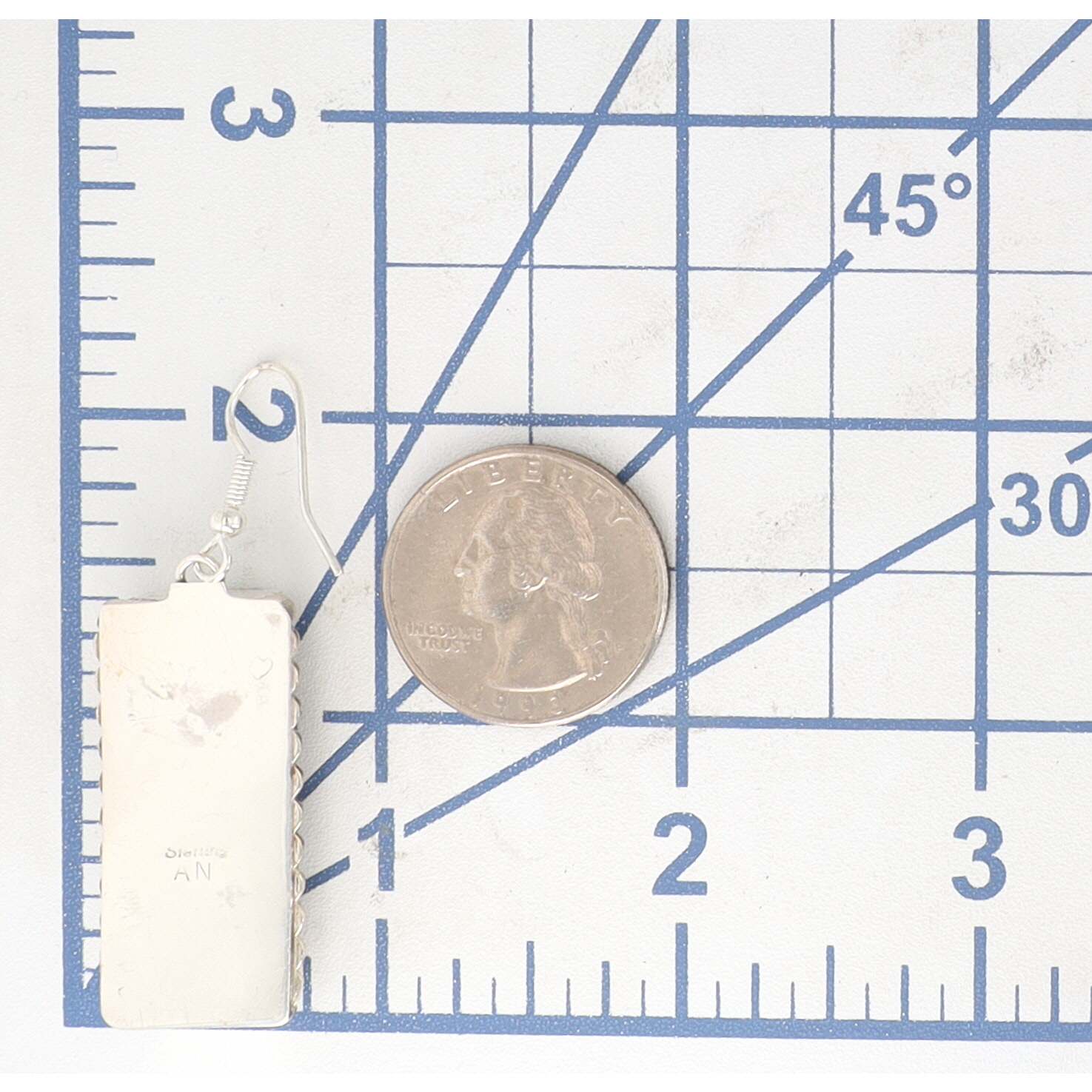 A pair of Avery Norton Navajo handmade sterling silver dangle earrings, featuring rectangular white and black marbled white buffalo stone inlay, marked ‘Sterling’ and ‘AN’, measuring approximately 2 inches long and weighing 14g.