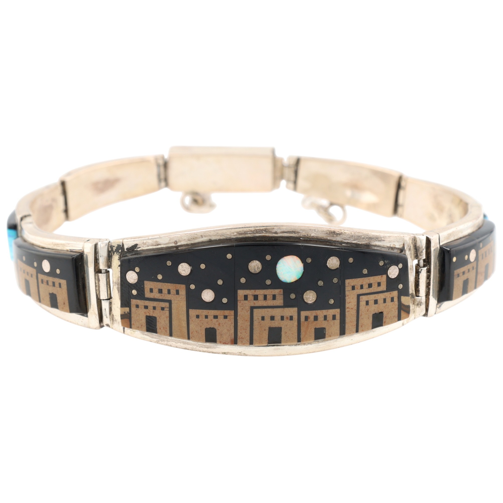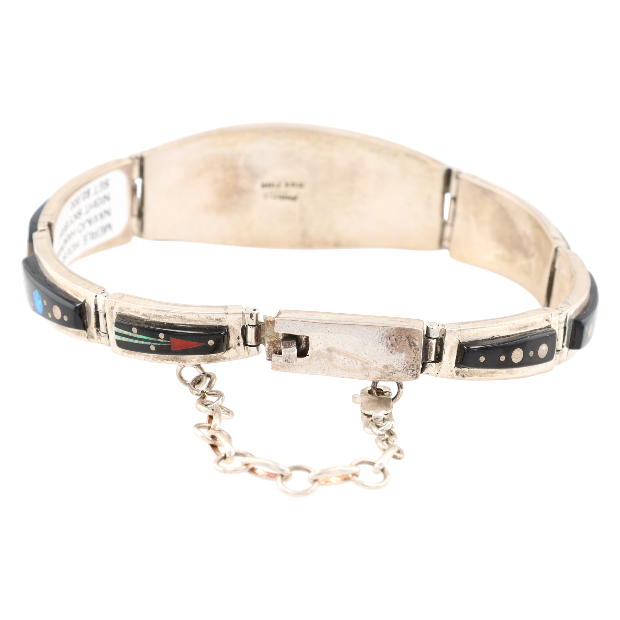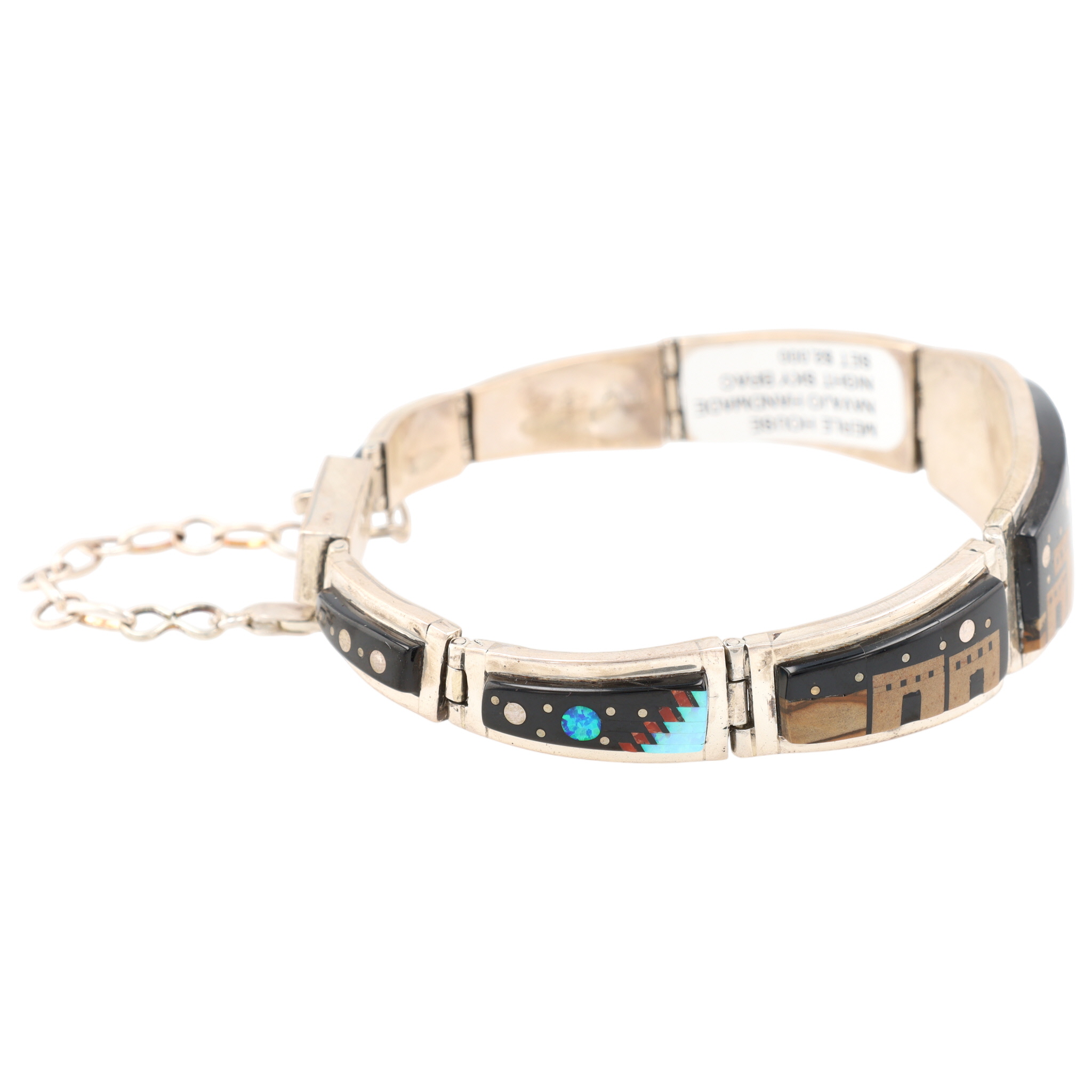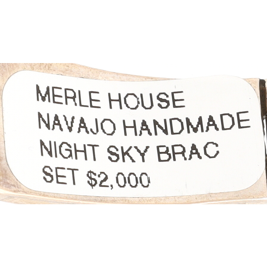 A silver inlaid bracelet, marked “MERLE HOUSE” and “STERLING”, featuring a Navajo handmade night sky design, weighing 50g and measuring approximately 8.5 inches long, and consisting of onyx, opal, coral, brown jasper.