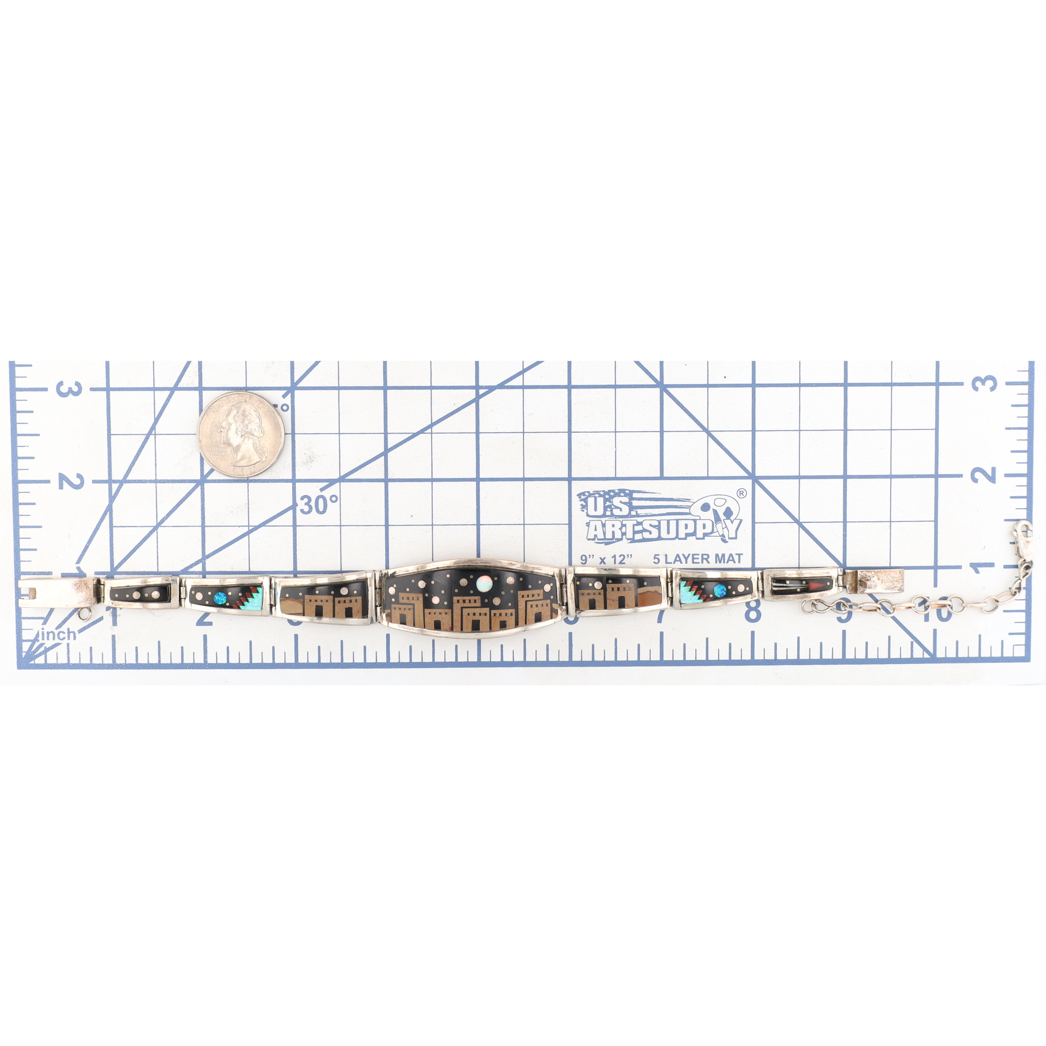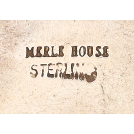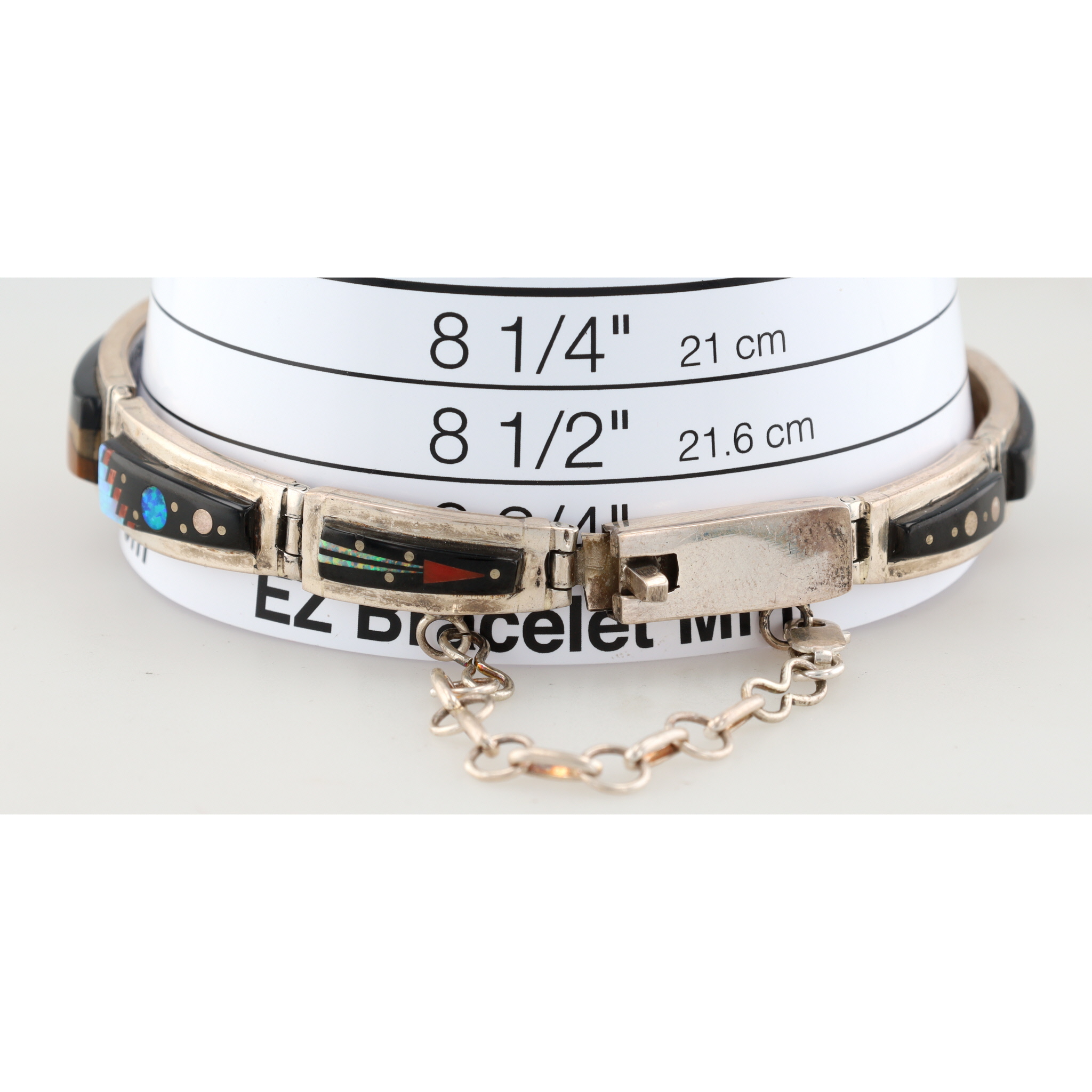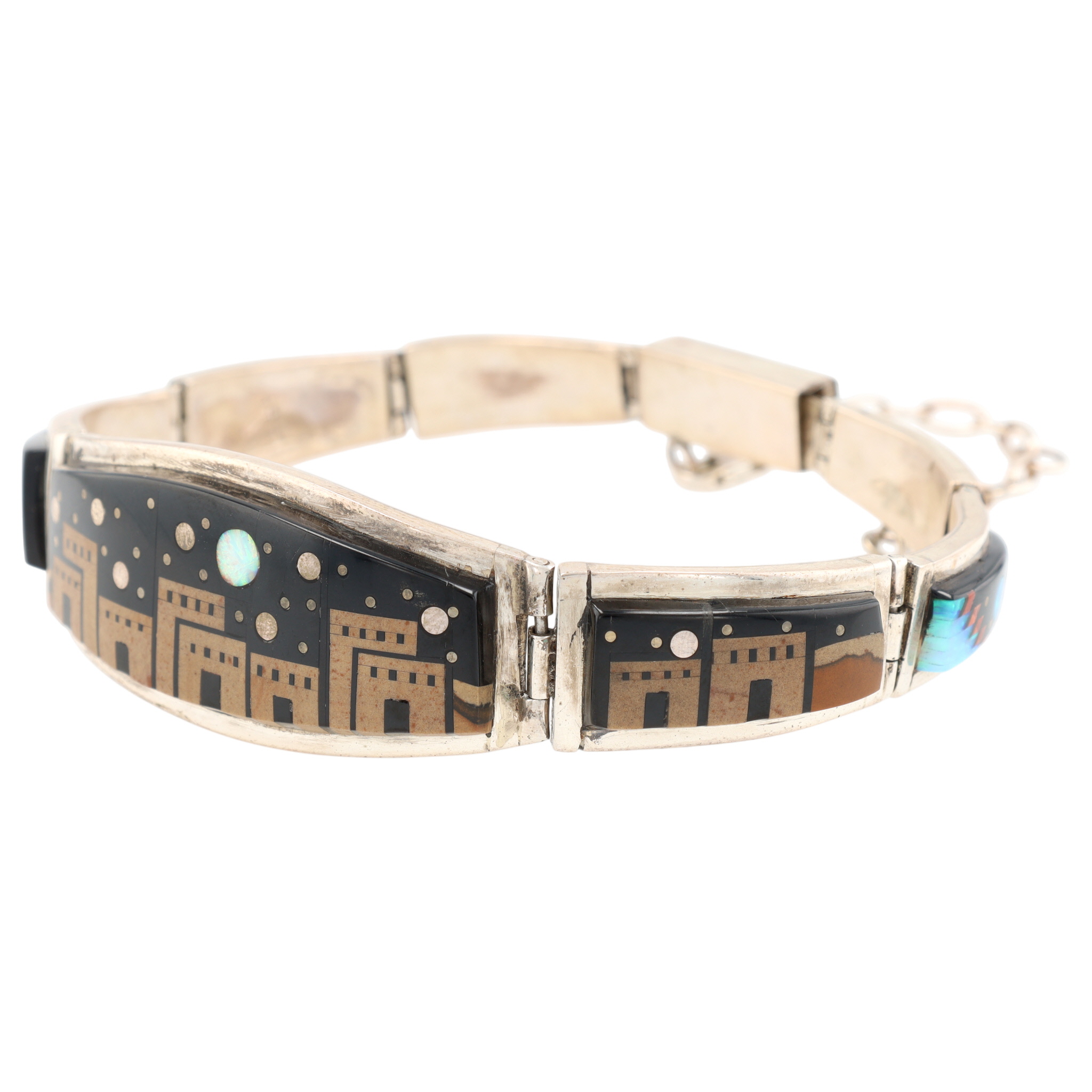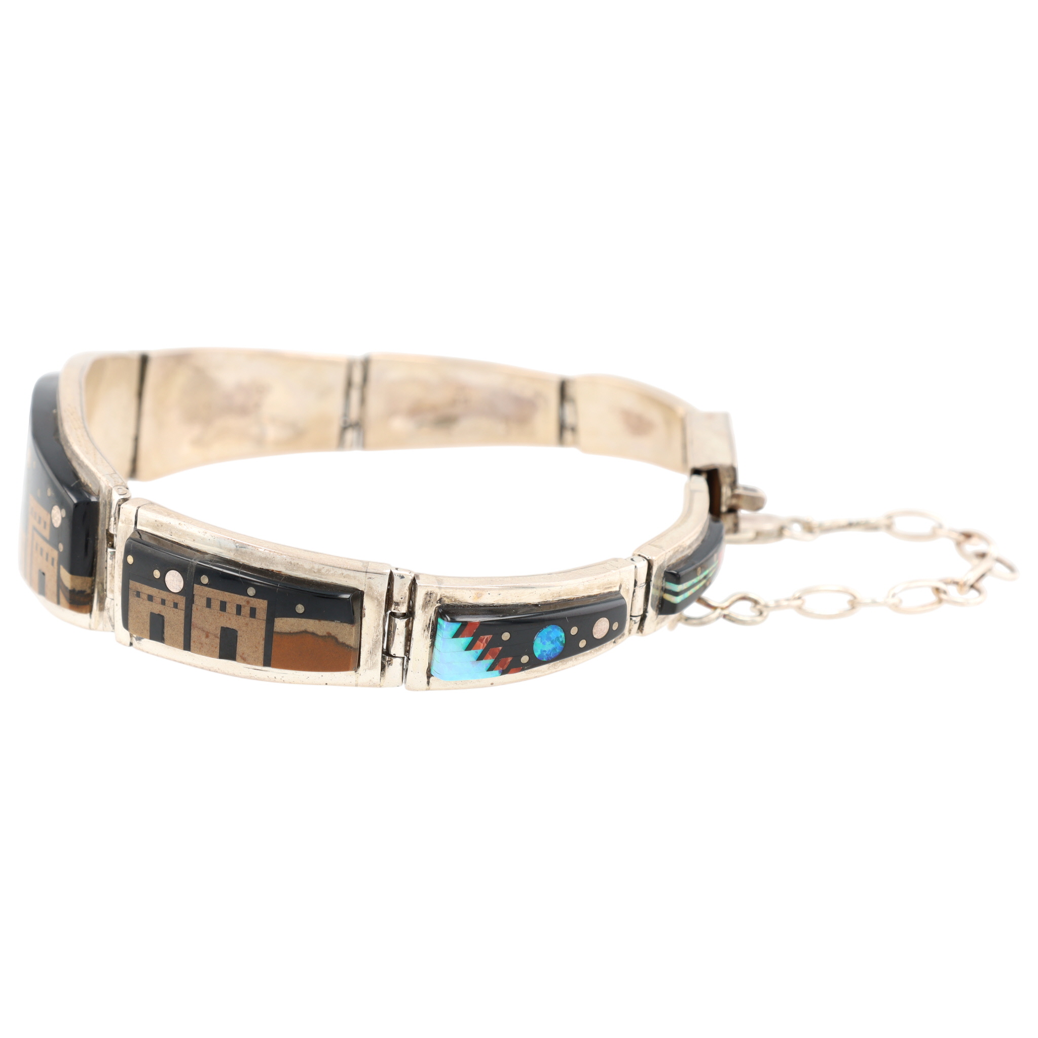 A silver inlaid bracelet, marked “MERLE HOUSE” and “STERLING”, featuring a Navajo handmade night sky design, weighing 50g and measuring approximately 8.5 inches long, and consisting of onyx, opal, coral, brown jasper.