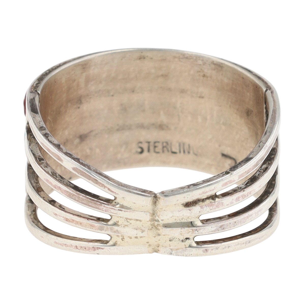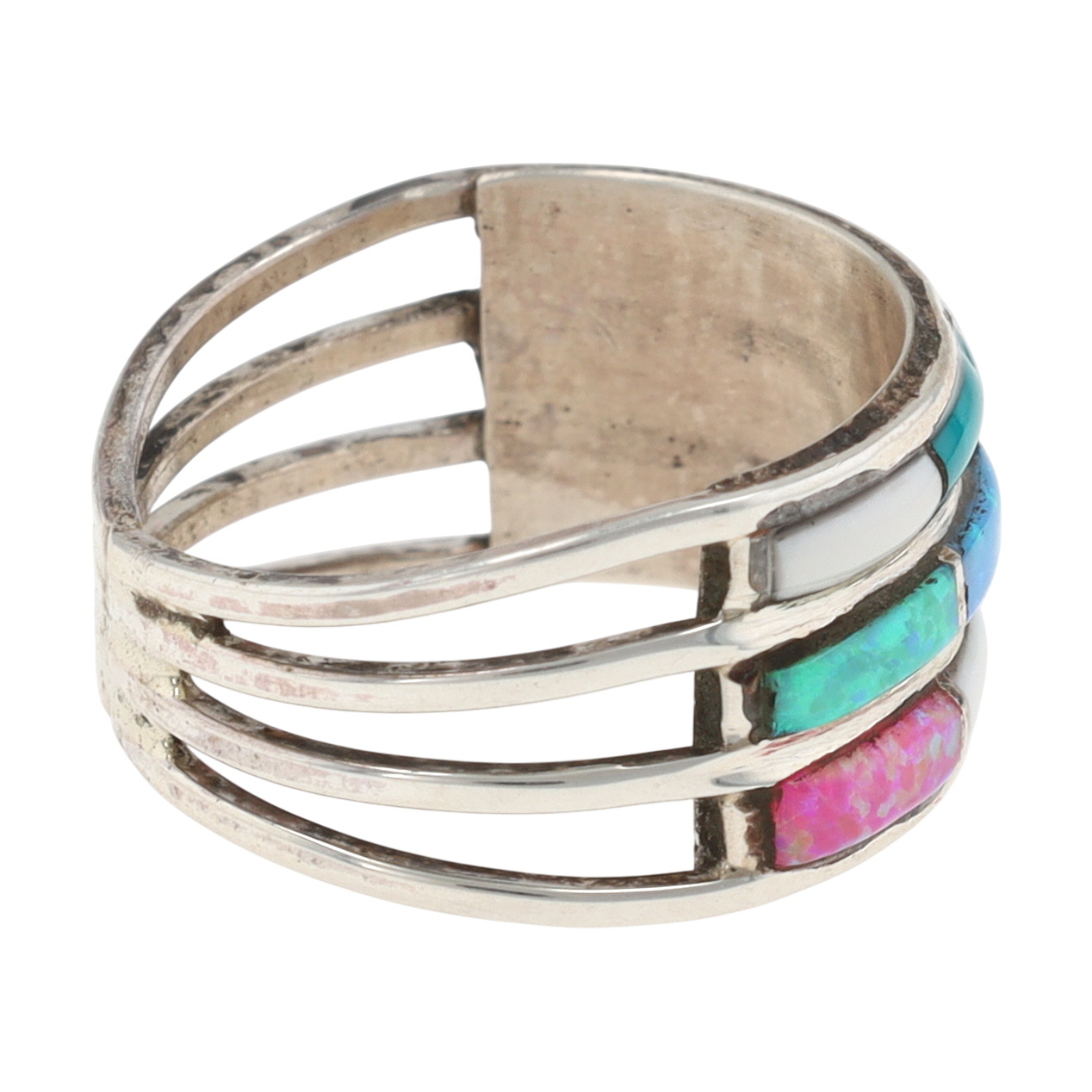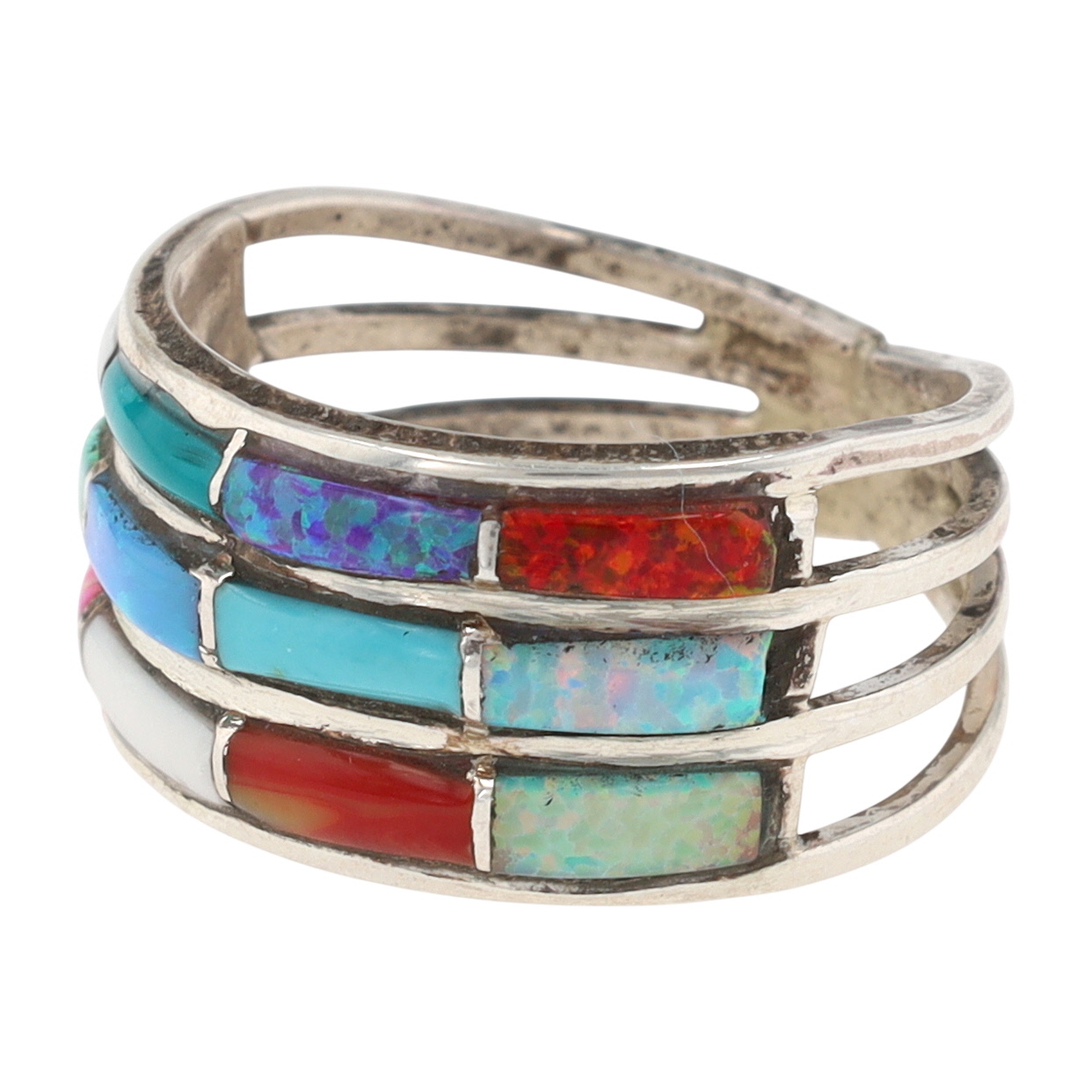A single sterling silver Navajo handmade ring, size 7.5, 4g, featuring three rows of multicolor inlaid stones including white stone, coral, turquoise, and opals, marked ‘STERLING’ and ‘J’ for silversmith.
