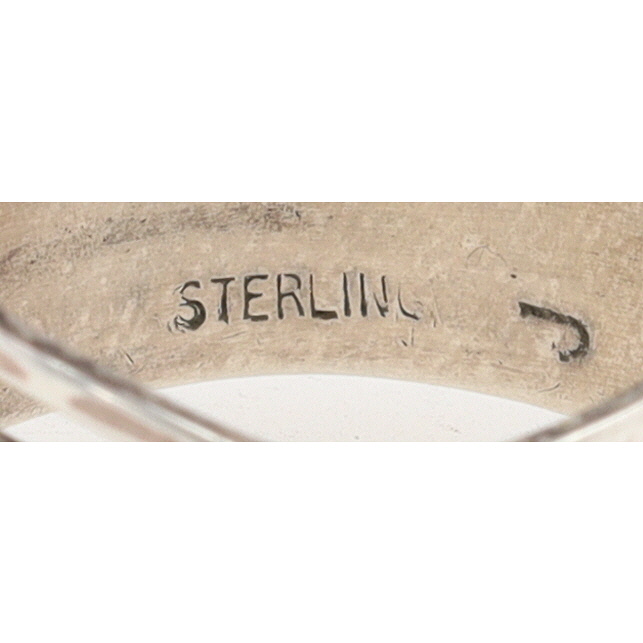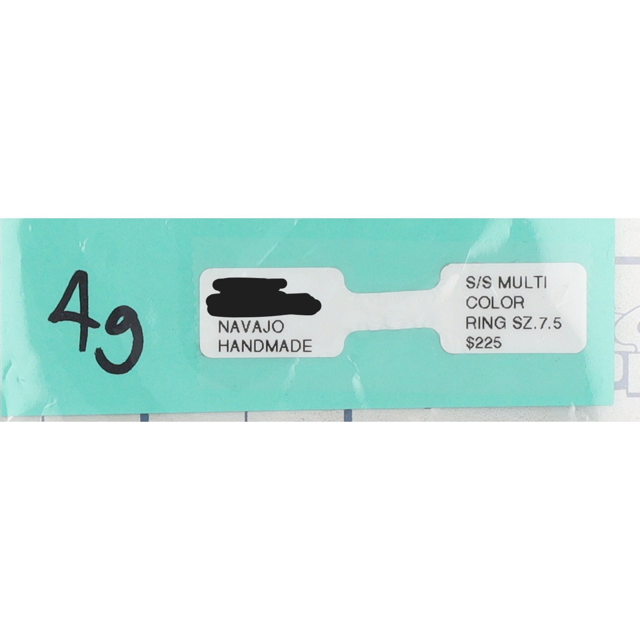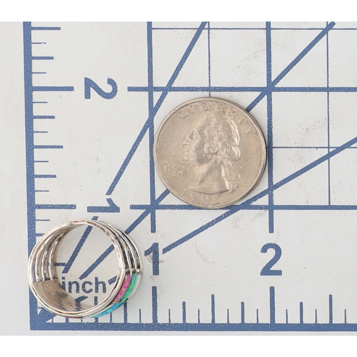 A single sterling silver Navajo handmade ring, size 7.5, 4g, featuring three rows of multicolor inlaid stones including white stone, coral, turquoise, and opals, marked ‘STERLING’ and ‘J’ for silversmith.