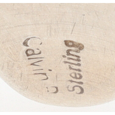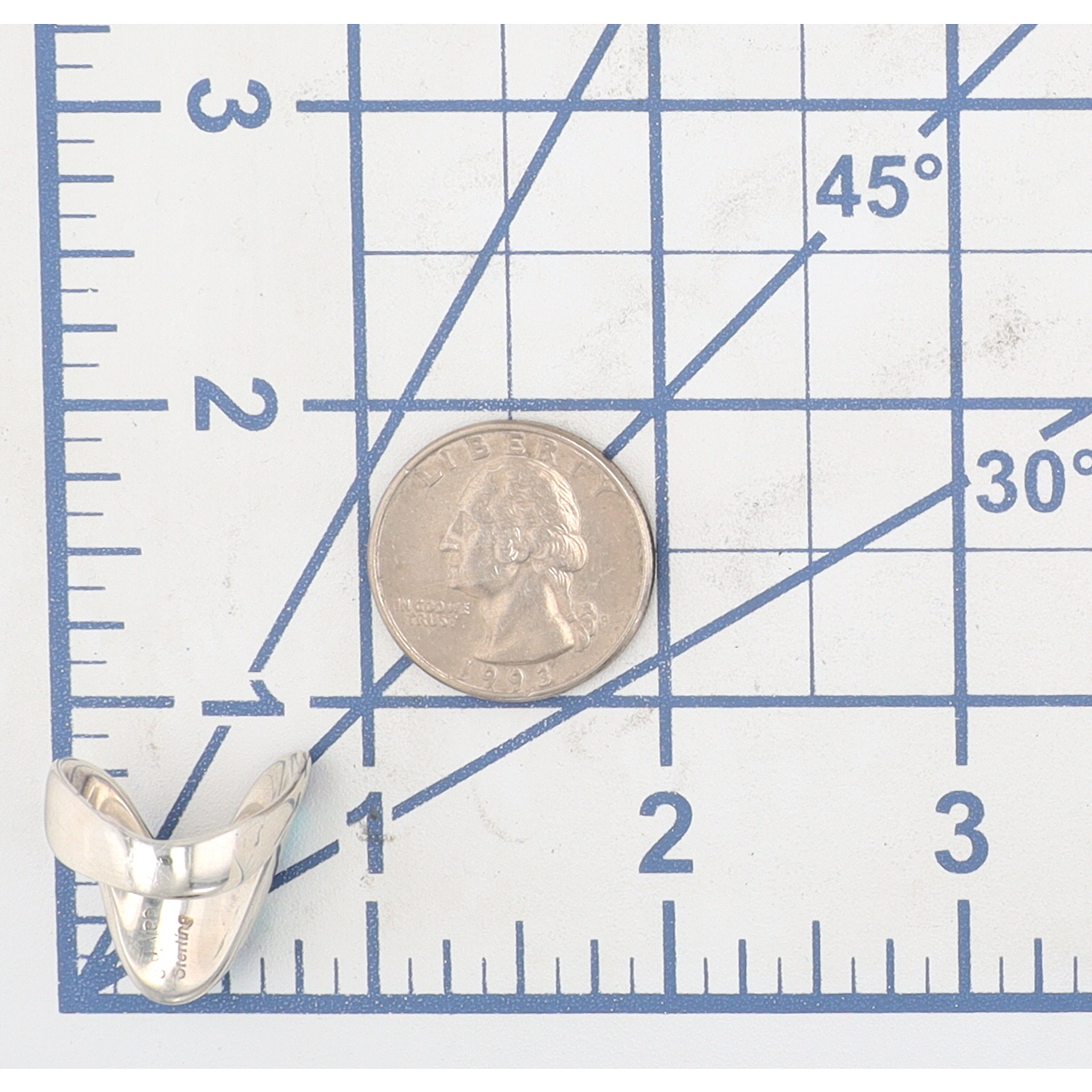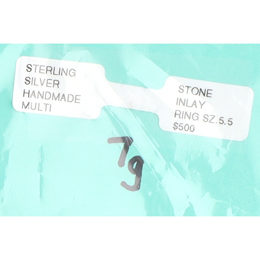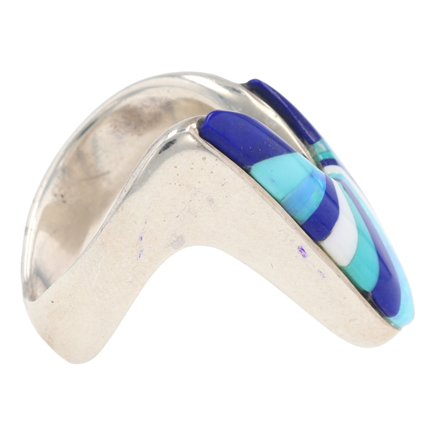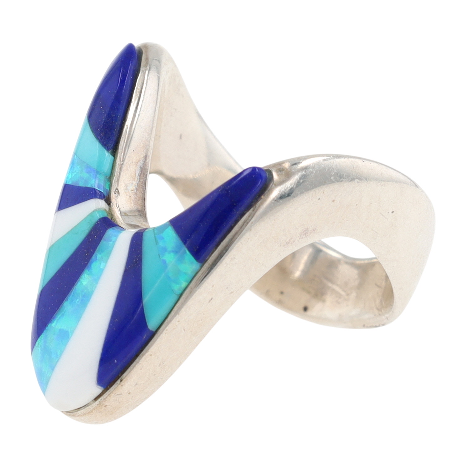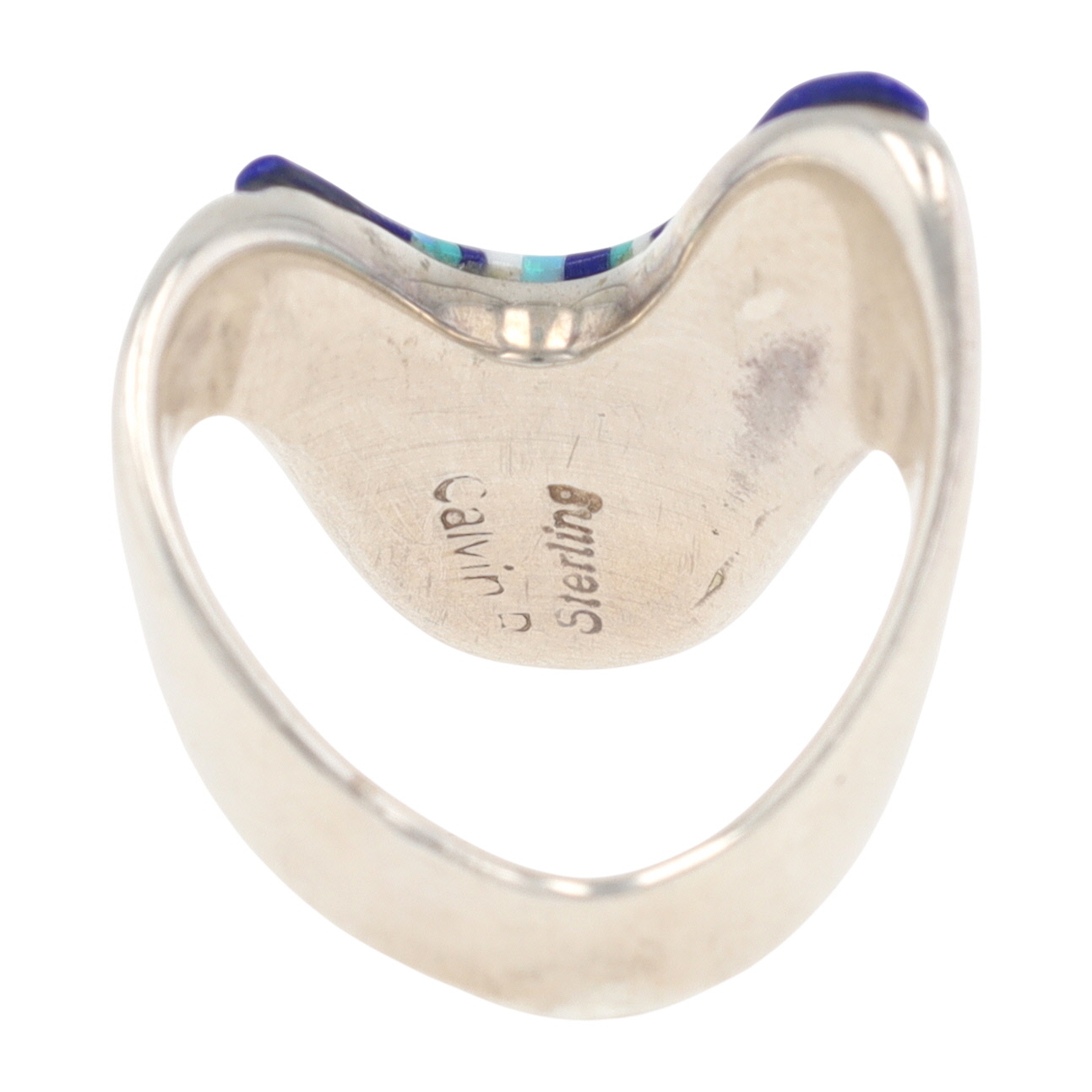 A Navajo sterling silver handmade multi stone inlay ring, size 5.5, 7g, featuring a V-shaped inlay of opal, dark blue lapis, light blue/turquoise, and white stones, marked “Calvin Begay” and “Sterling”.