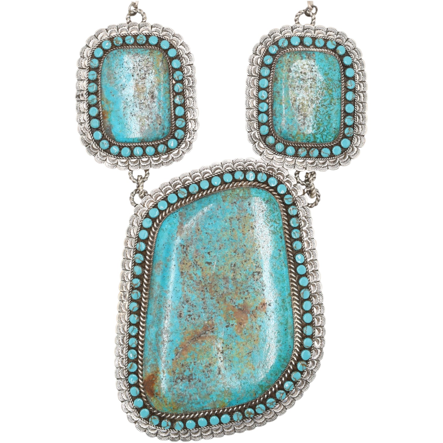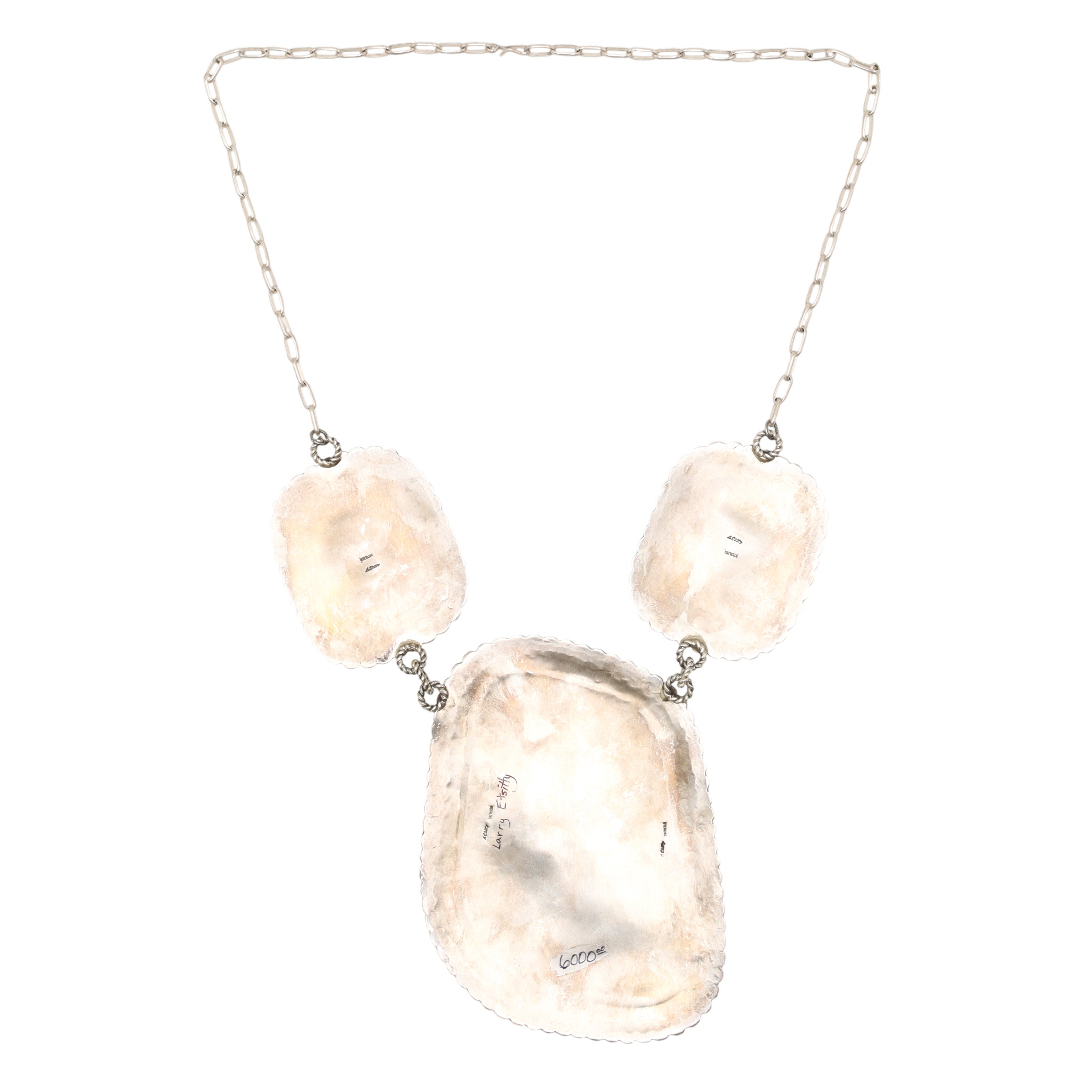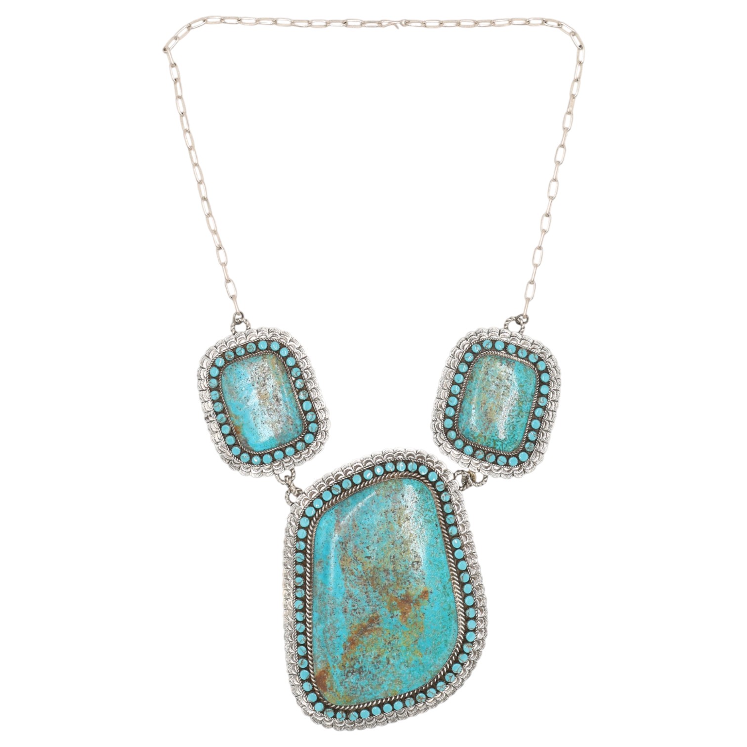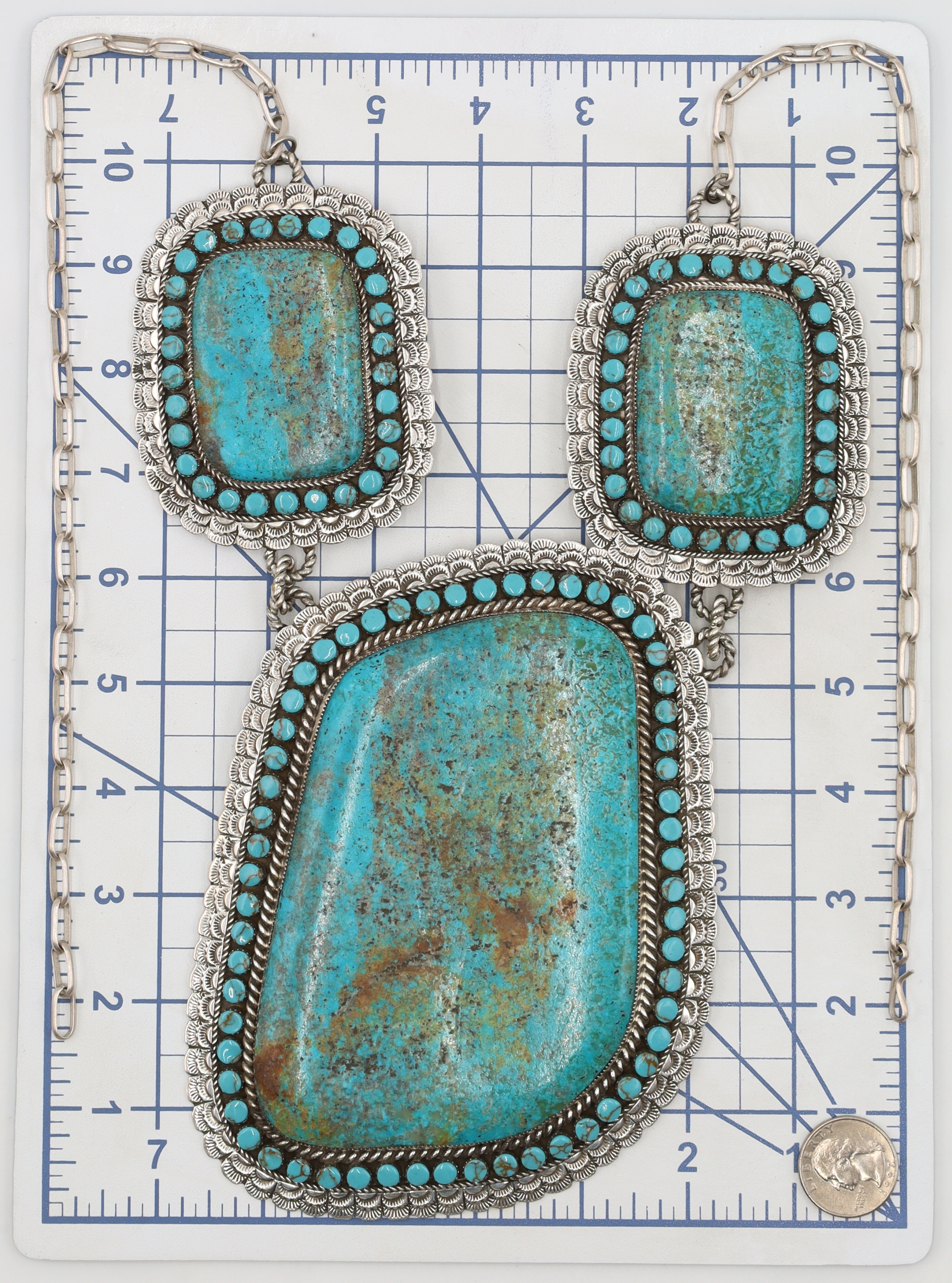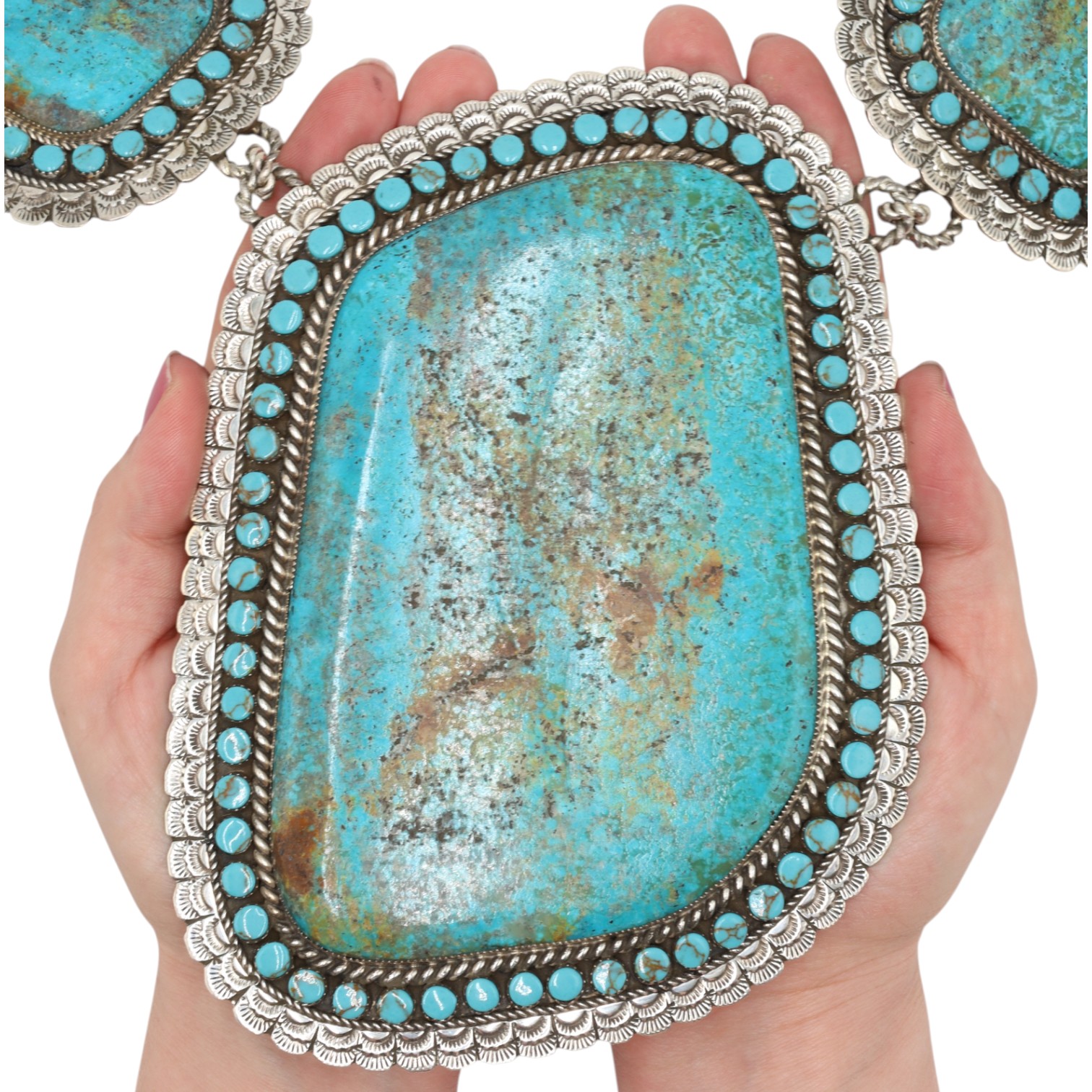 A massive sterling silver necklace adorned with multiple Kingman turquoise stones, signed “Larry Etsitty”, stamped “STERLING” , and having an approximate length of 37 inches, 486g.
