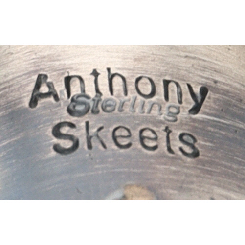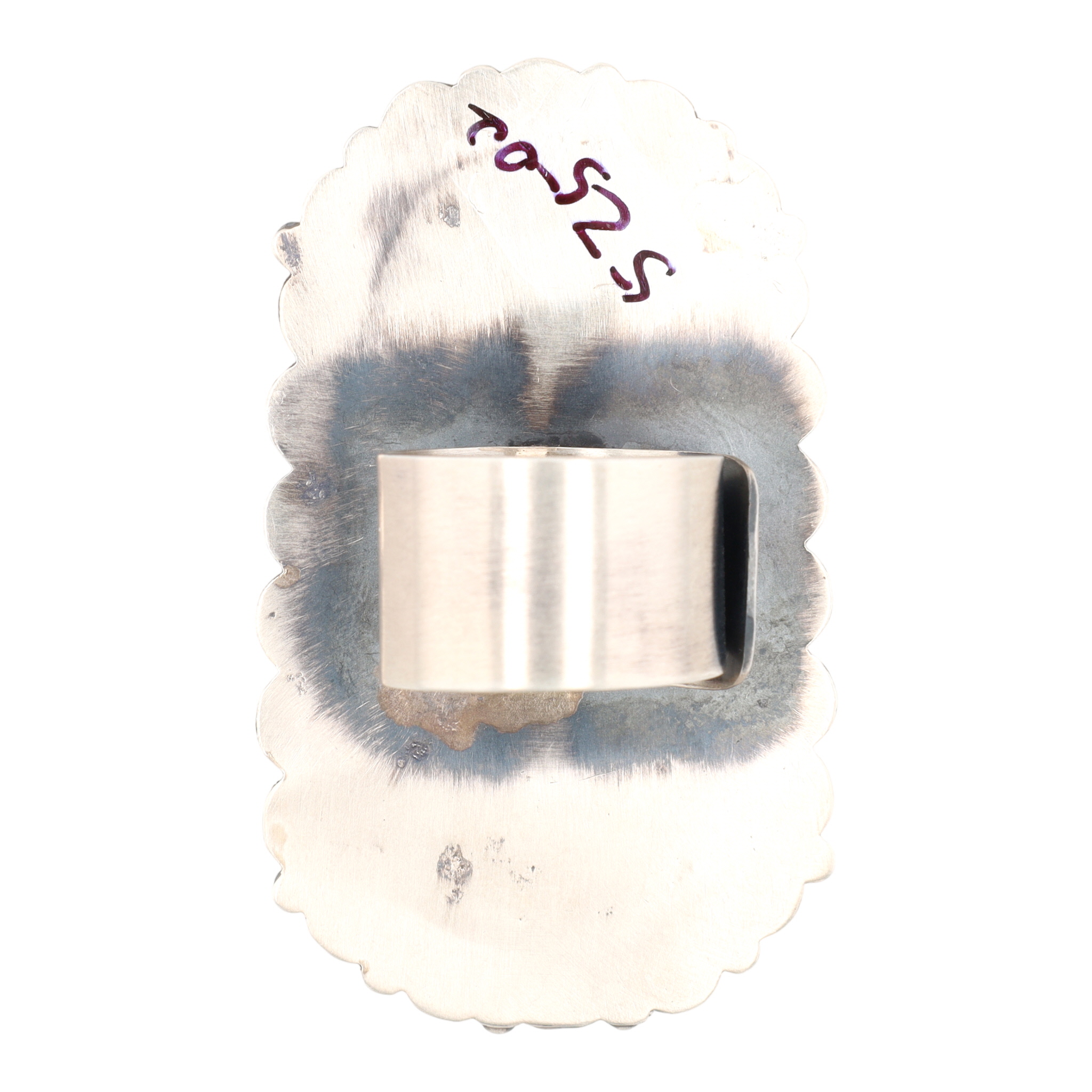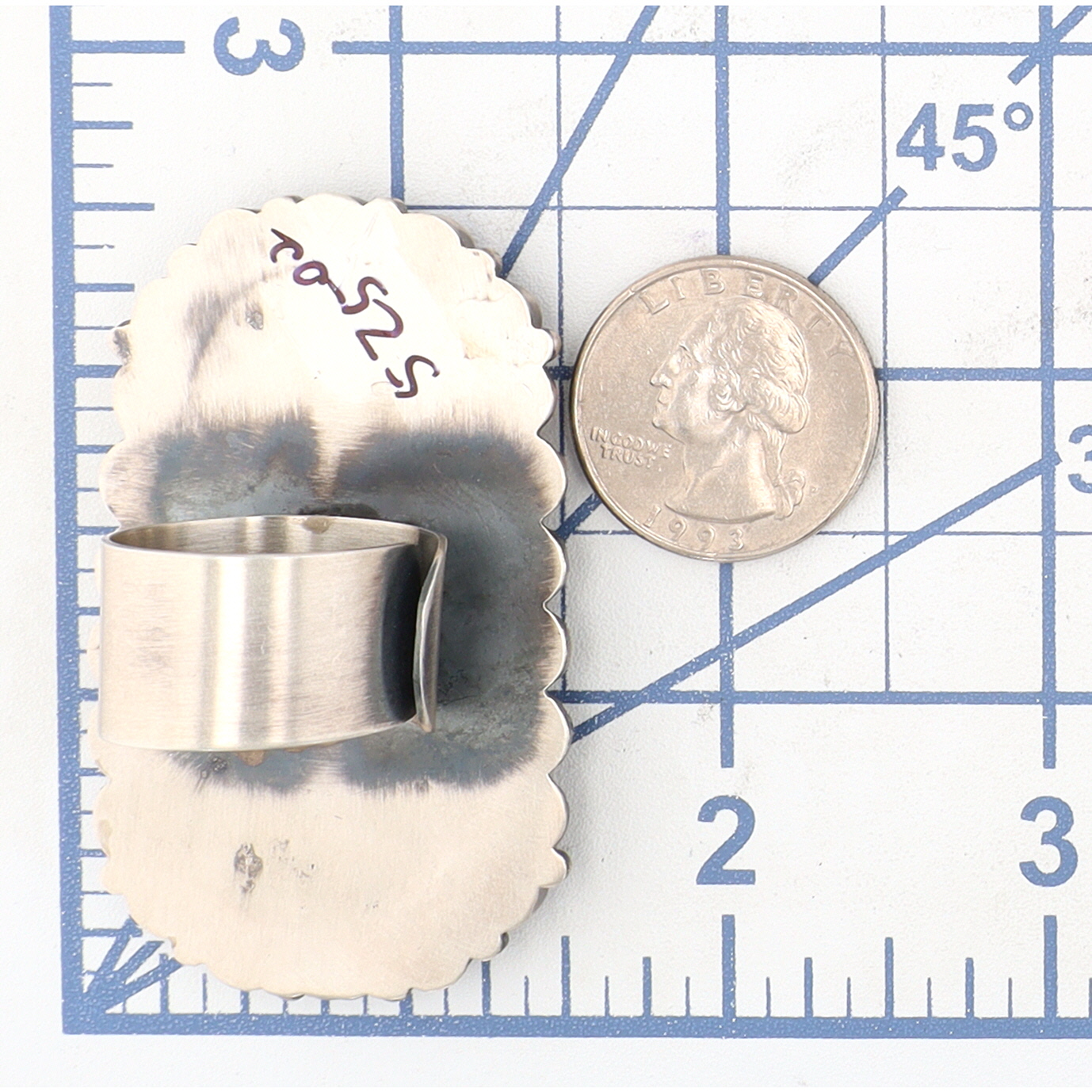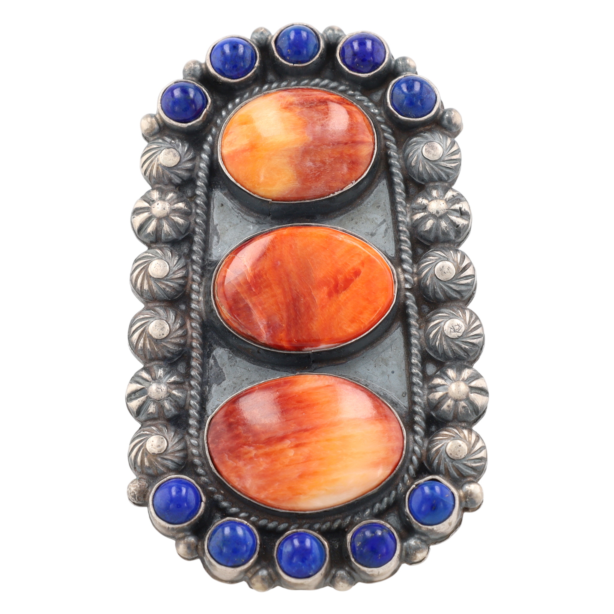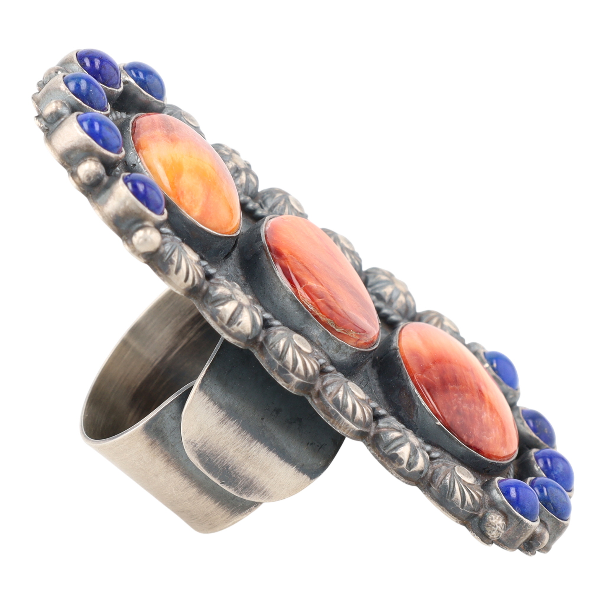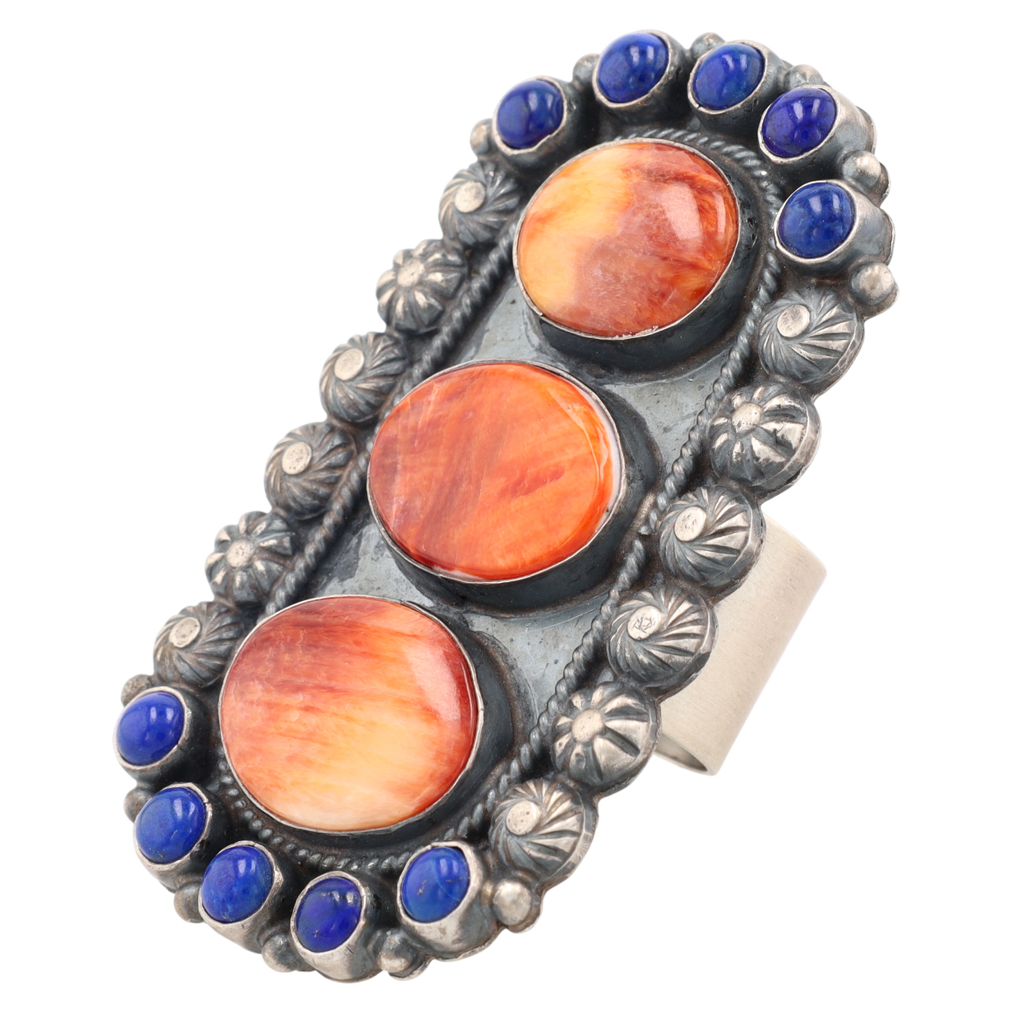 A silver Adjustable ring by Navajo artist Anthony Skeets, featuring three oval orange spiny oyster stones and small round lapis stones, weighing 36.5g and measuring approximately 2.25 inches long. Core ring size US 9.5