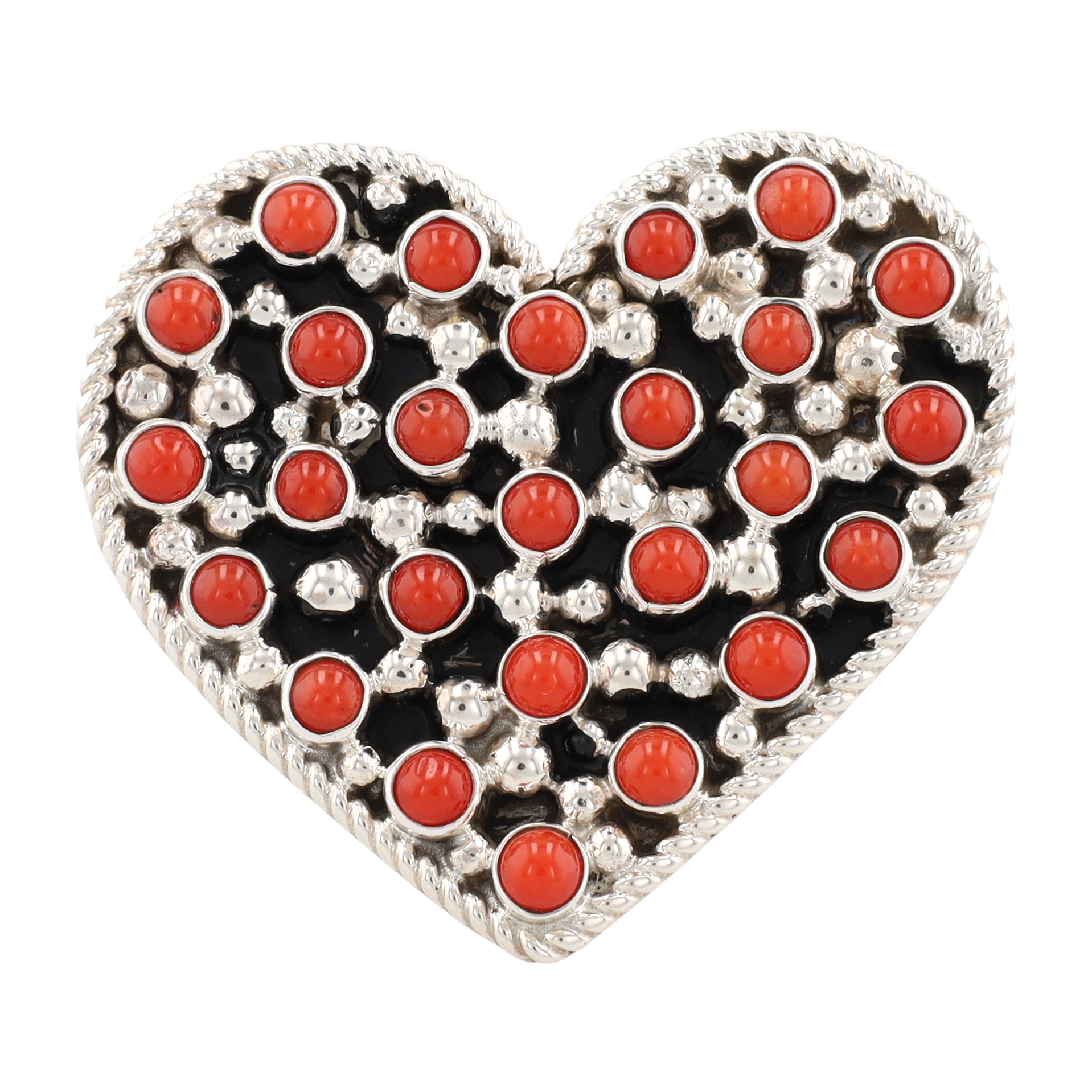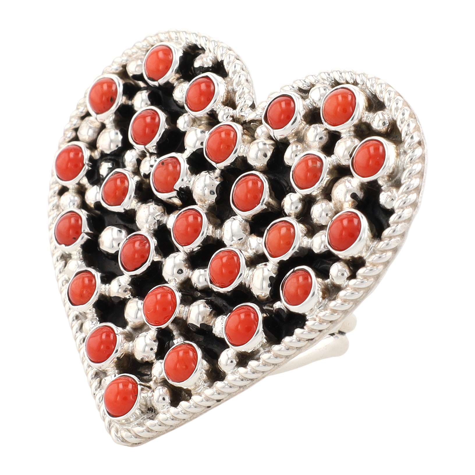 A Navajo sterling Mediterranean coral heart-shaped adjustable ring, marked ‘Sterling’ on the band, attributed to Tina James, with a total weight of 28g. Core Size US 9.5
