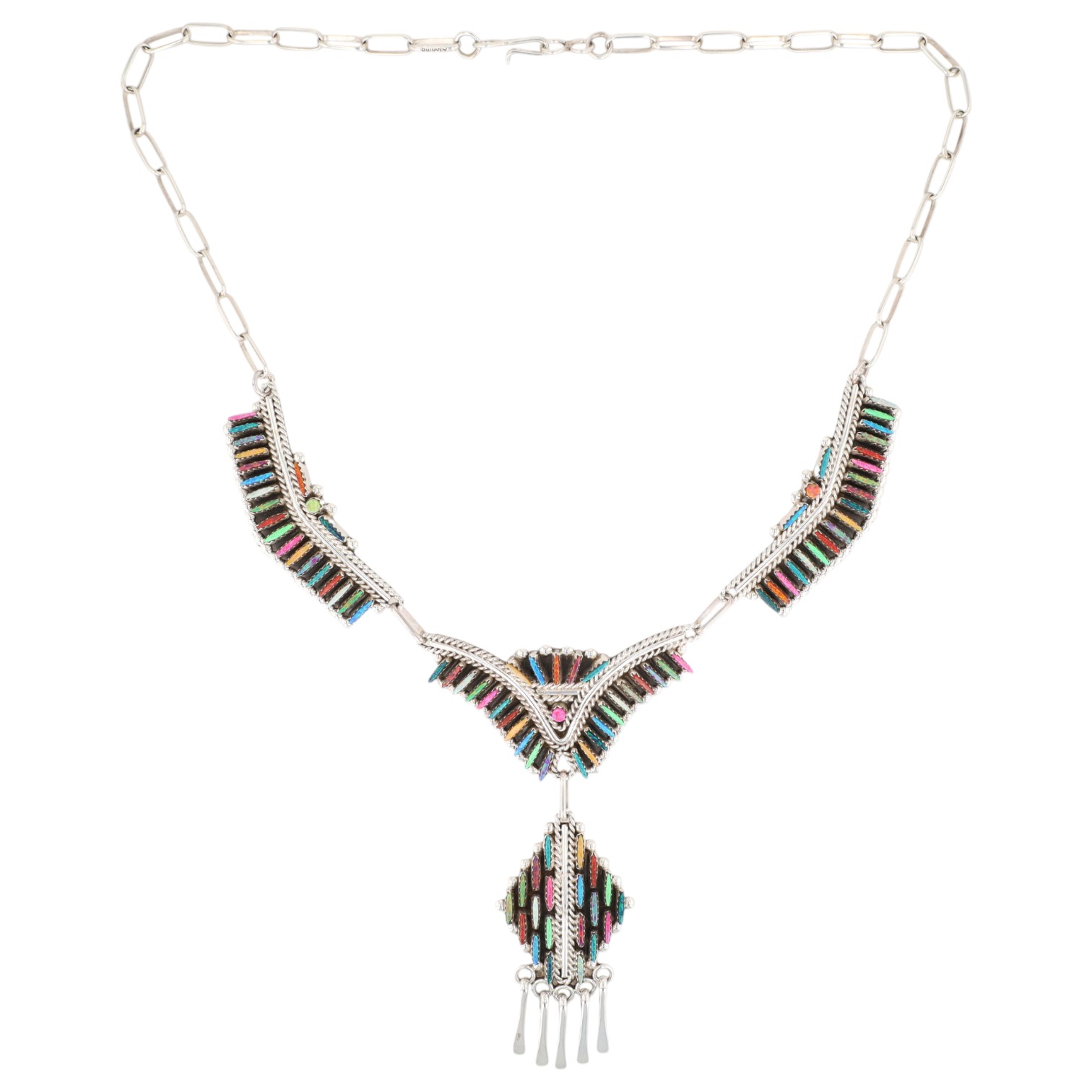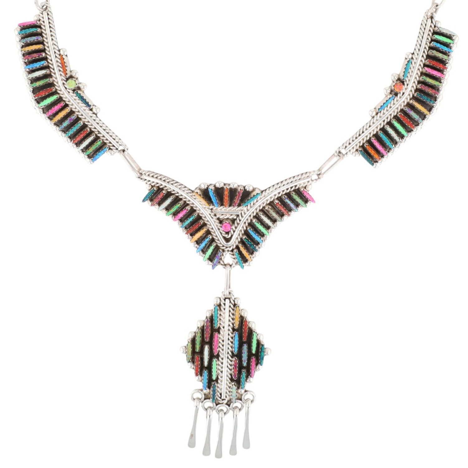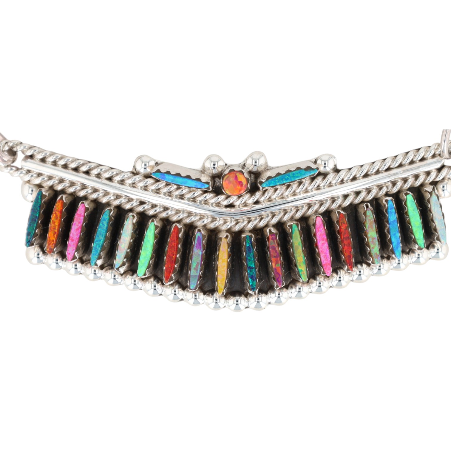 A silver necklace by Zuni artist Roland Francisco featuring multi-colored opal inlay in a petit point design, marked ‘Sterling’ and ‘R. Francisco Sterling’, measuring approximately 20 inches long and weighing 53g.