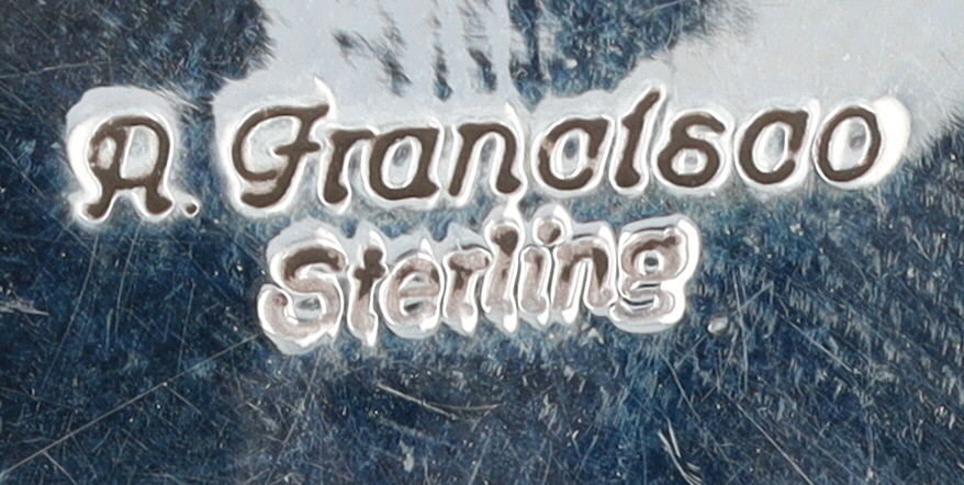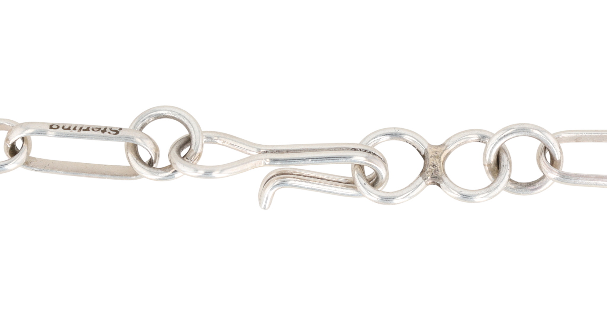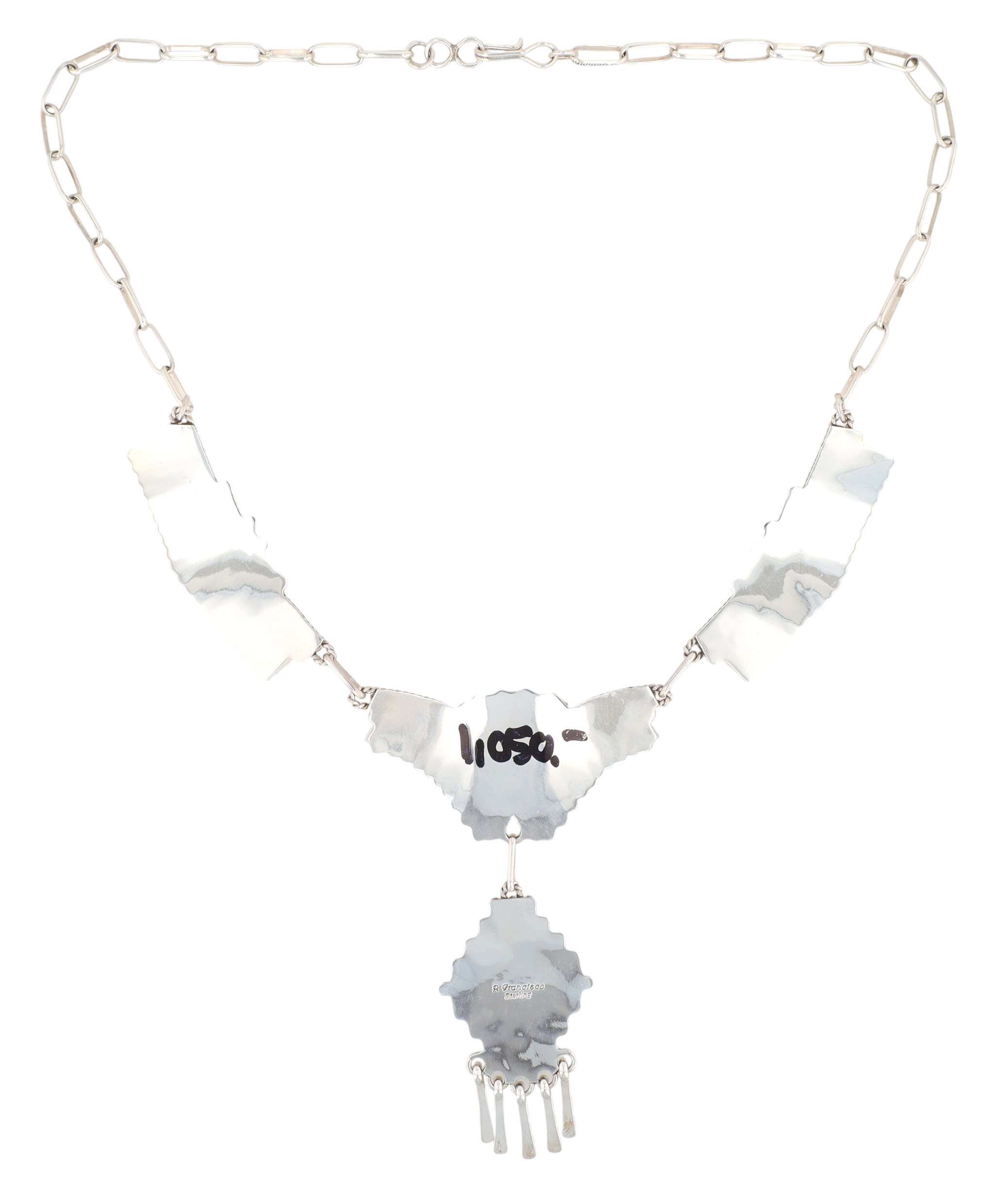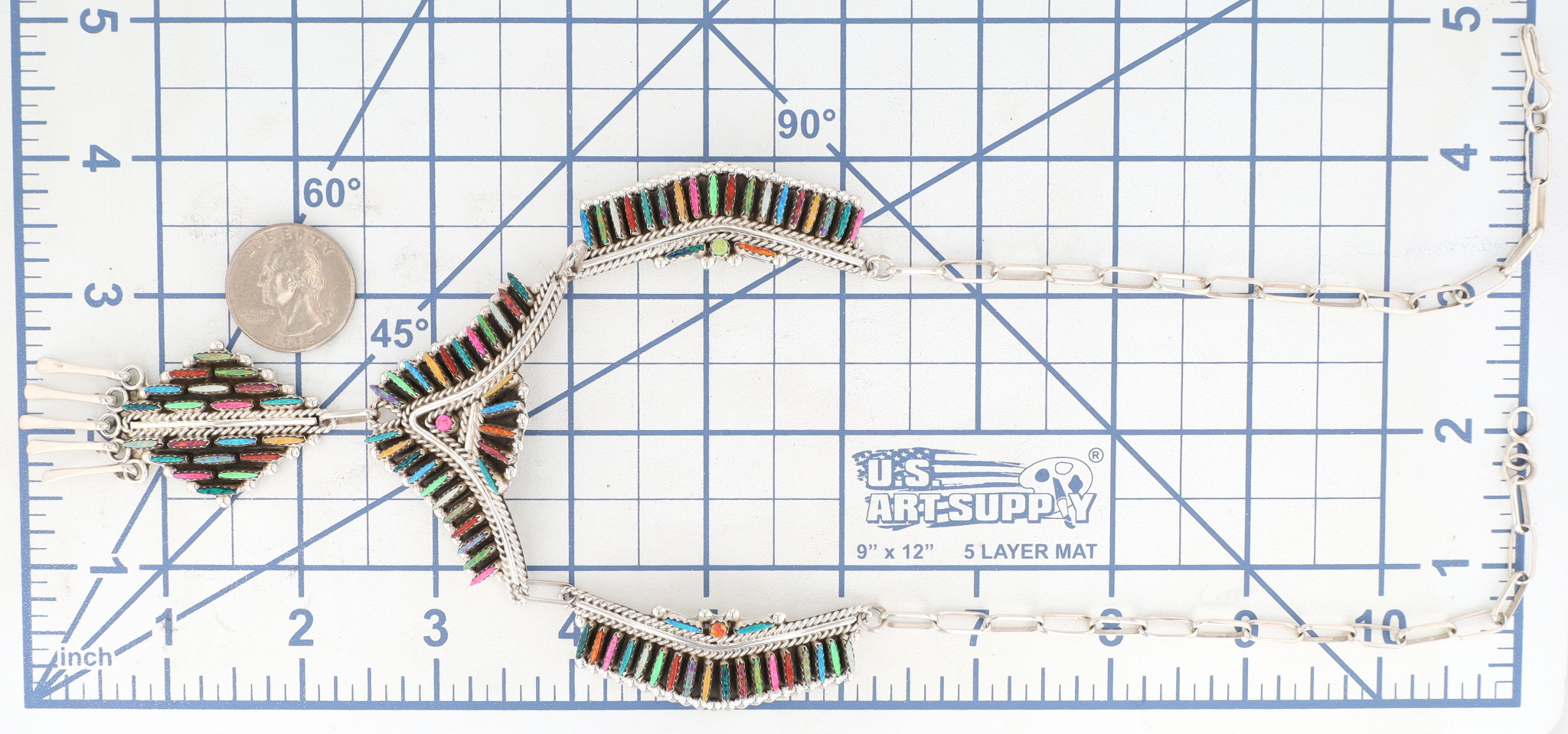 A silver necklace by Zuni artist Roland Francisco featuring multi-colored opal inlay in a petit point design, marked ‘Sterling’ and ‘R. Francisco Sterling’, measuring approximately 20 inches long and weighing 53g.