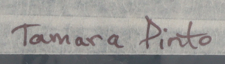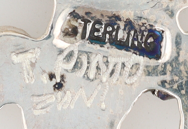 A sterling necklace by Zuni artist Tamara Pinto, weighing 22.5g, adorned with nine stylized gecko-like links inlaid with onyx, coral, and turquoise, marked “STERLING” and “T. PINTO” on the reverse.