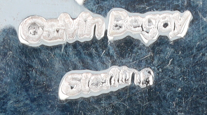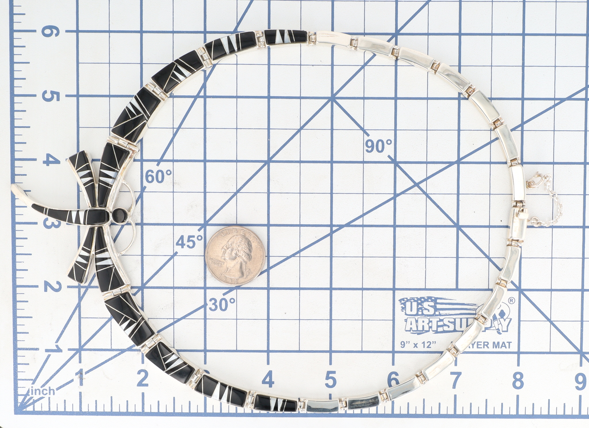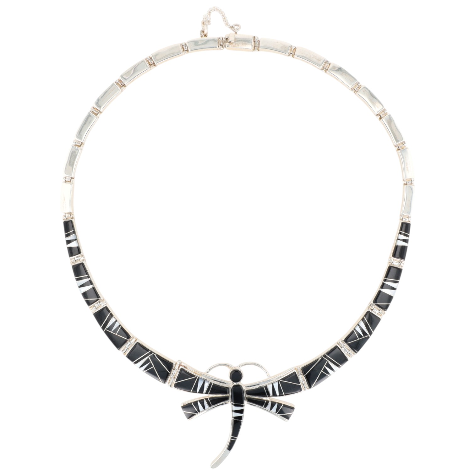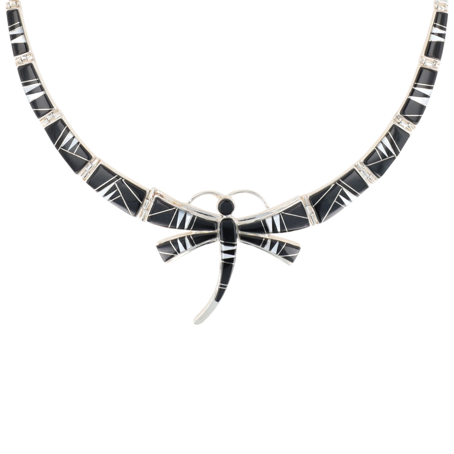 A sterkubgnecklace featuring an onyx and mother-of-pearl inlaid dragonfly pendant, marked “Calvin Begay” and “Sterling”, approximately 17 inches long, weighing 18g.