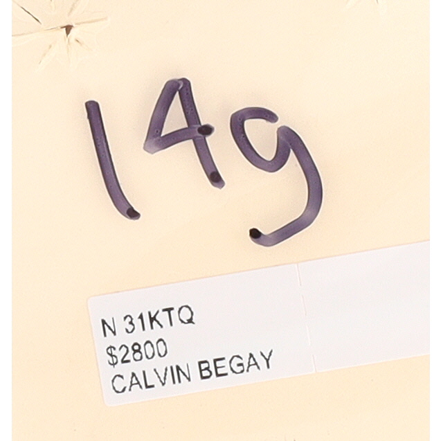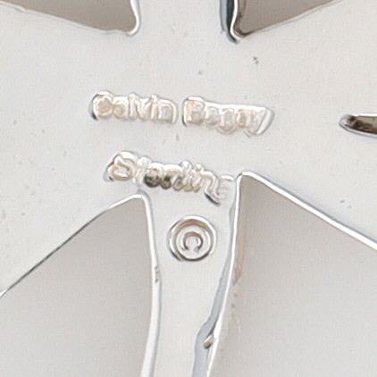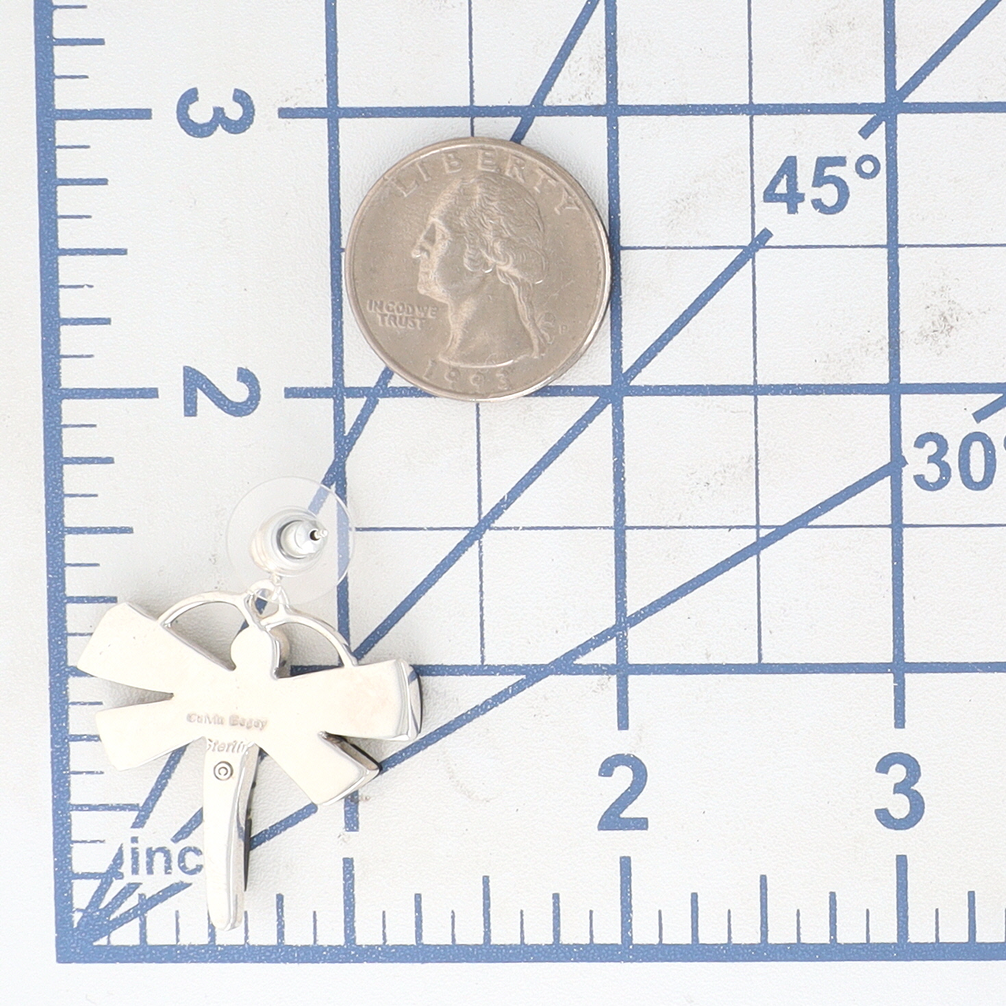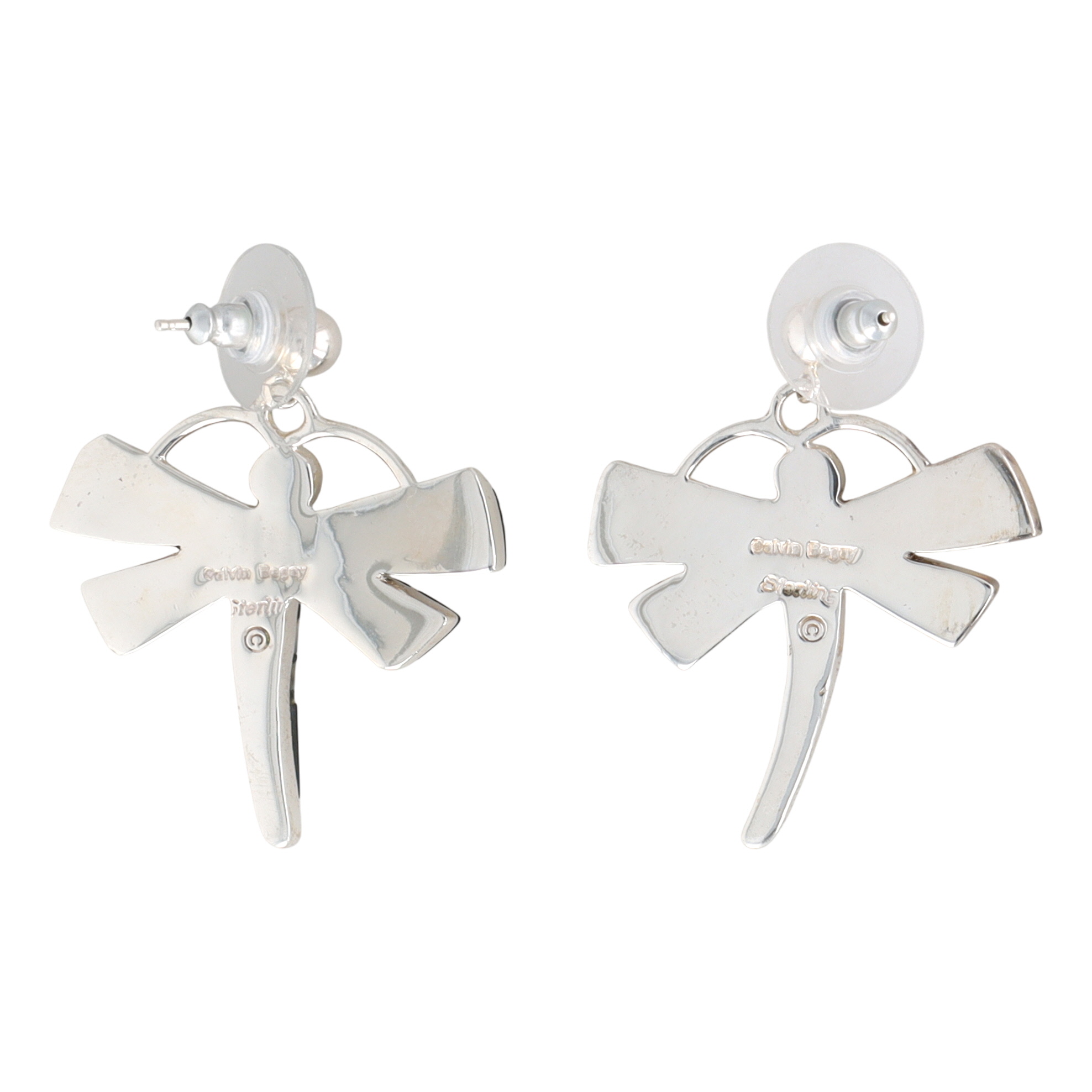 A pair of Calvin Begay sterling silver dragonfly stud earrings with mother-of-pearl and onyx inlay, marked ‘Calvin Begay’ and ‘Sterling’ with a copyright symbol, measuring approximately 1.5 inches long and weighing 14g.