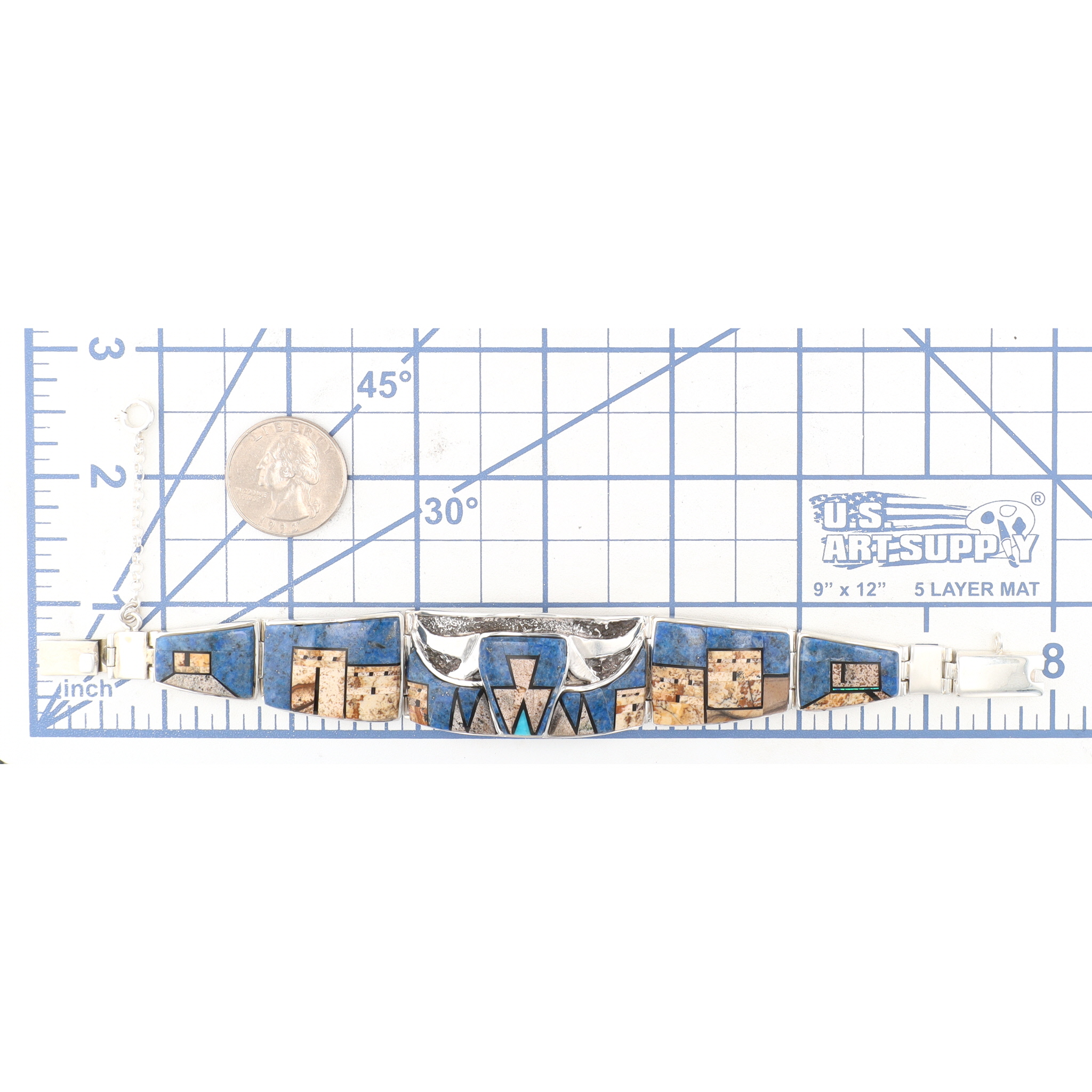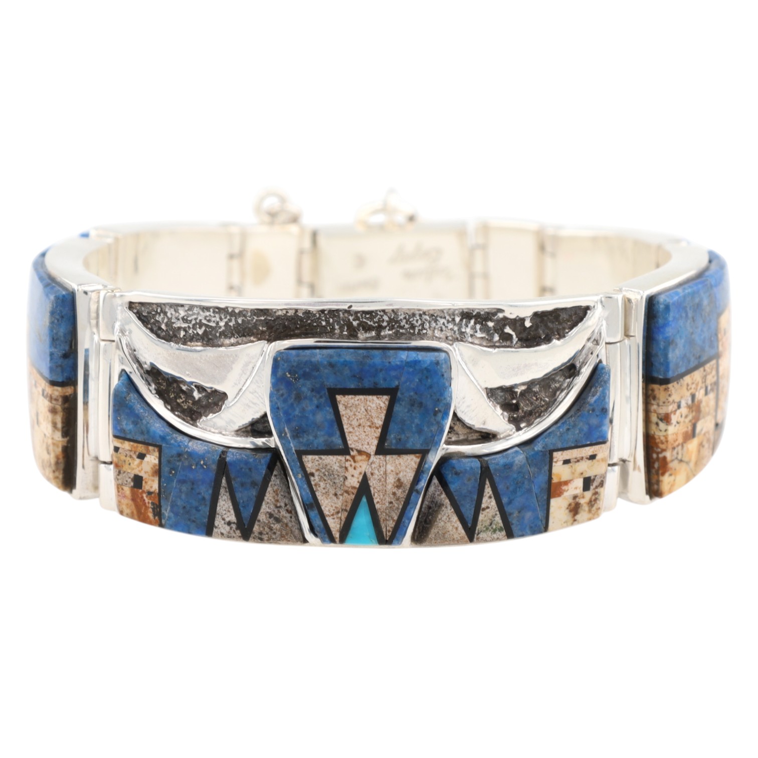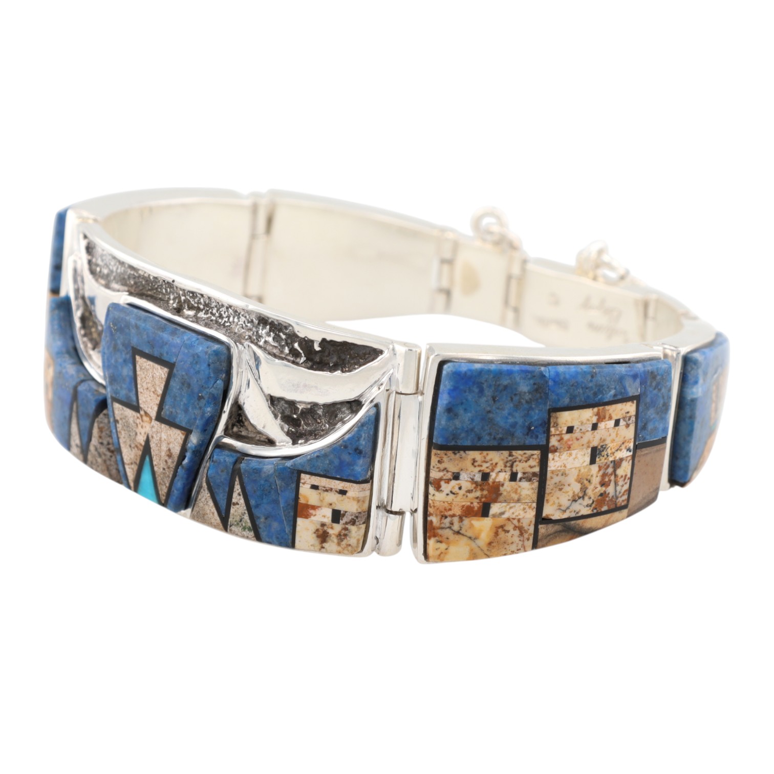 A sterling silver bracelet with multi-stone inlay Blue Sky Pueblo in denim lapis, picture jasper, onyx, featuring a turquoise, marked ‘Calvin Begay’ and ‘Sterling’, approximately 7 inches long.