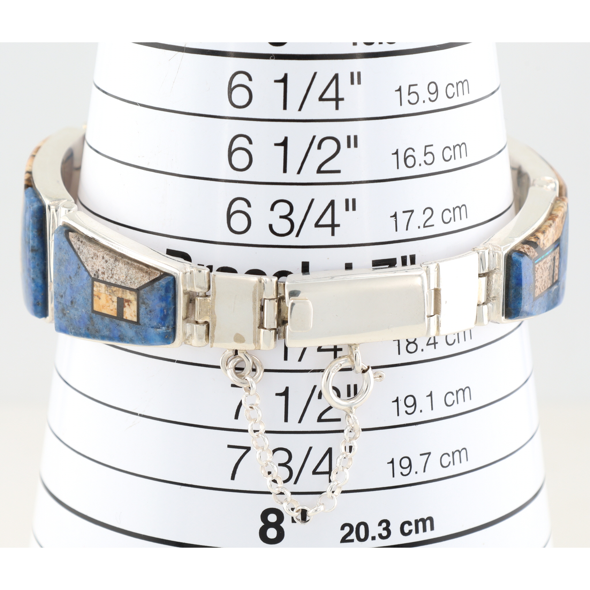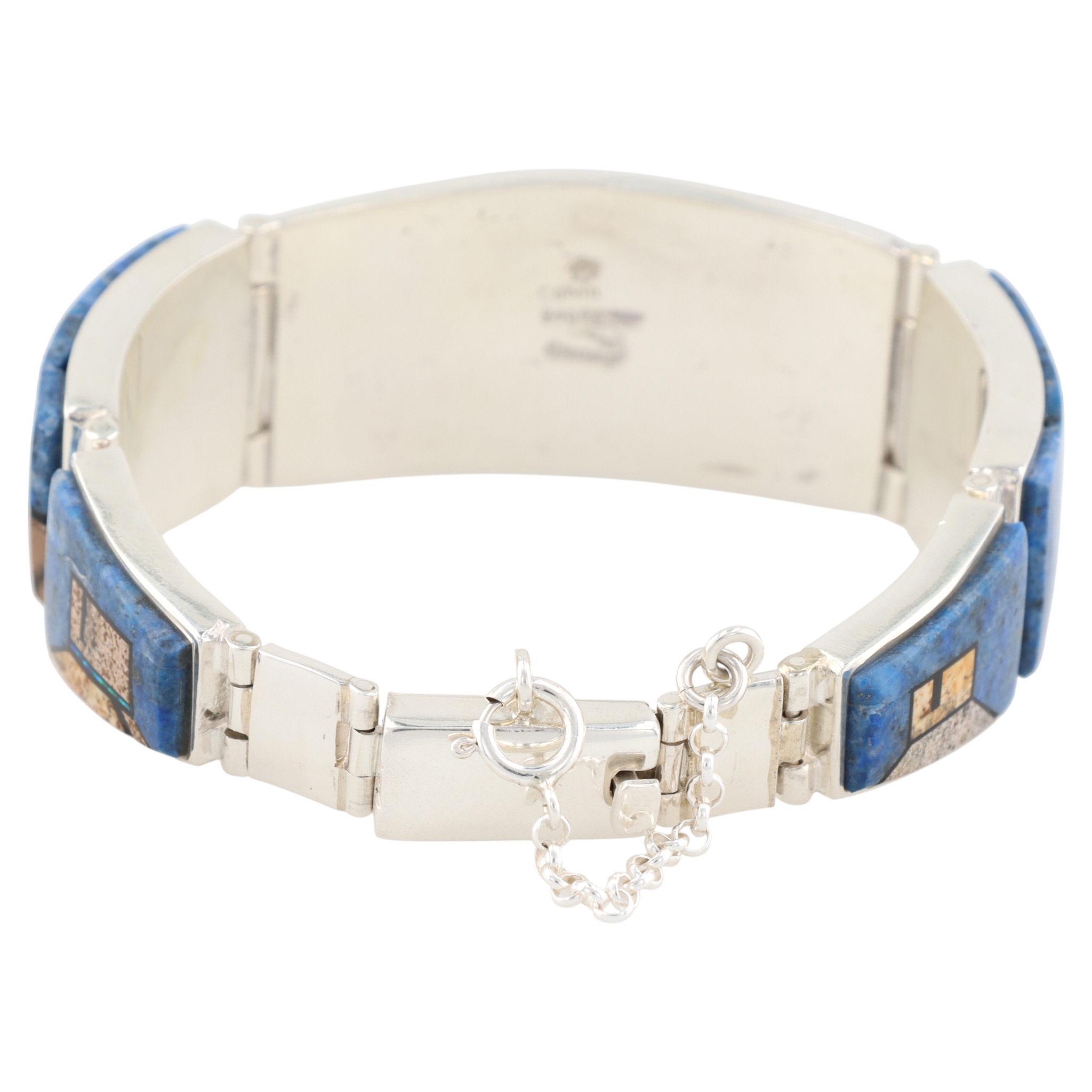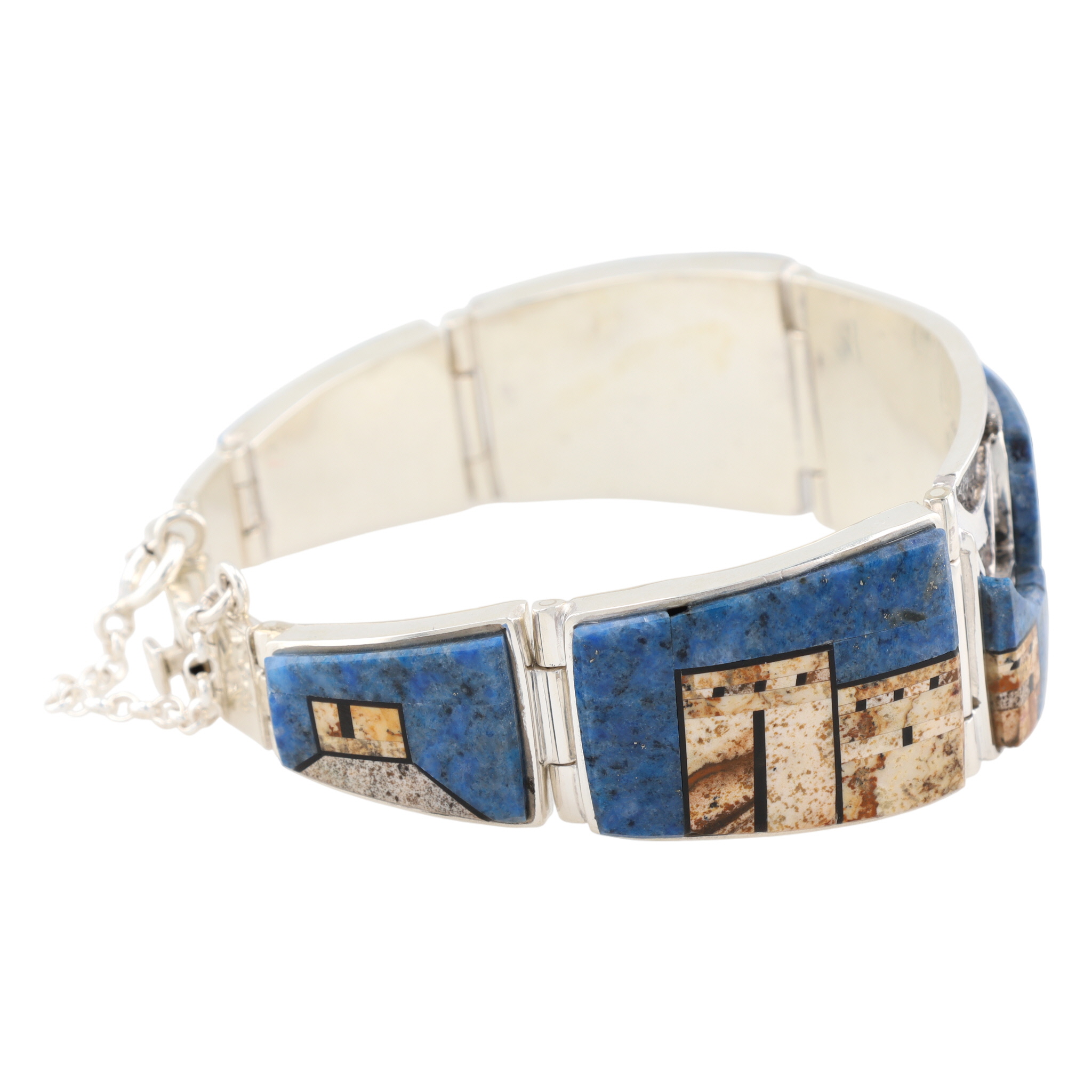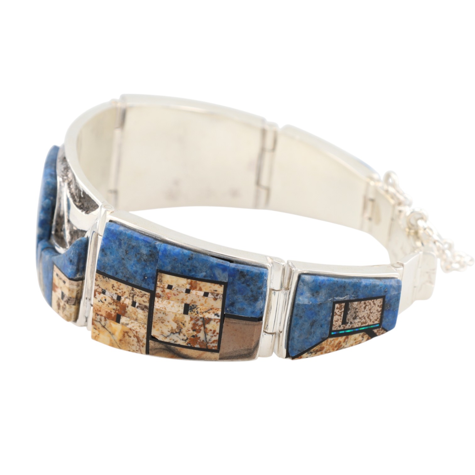 A sterling silver bracelet with multi-stone inlay Blue Sky Pueblo in denim lapis, picture jasper, onyx, featuring a turquoise, marked ‘Calvin Begay’ and ‘Sterling’, approximately 7 inches long.