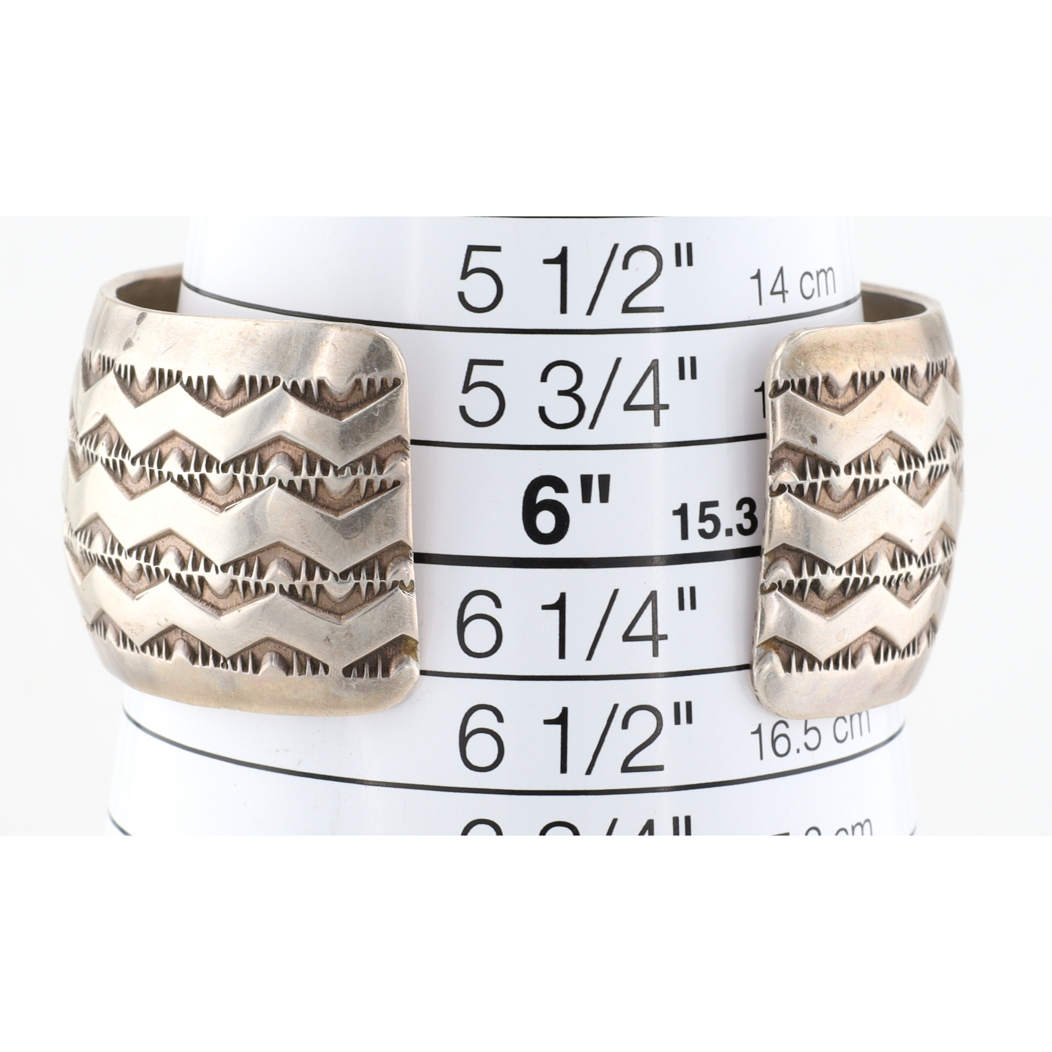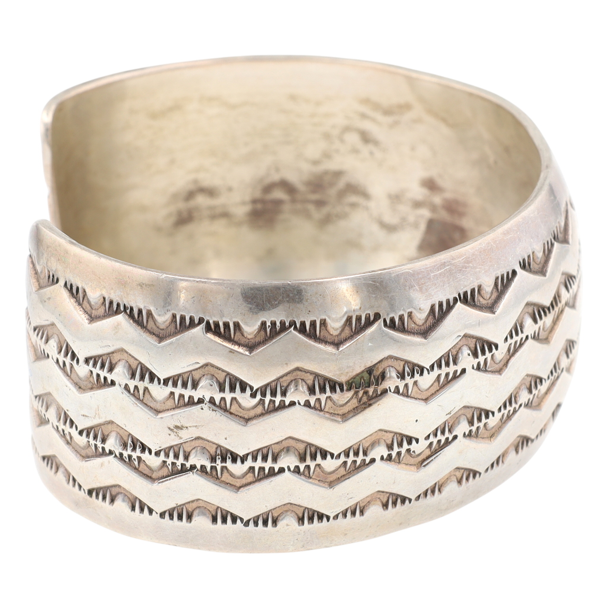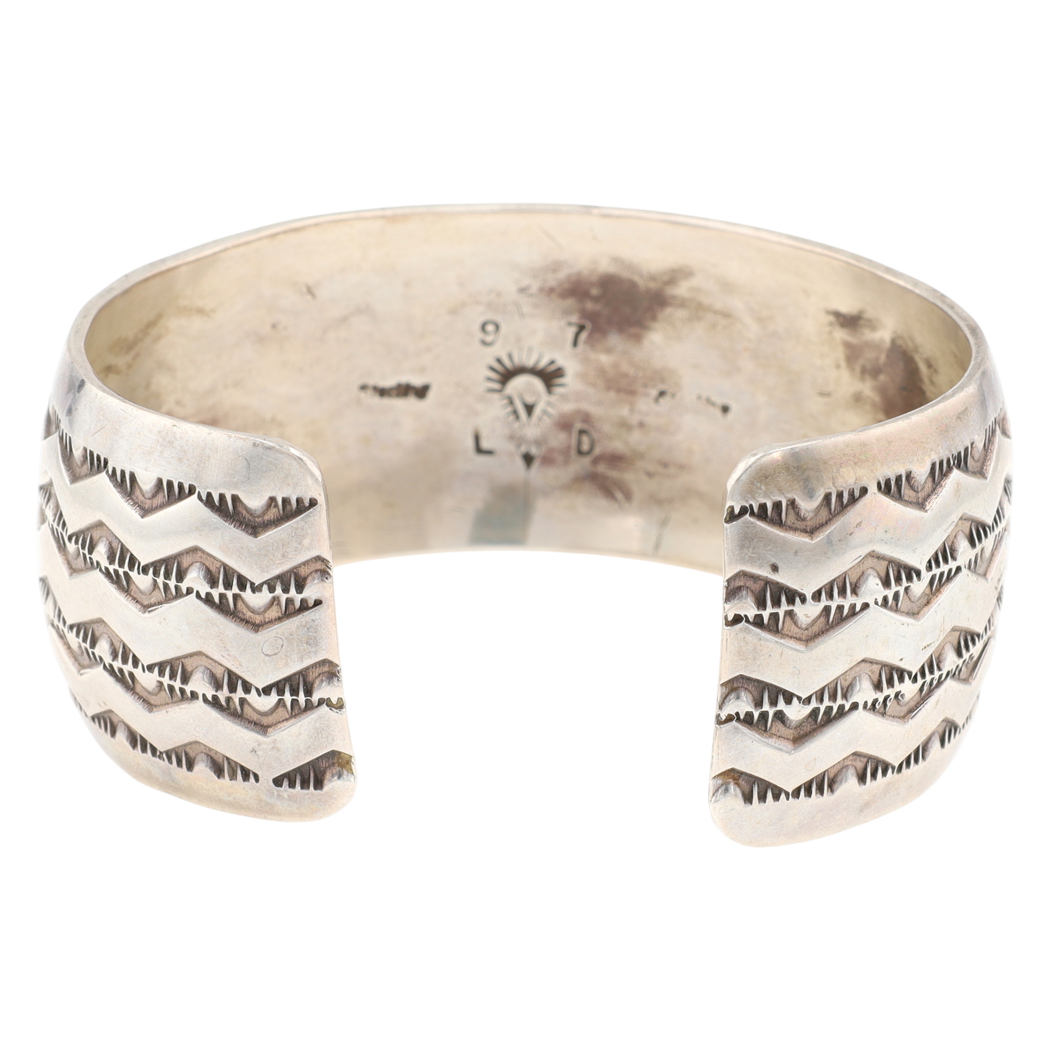 Vintage 1997 Lowell Draper sterling cuff bracelet with overlaid chevron patterns, marked on the inside with “97”, a stylized symbol, “L D”, and “Sterling”, measuring approximately 6 inches in circumference, and weighing 50.5g