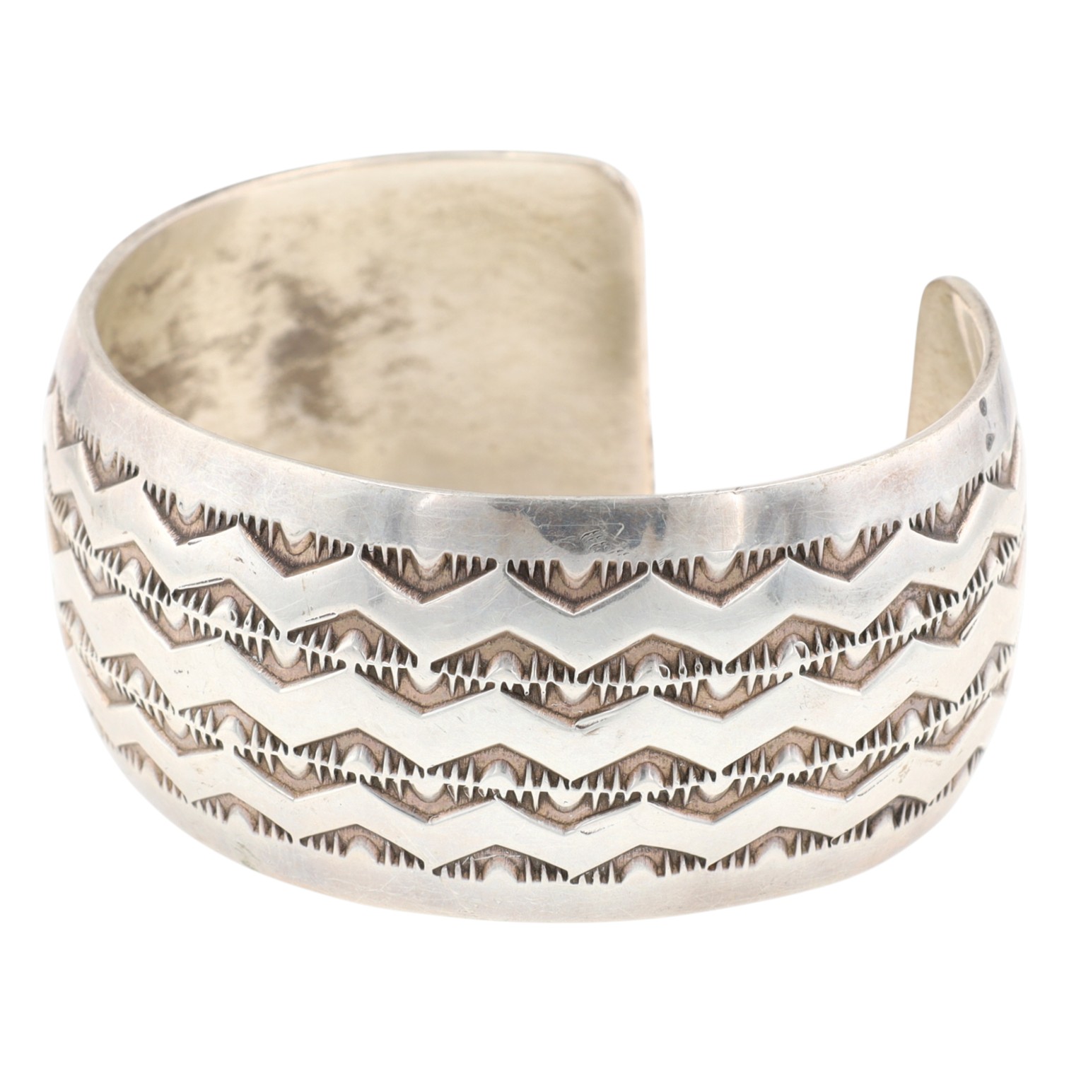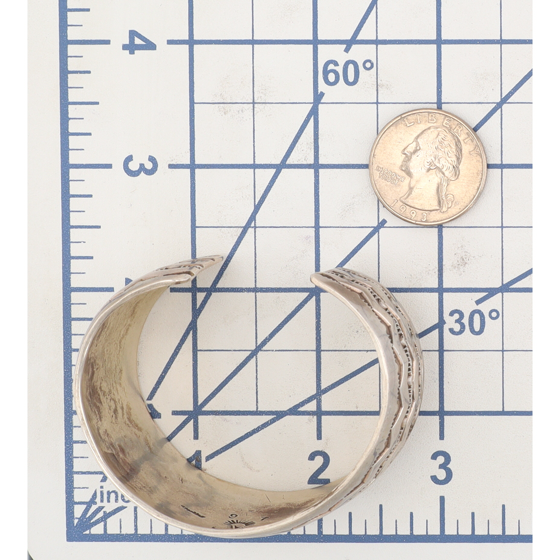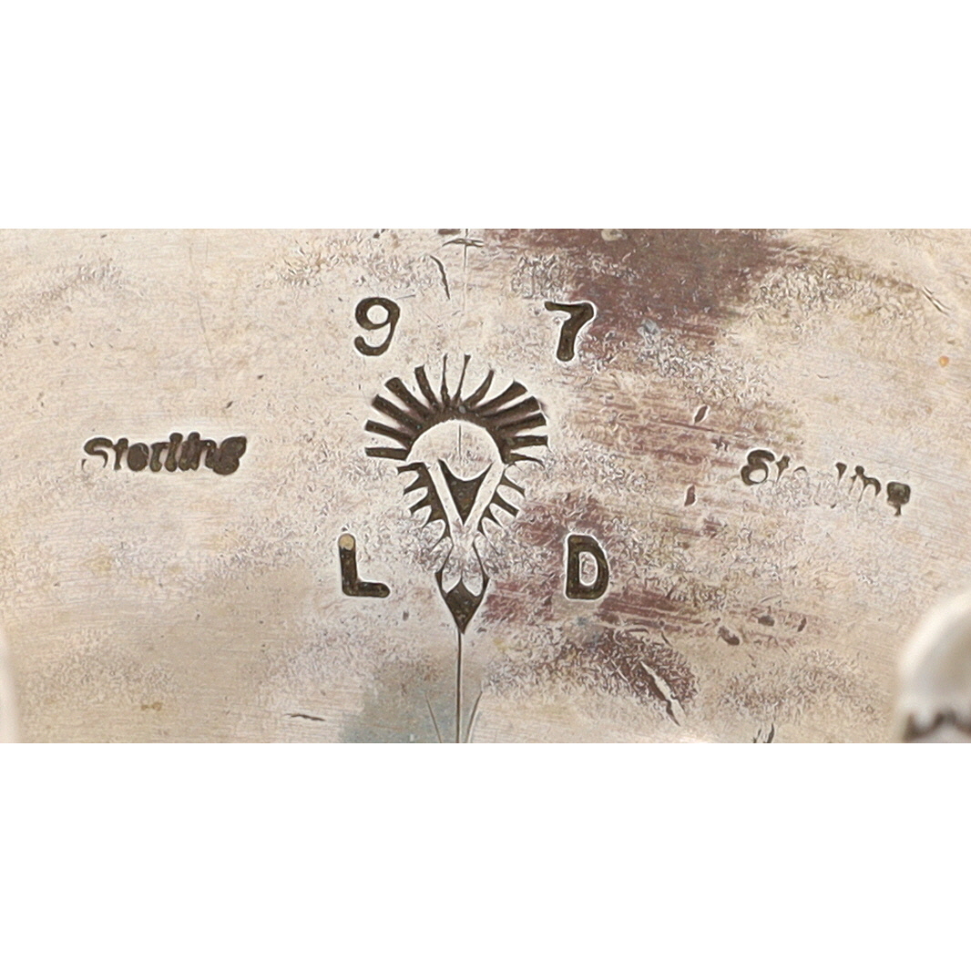 Vintage 1997 Lowell Draper sterling cuff bracelet with overlaid chevron patterns, marked on the inside with “97”, a stylized symbol, “L D”, and “Sterling”, measuring approximately 6 inches in circumference, and weighing 50.5g