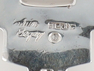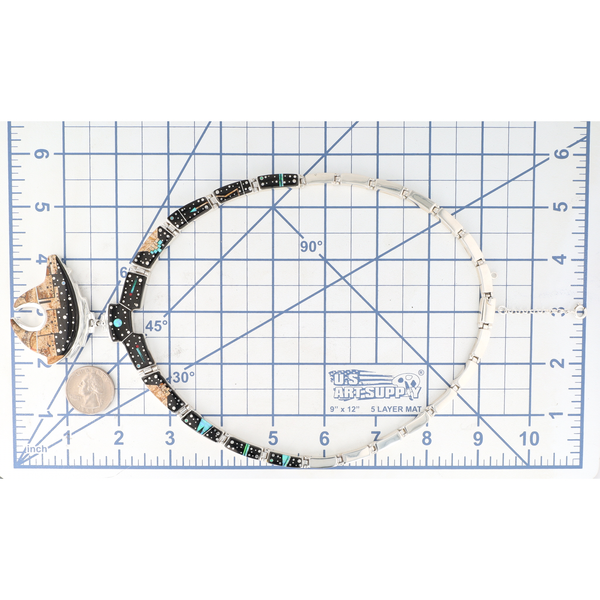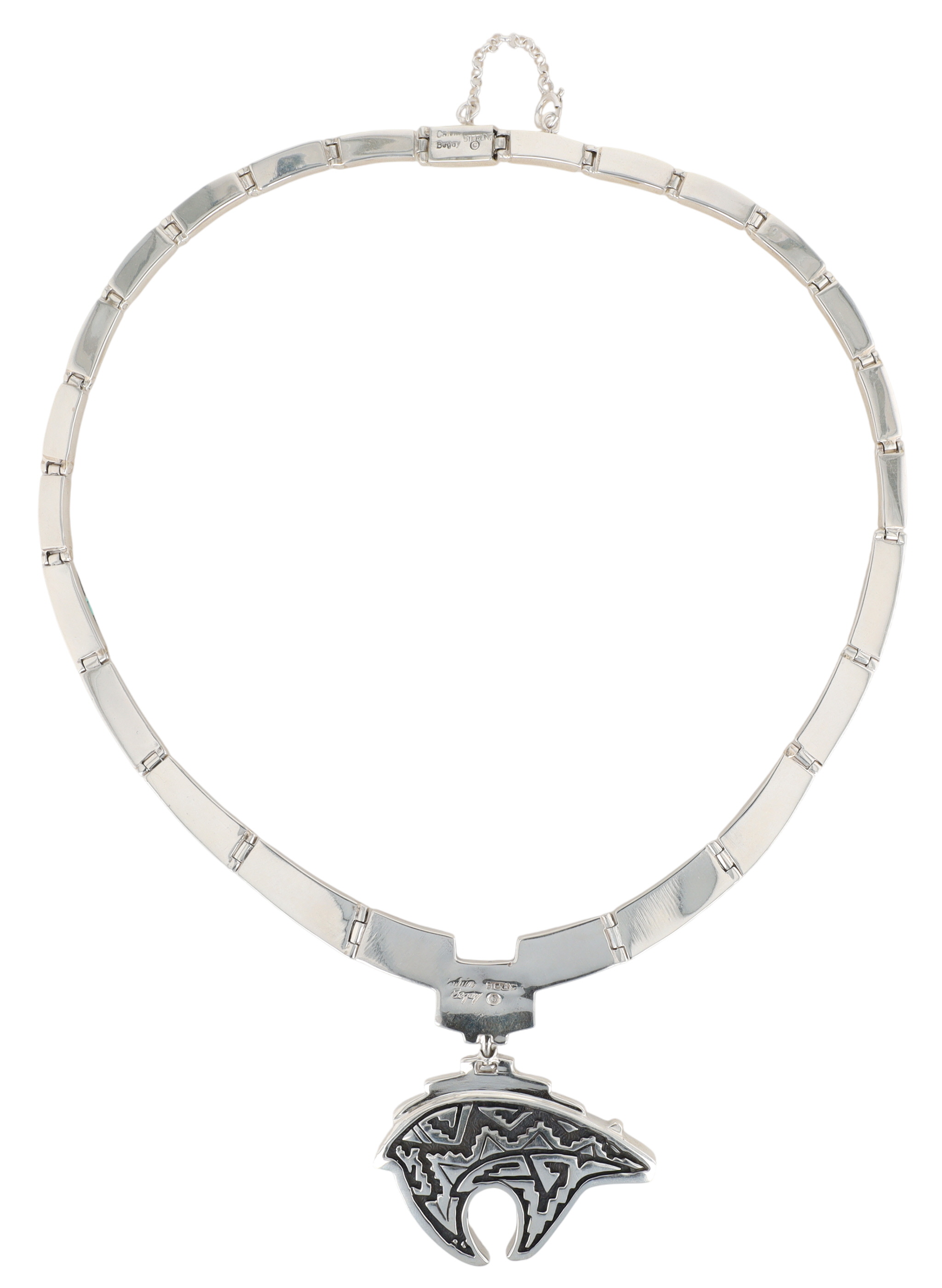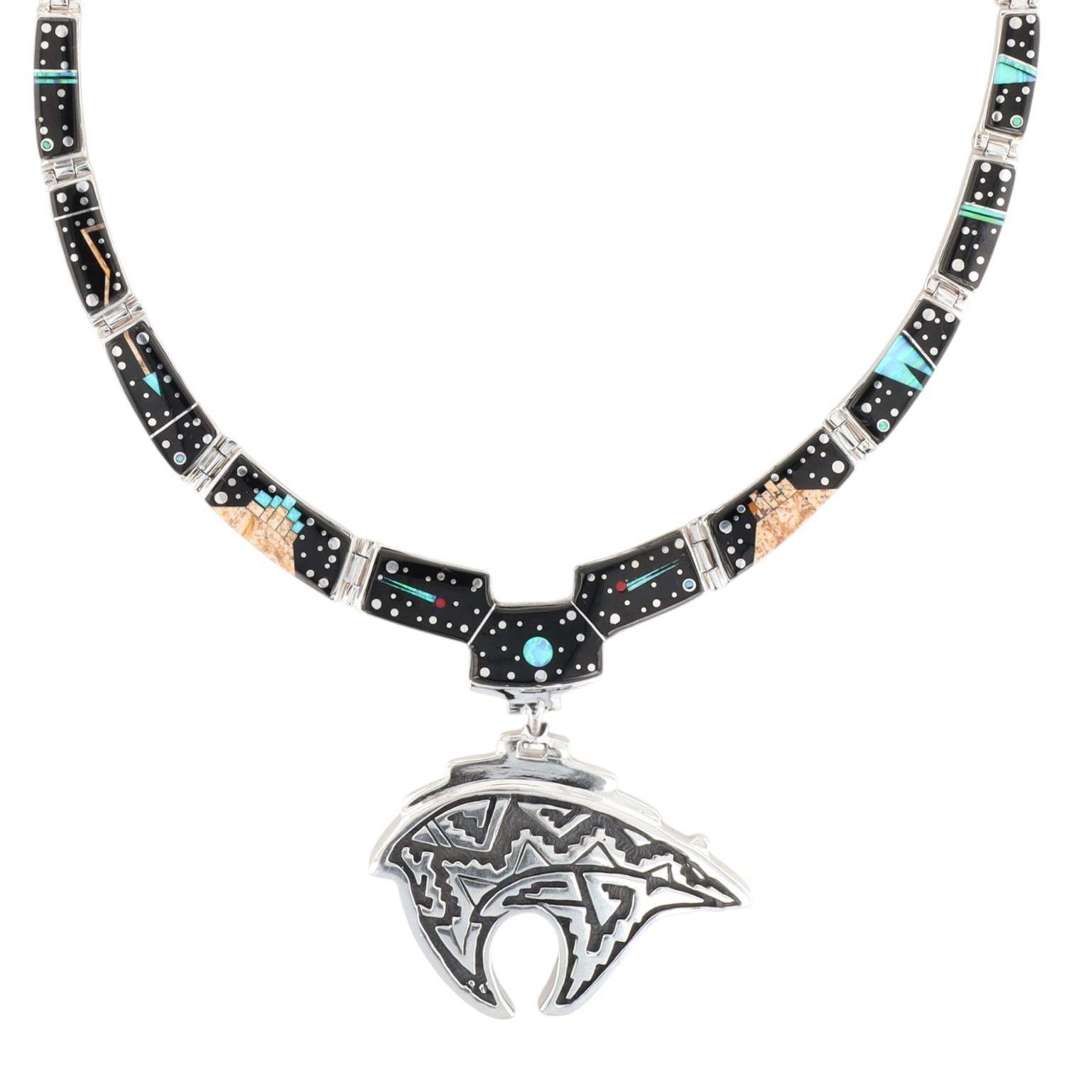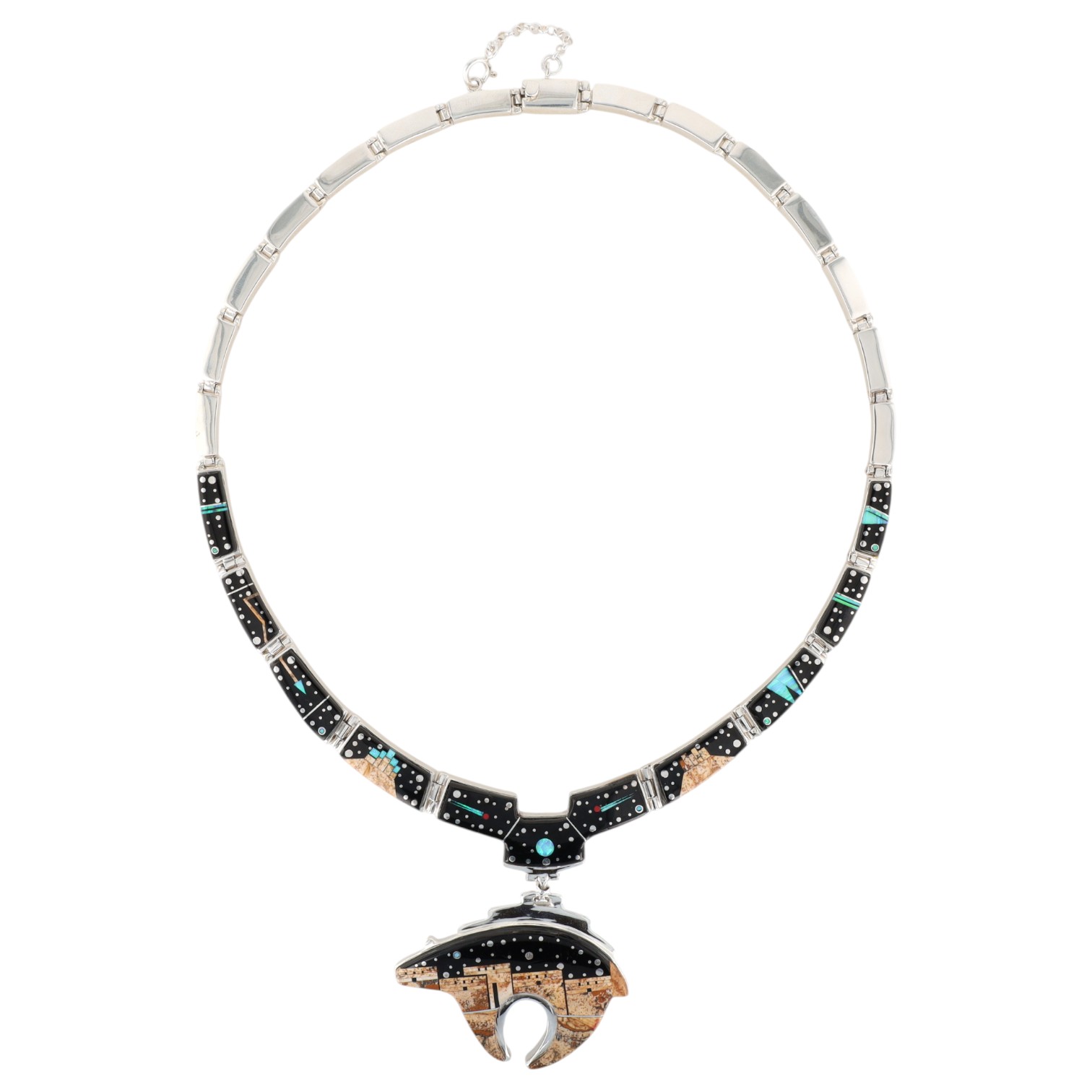 A sterling silver necklace with a bear pendant, featuring jet/onyx, picture jasper, opal, and coral mosaic inlay, measuring approximately 9 inches across, weighing 91g, and marked ‘Calvin Begay’, ‘STERLING’, and a copyright symbol on the reverse.