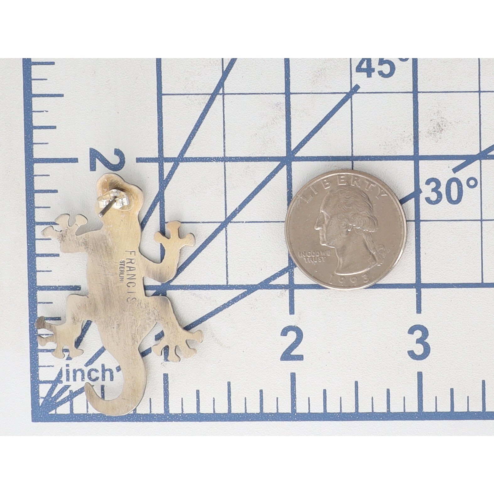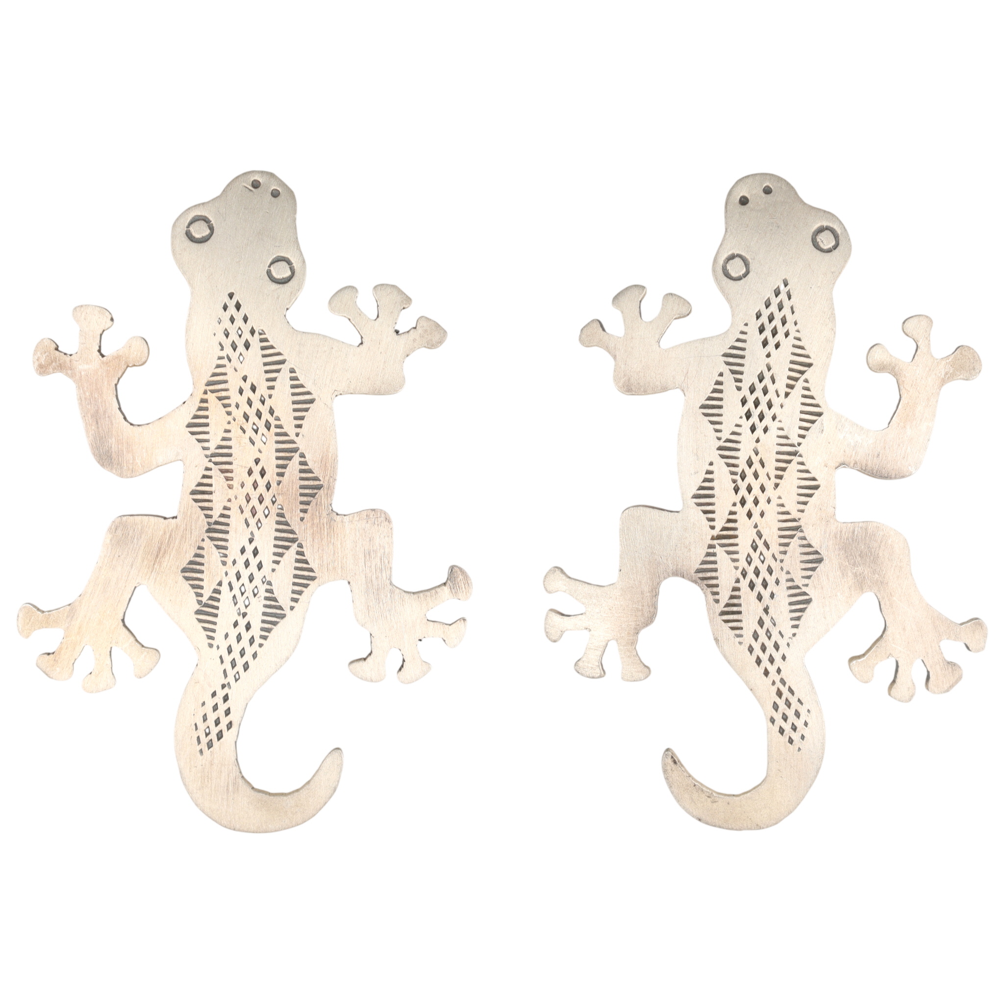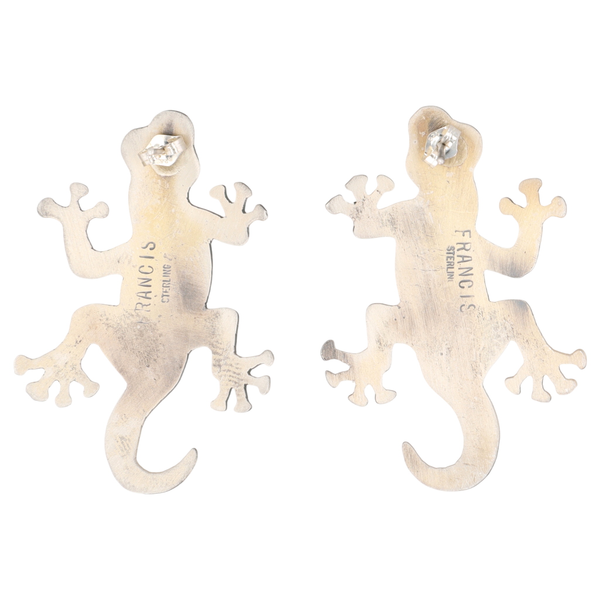 A pair of Melvin Francis Navajo Sterling gecko-shaped earrings, each measuring approximately 1.75 inches long and weighing 8.5g.